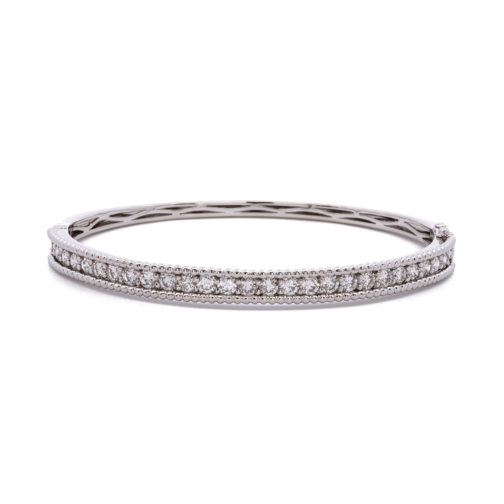 14K White Gold Diamond Bangle Bracelet With Beaded Edge. Twenty-Seven Round Diamonds Weigh A Total Of 2.85 Carats And Have G-H Color, SI1 Clarity.