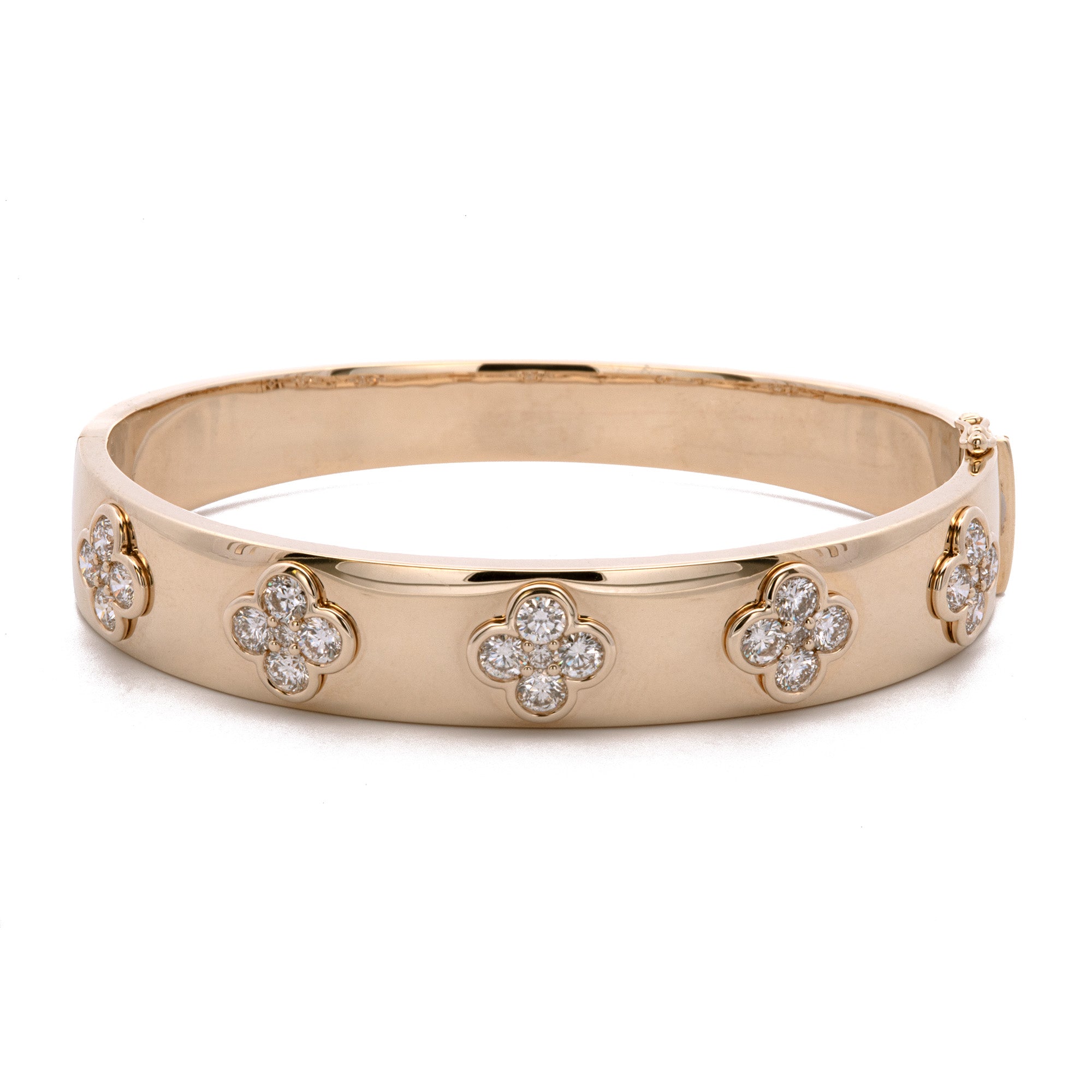 14K Yellow Gold Diamond Flower Motif Bangle Bracelet