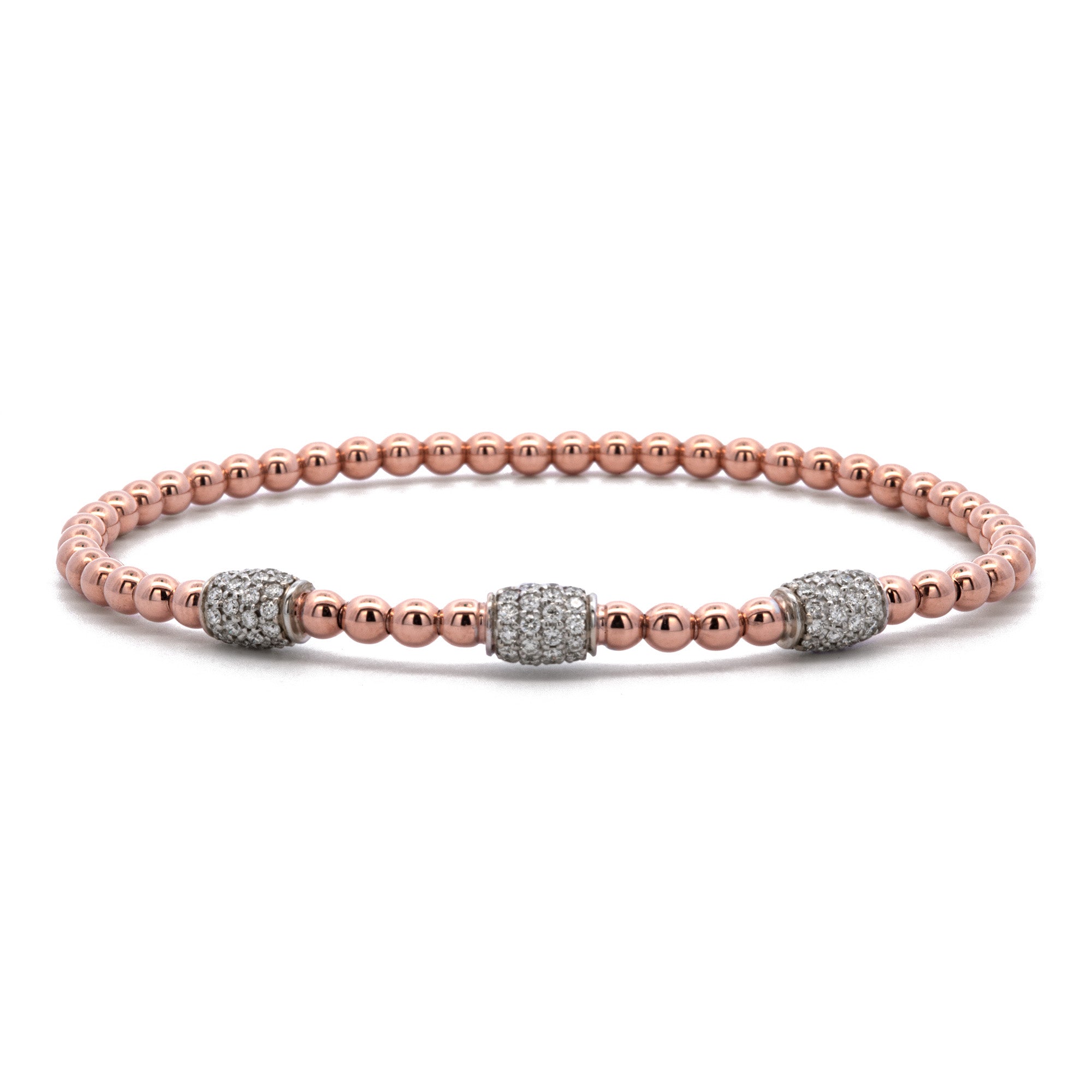 18K Rose Gold Stretchy Bracelet With Three Pave Diamond Stations. One Hundred Twenty Diamonds Weigh A Total Of 0.90 Carats And Have F-G Color, VS2 Clarity.