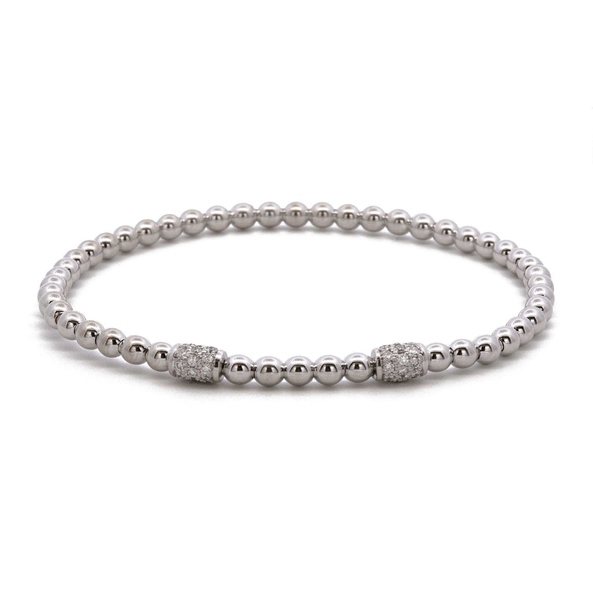 18K White Gold Flexible Bead Bracelet With Two Pave Diamond Stations