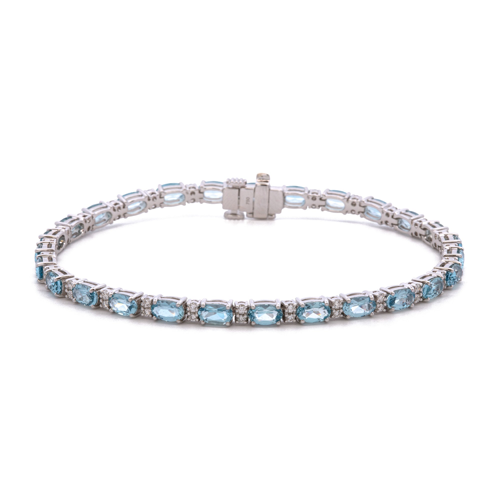 18K White Gold Oval Aquamarine And Diamond Bracelet. Twenty-Seven Diamonds Weigh A Total Of 4.93 Carats. Fifty-Four Diamonds Weigh A Total Of 0.41 Carats And Have G-H Color, VS2-SI1 Clarity.