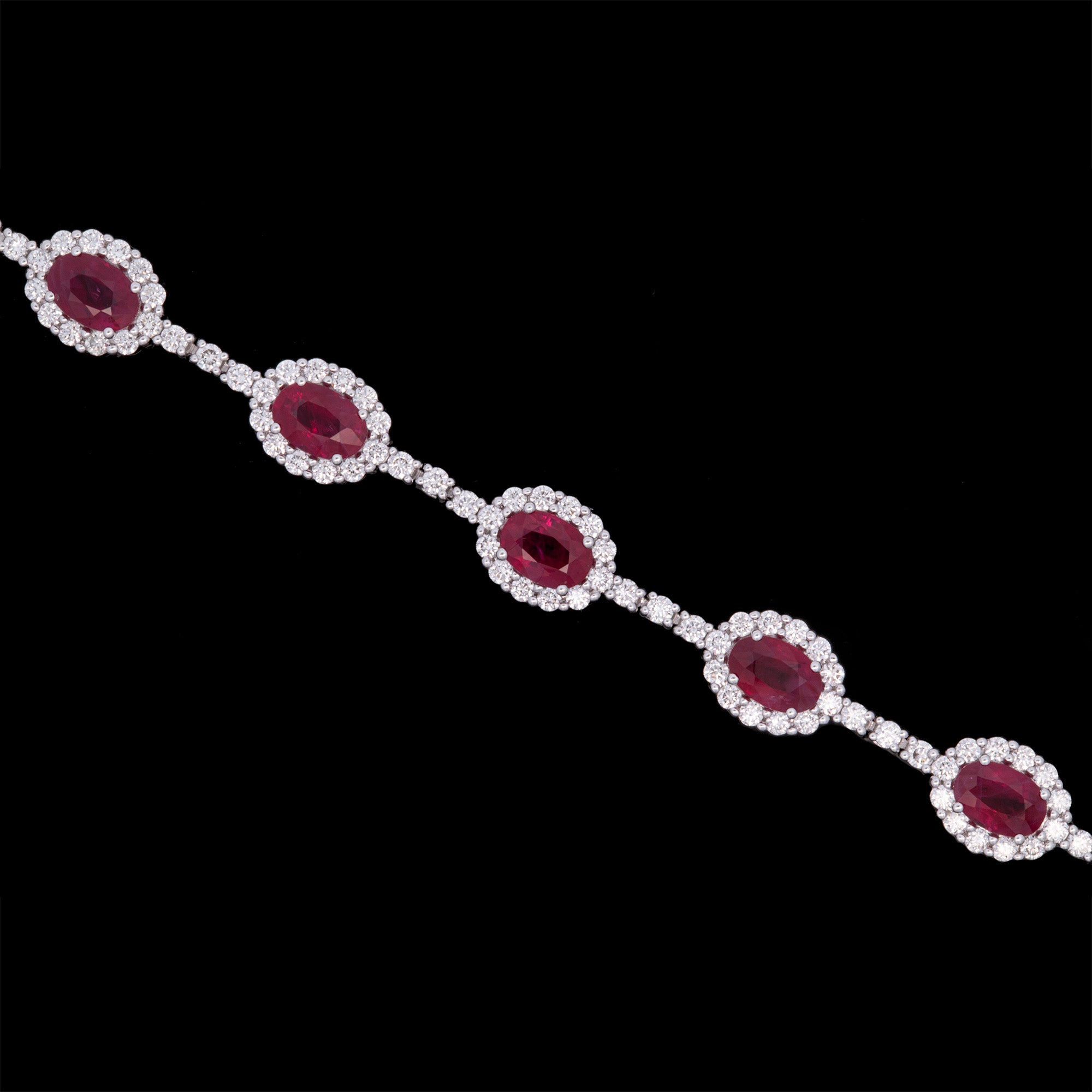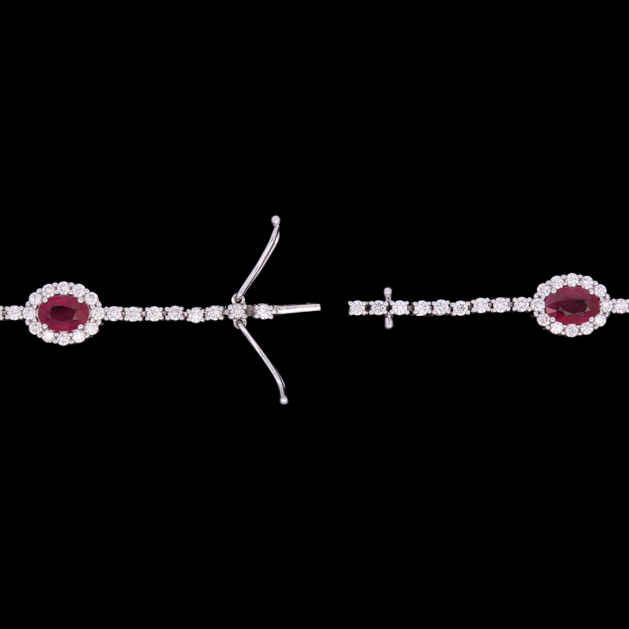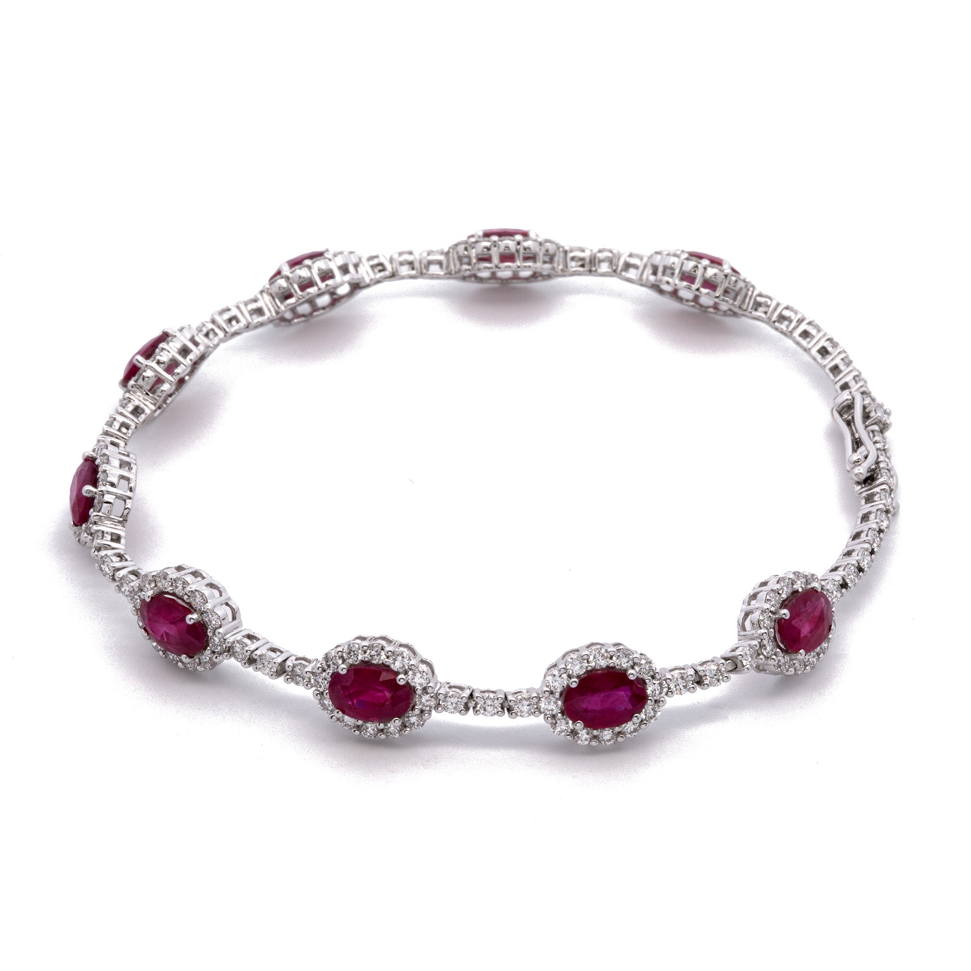 18K White Gold Oval Ruby And Diamond Bracelet. Nine Rubies Weigh A Total Of 6.58 Carats. One Hundred Forty-Nine Round Diamonds Weigh A Total Of 2.48 Carats And Have G-H Color, VS2 Clarity.