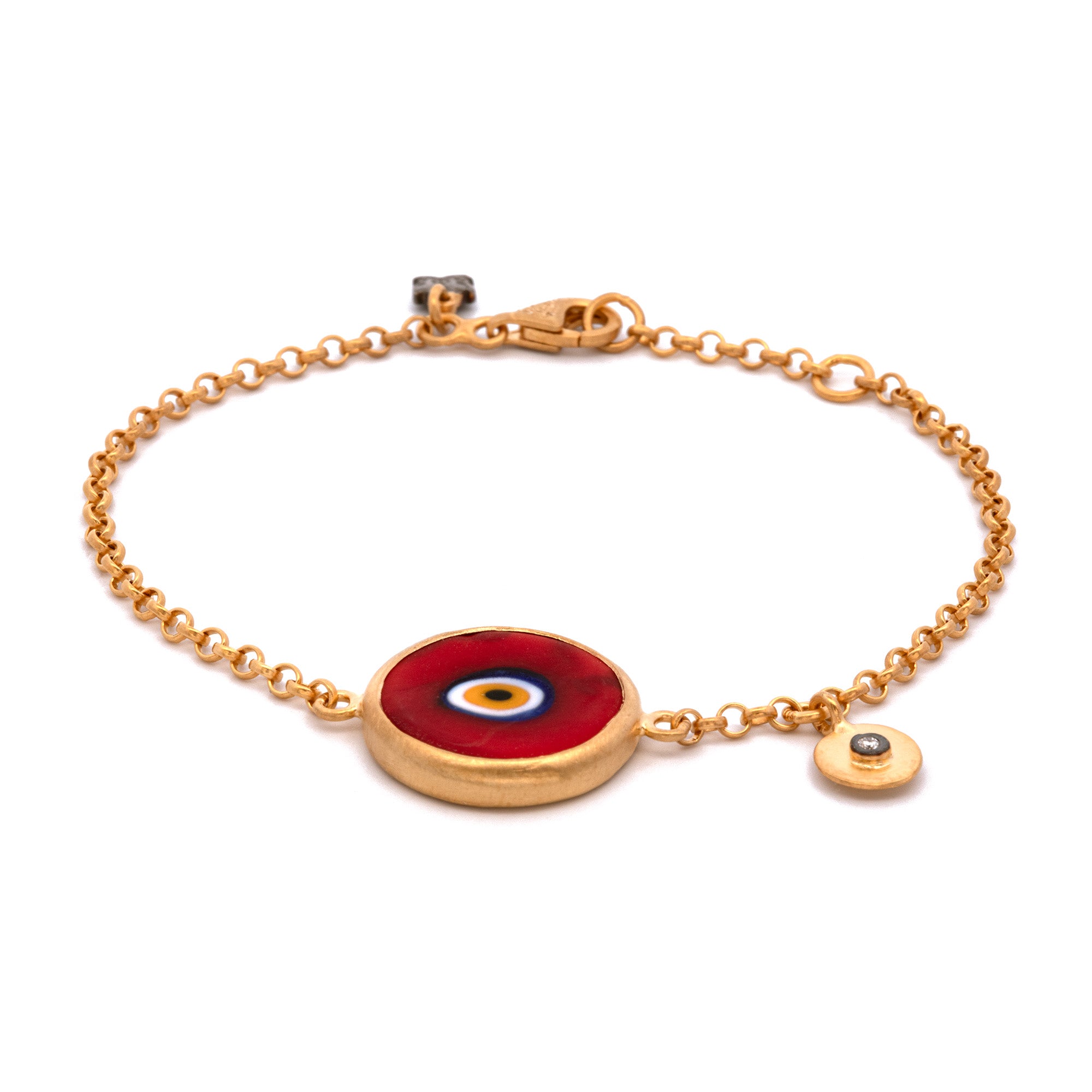 24K Yellow Gold And Sterling Silver Red Evil Eye Bracelet With Diamond Accent. Hand Made In Turkey.
