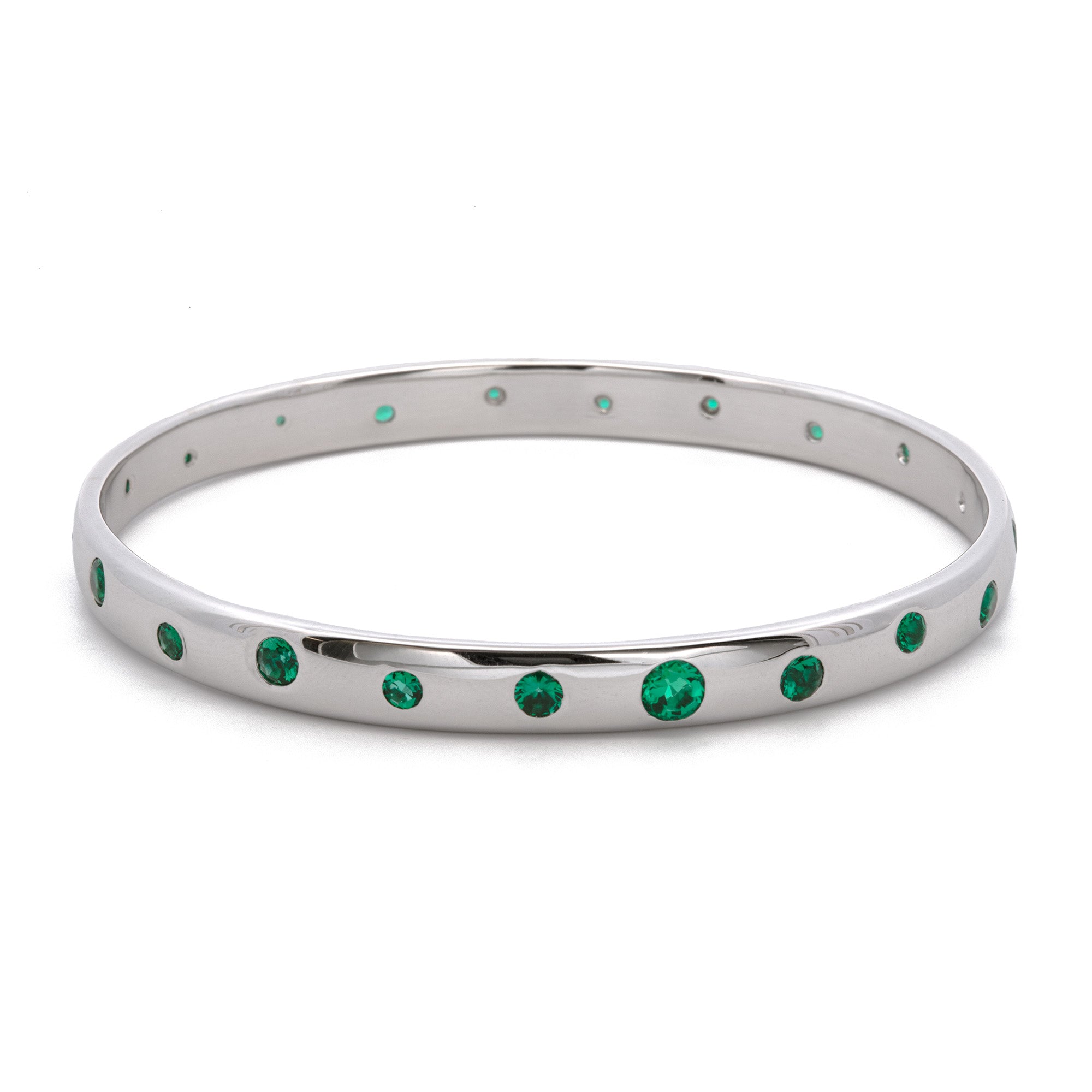 Custom 14K White Gold Sold Bangle Bracelet With Flush Set Emerald