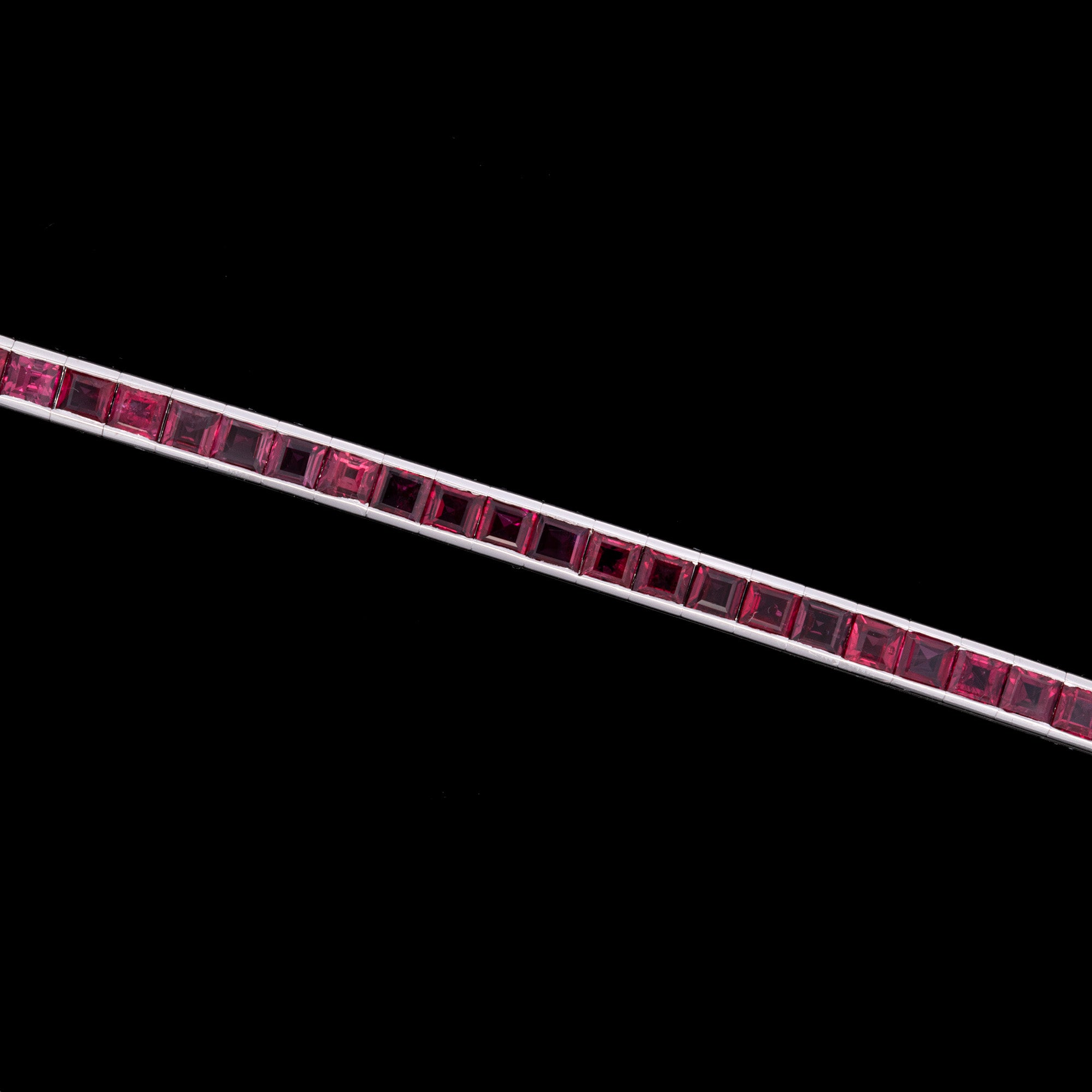 Platinum Square Cut Ruby Line Bracelet. Fifty-Six Rubies Weigh A Total Of 17.00 Carats.