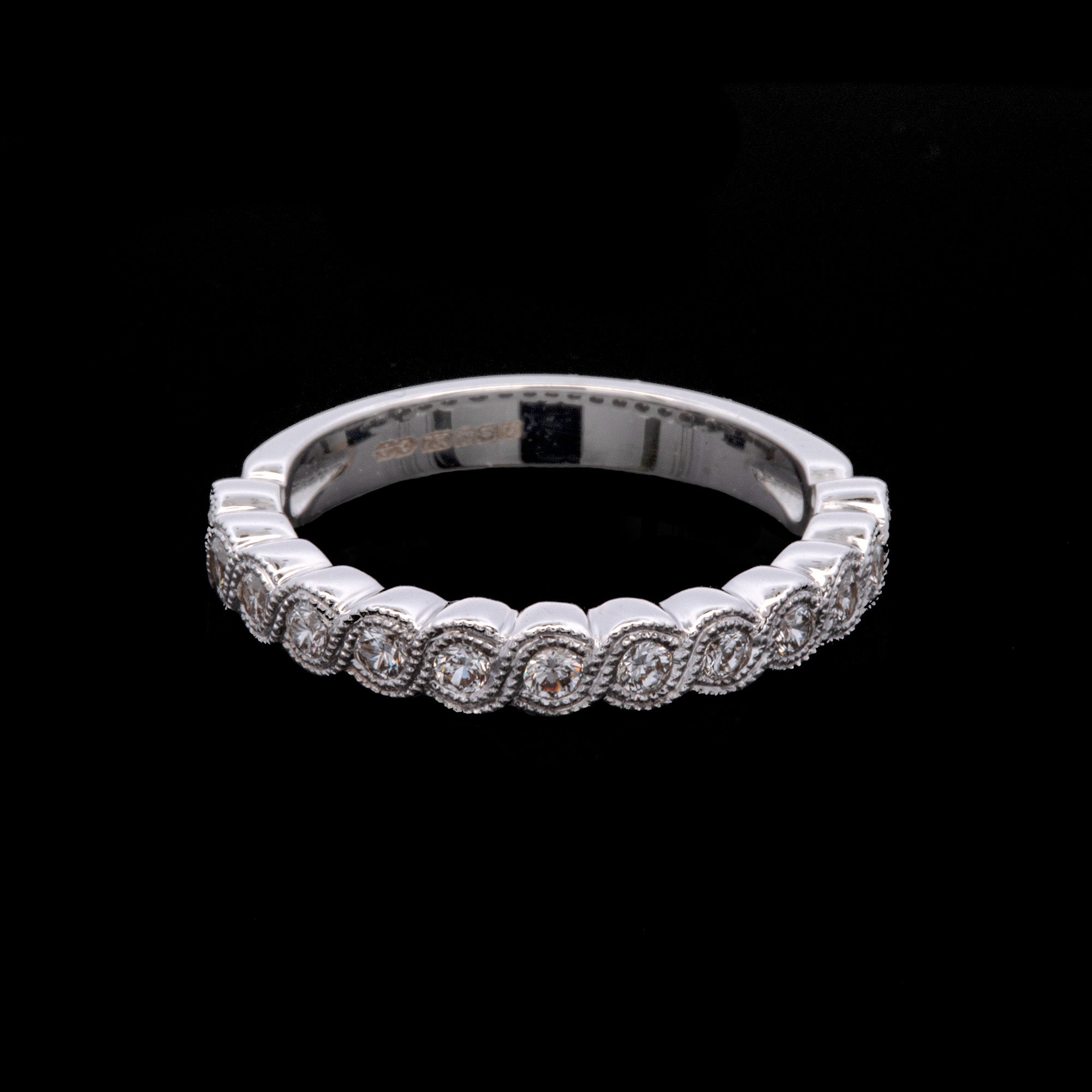 18K White Gold Bezel Set Diamond Half Eternity Band With Double Milgrain Edge. Diamonds Weigh A Total Of 0.39 Carats And Have F Color, VS-SI Clarity. Sizing Available.
