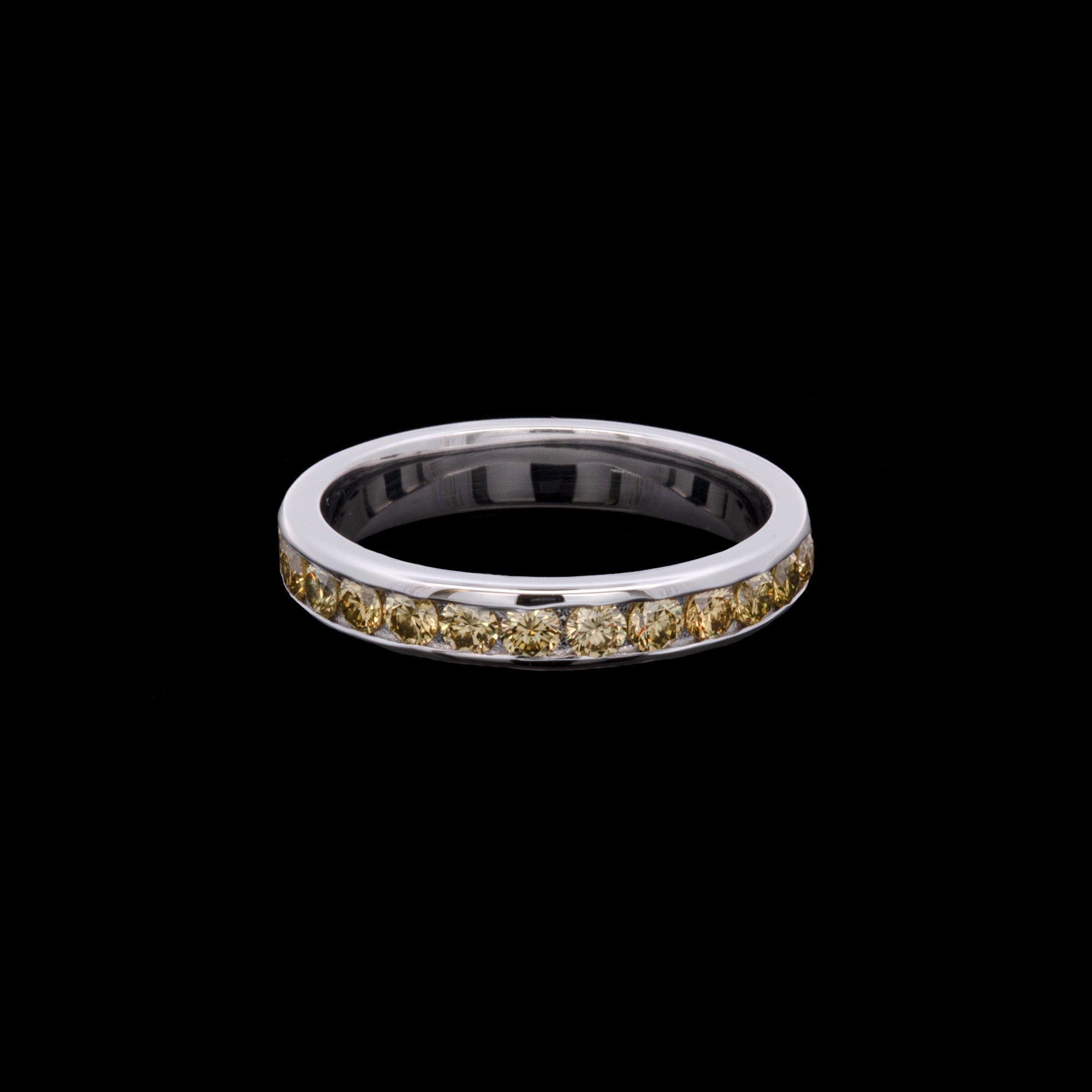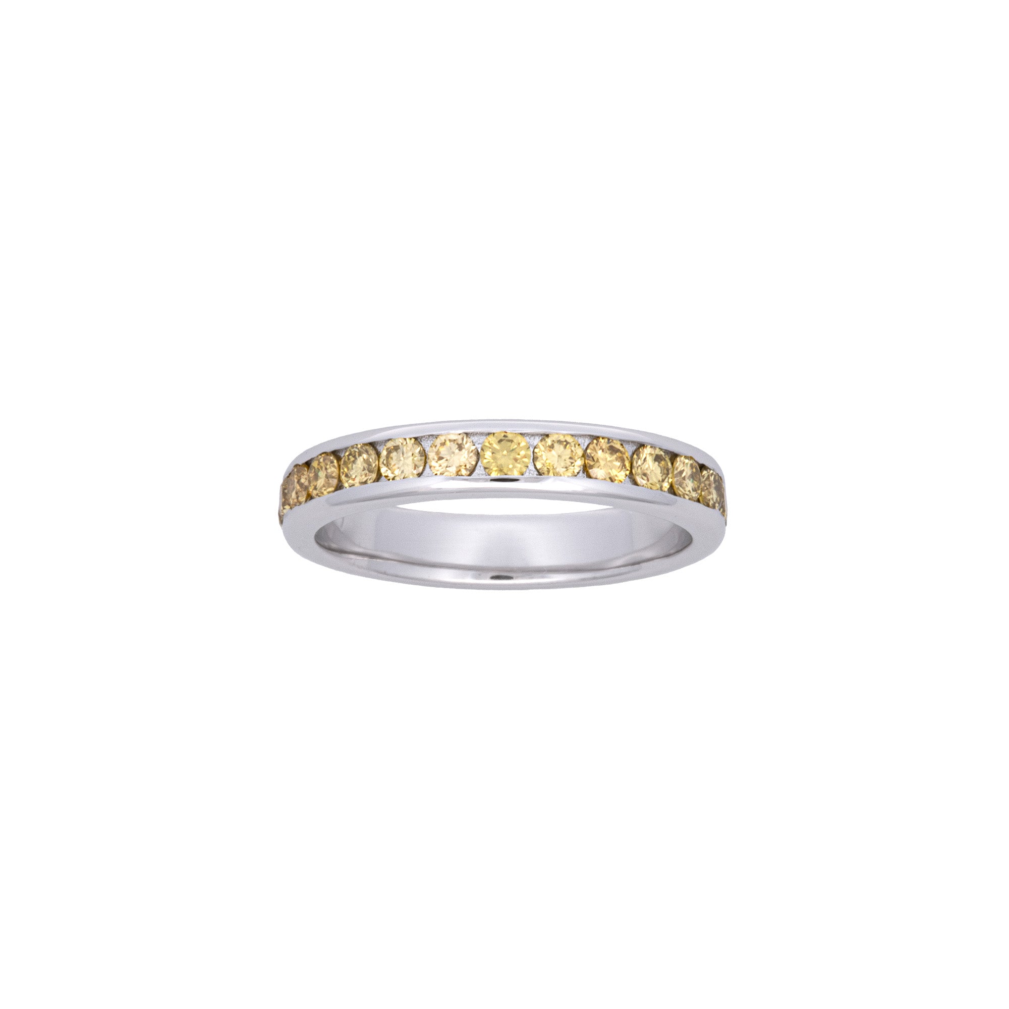Custom 14K White Gold Channel Set Fancy Intense Yellow Diamond Eternity Band. Twenty-Six Diamonds Weigh A Total Of 1.50 Carats.
