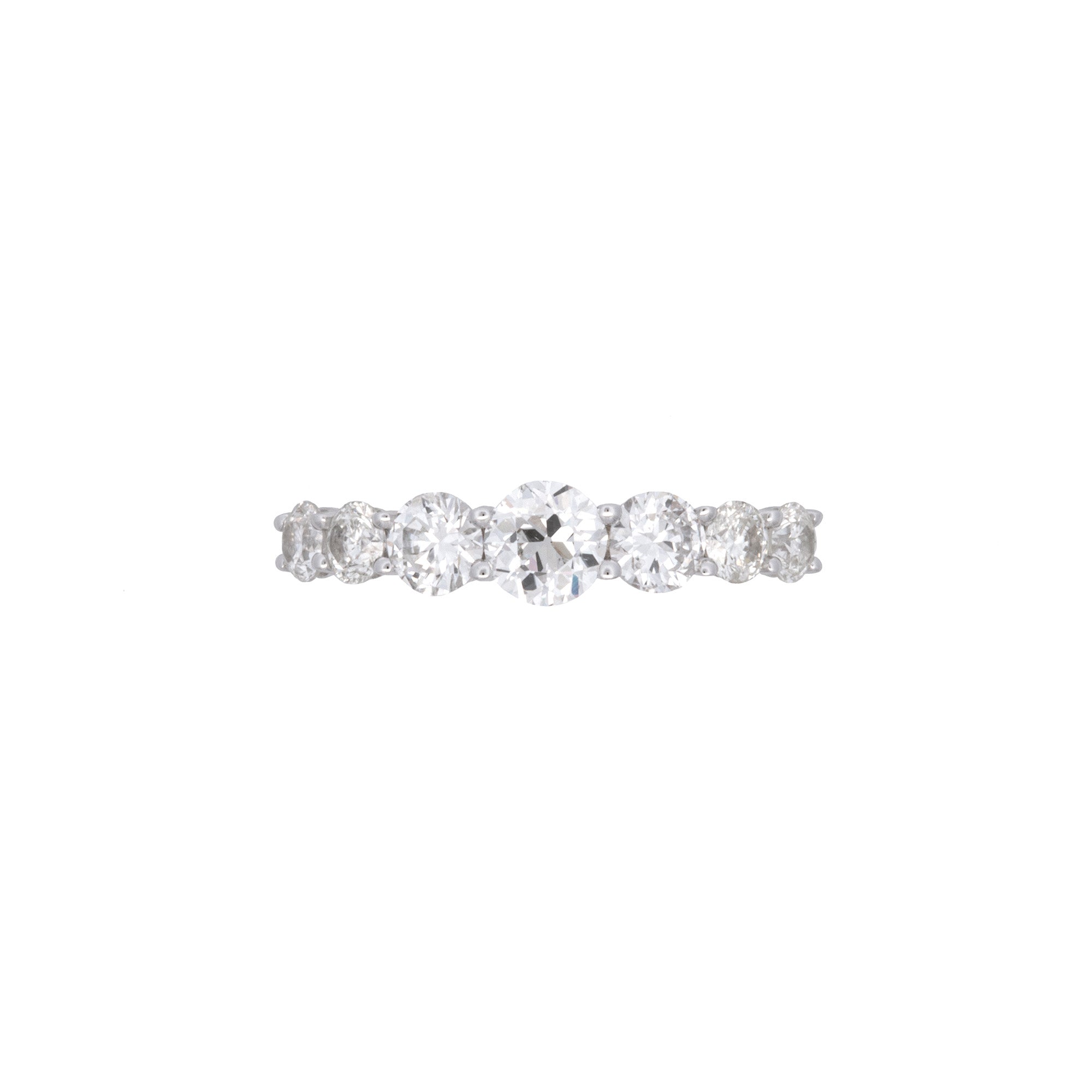 Custom 18K White Gold Graduating Seven Diamond Ring. Center Old Mine Cut Diamond Weighs 0.45 Carats And Has H-I Color, VS2 Clarity Carats. Six Accent Diamonds Weigh A Total Of 1.02 Carats And Have H-K Color, VS2-SI2 Clarity.