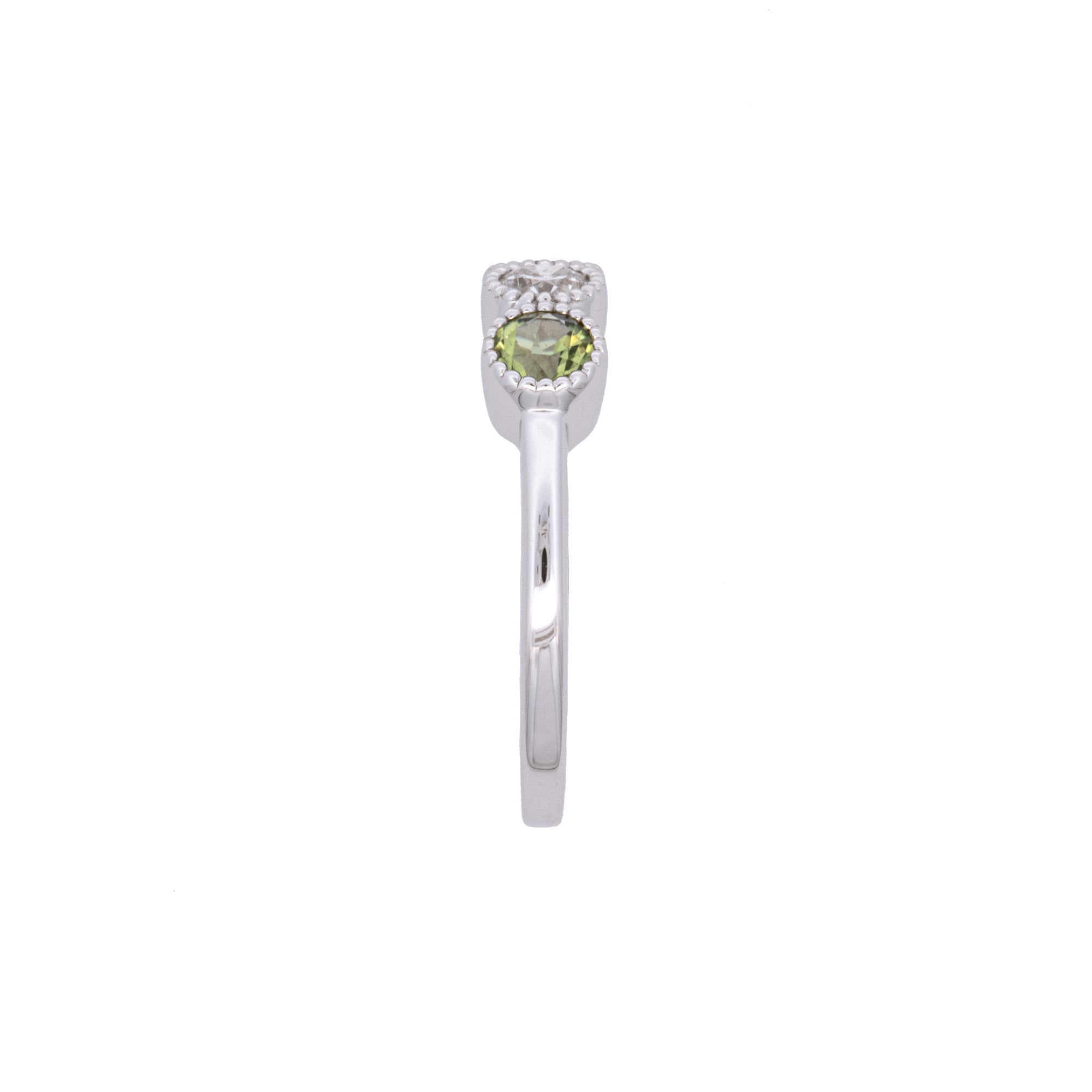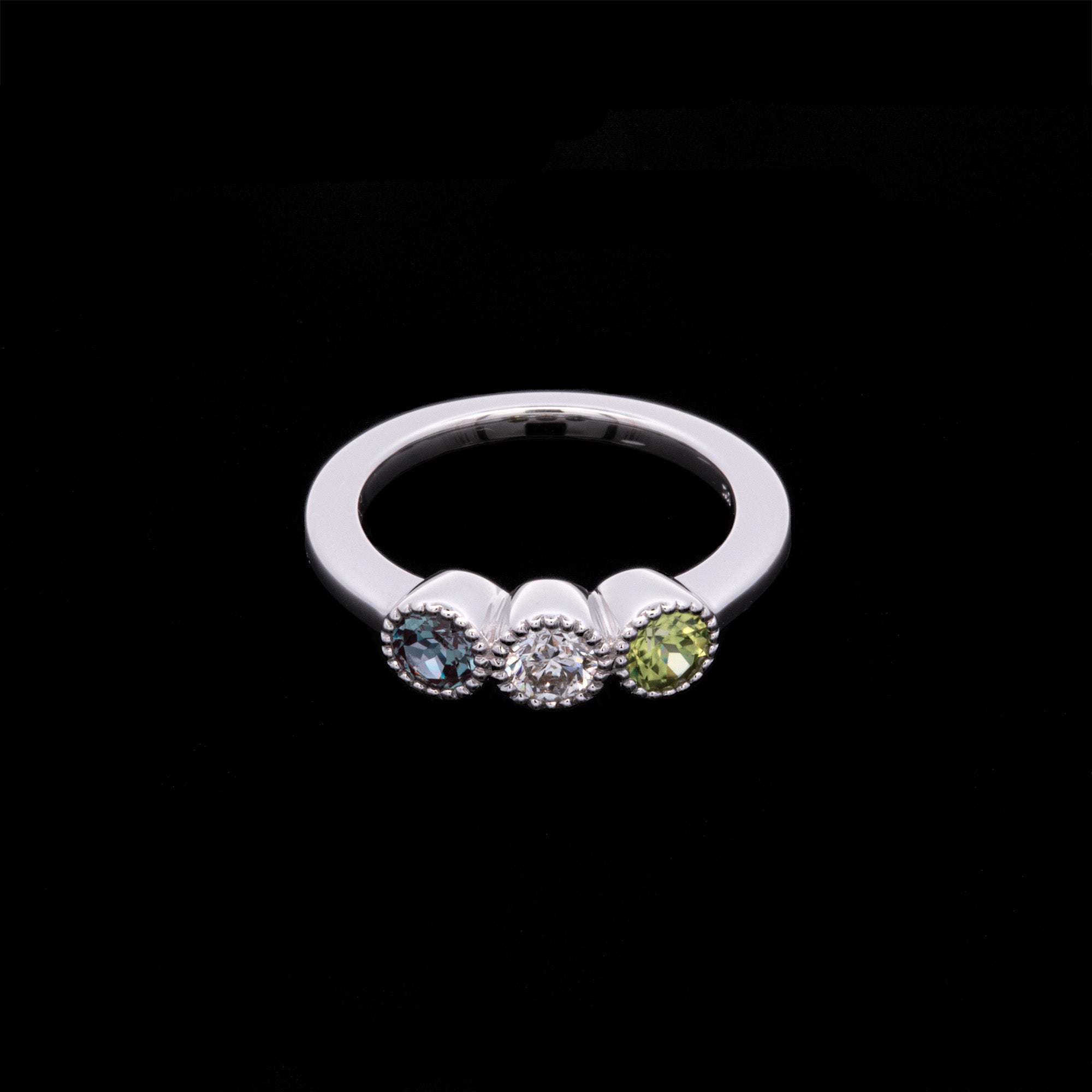 Custom 14K White Gold Bezel Set Alexandrite, Diamond, And Peridot Mother's Birthstone Ring