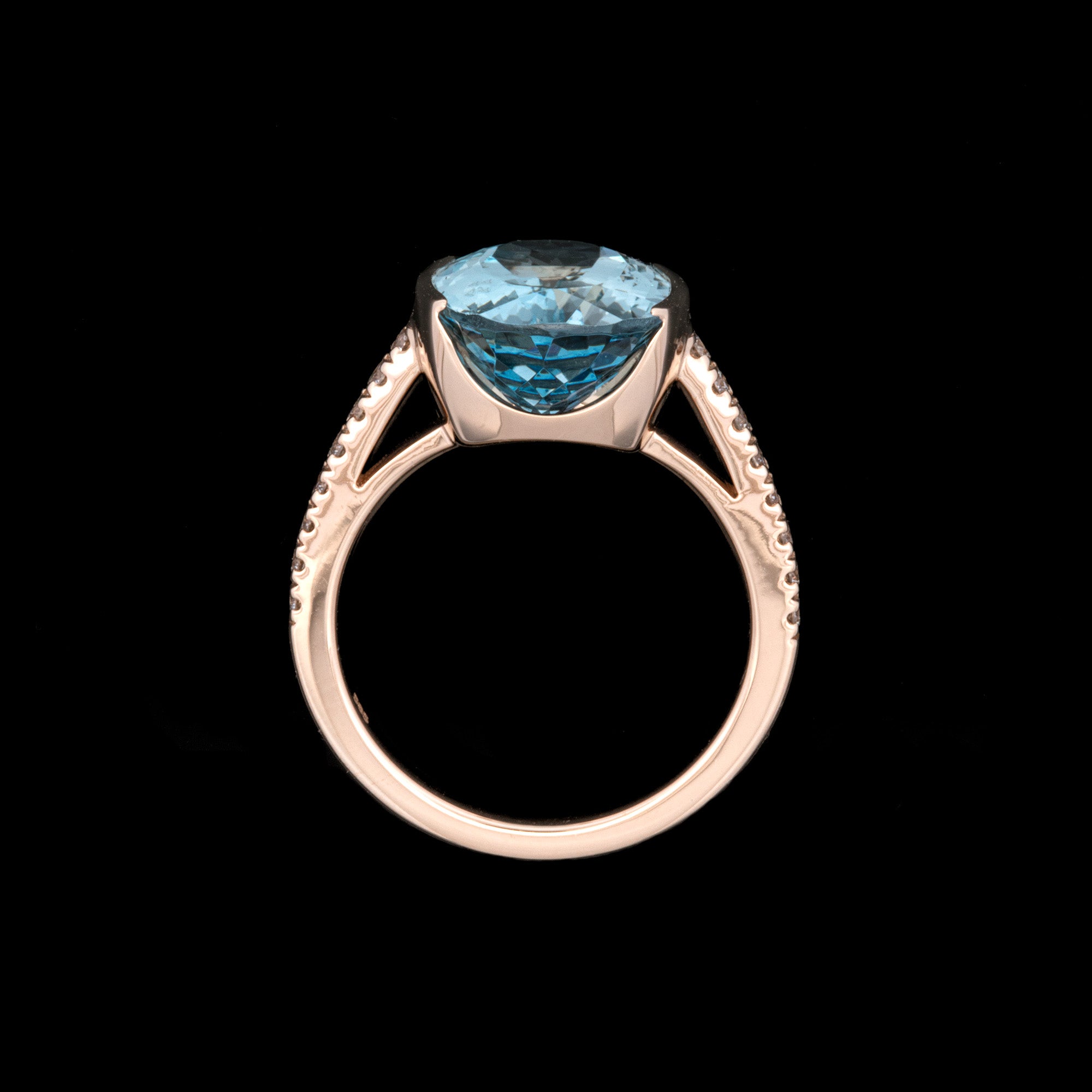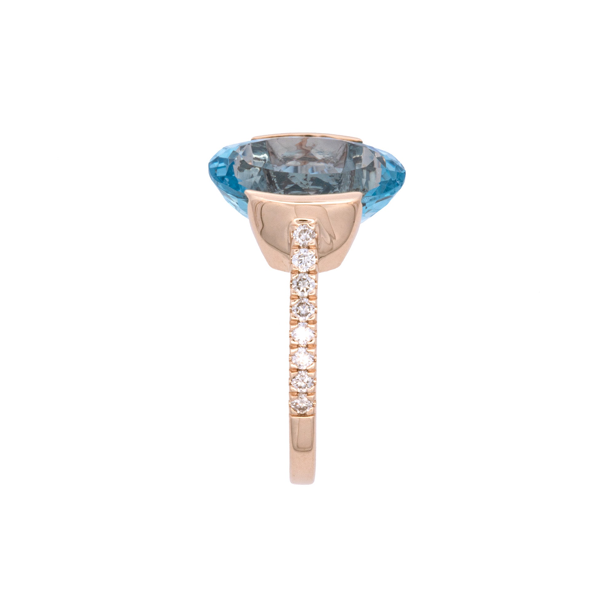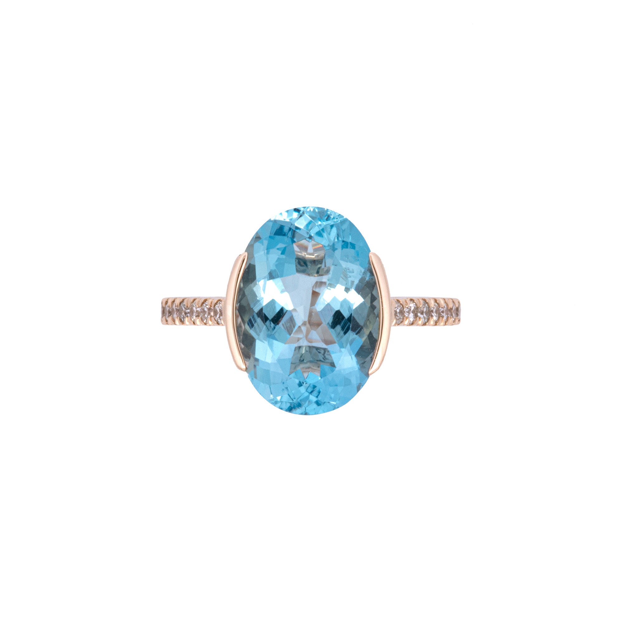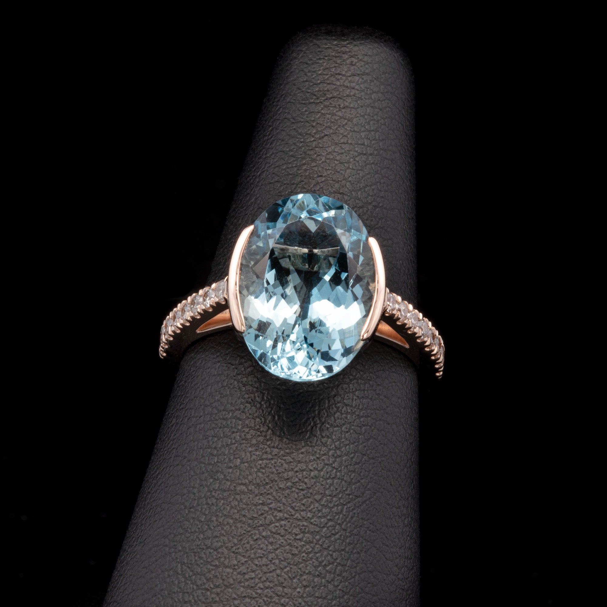 Custom 14K Yellow Gold Half Bezel Set Oval Aquamarine Ring With Diamond Accents. Aquamarine Weighs 5.36 Carats. Diamonds Measure 1.6mm.