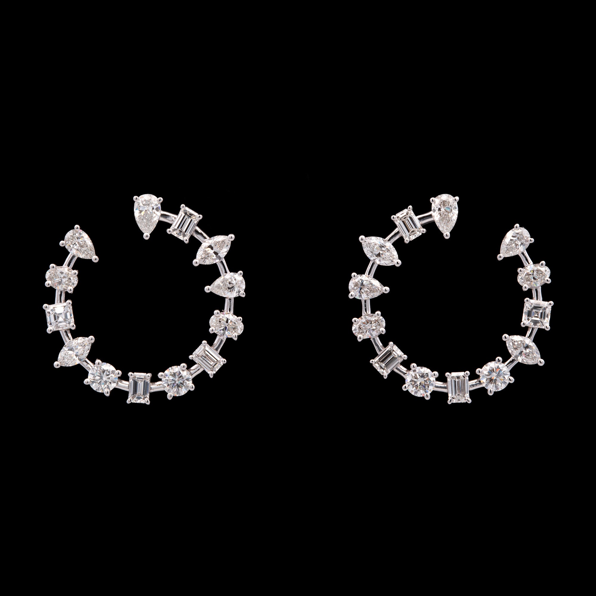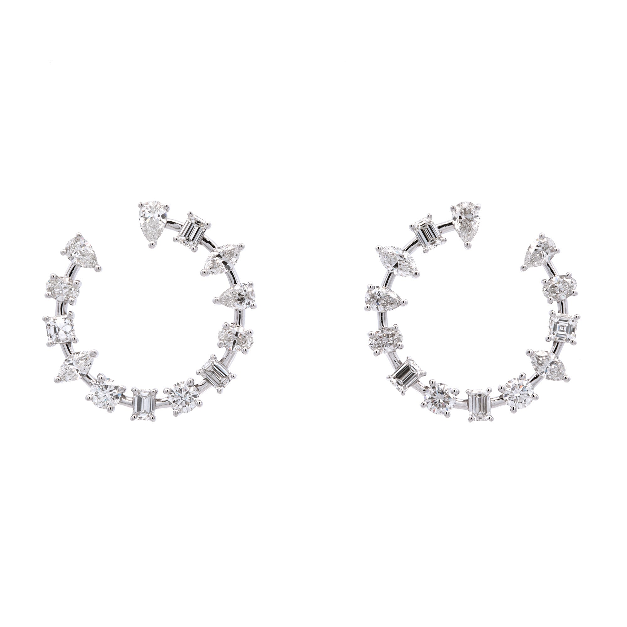 Custom 18K White Gold 4.32ctw Mixed Cut Diamond Hoop Earrings. Two Larger Pear Cut Diamonds Weigh A total Of 0.41 Carts. Four Smaller Pear Cut Diamonds Weigh A Total Of 0.64 Carats. Two Asscher Cut Diamonds Weigh A Total Of 0.38 Carats. Four Marquise Cut Diamonds Weigh A Total Of 0.64 Carats. Four Round Diamonds Weigh A Total Of 0.81 Carats. Six Emerald Cut Diamonds Weigh A Total Of 0.84 Carats. Four Oval Diamonds Weigh A Total Of 0.6+0 Carats. All Diamonds Have G-H Color, VS1 Clarity.