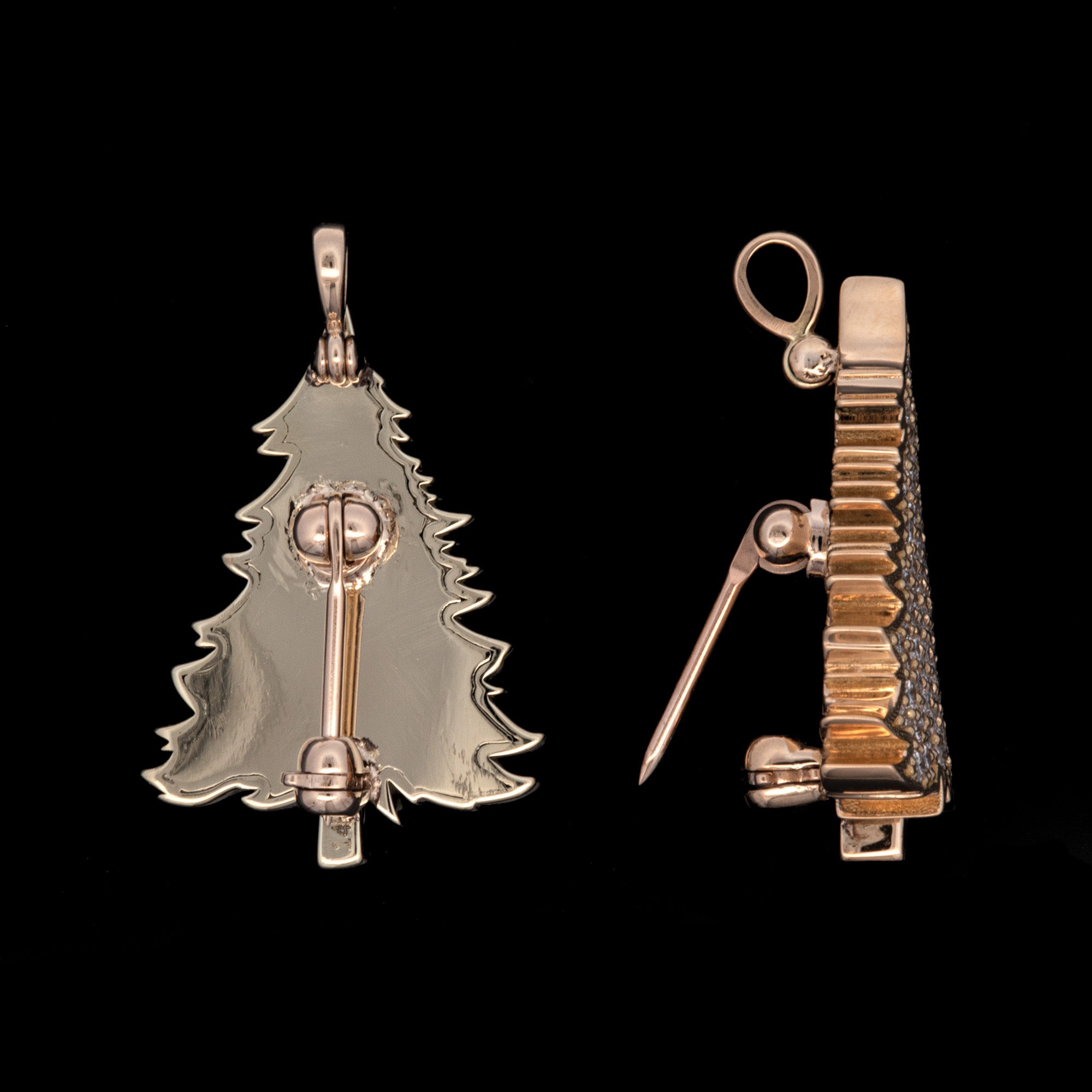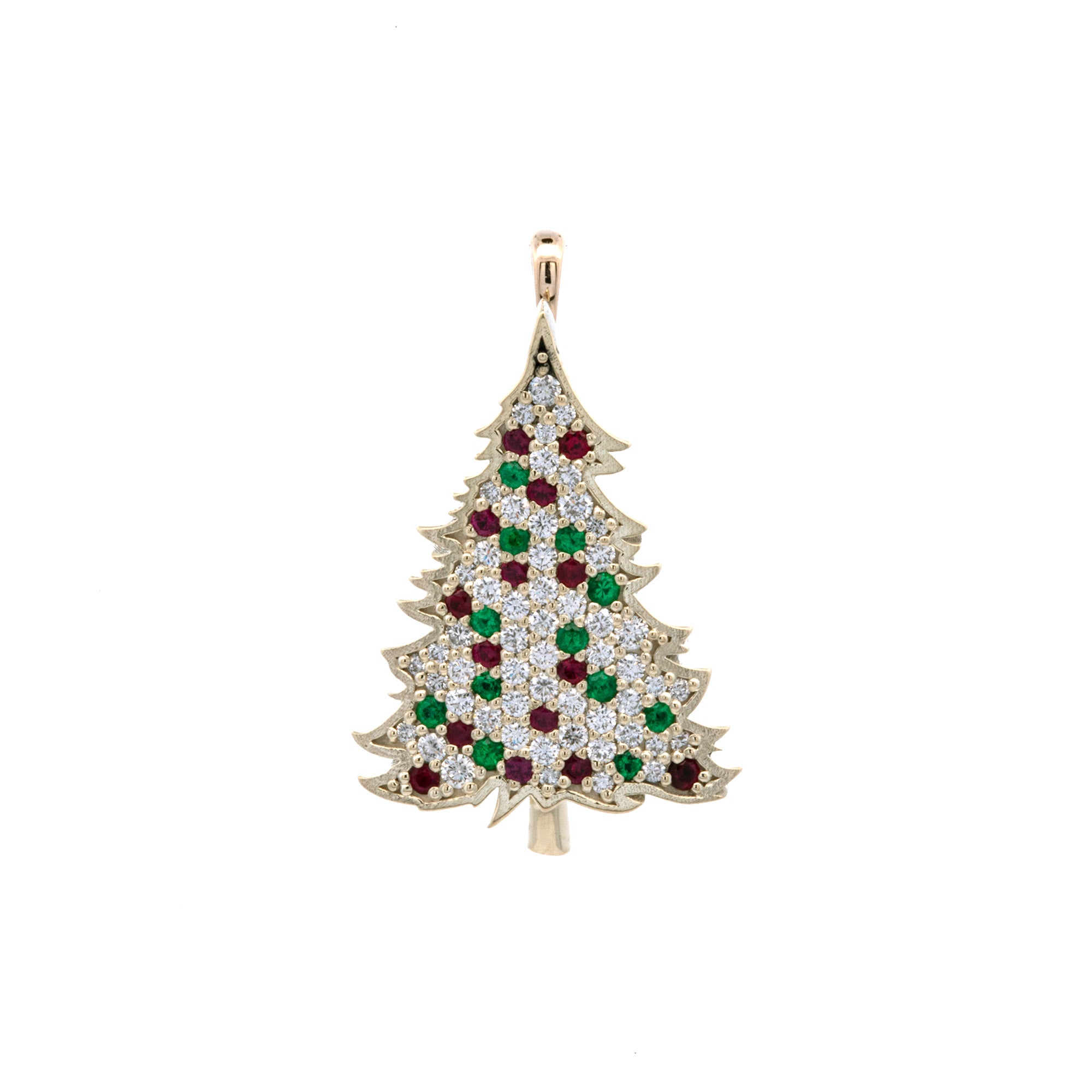 Custom 14K Green Gold Emerald, Ruby And Diamond Christmas Tree Pin With Hinged Bail.