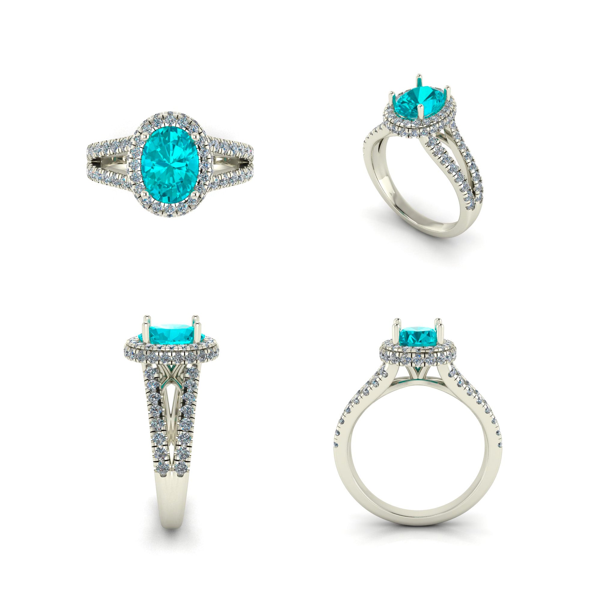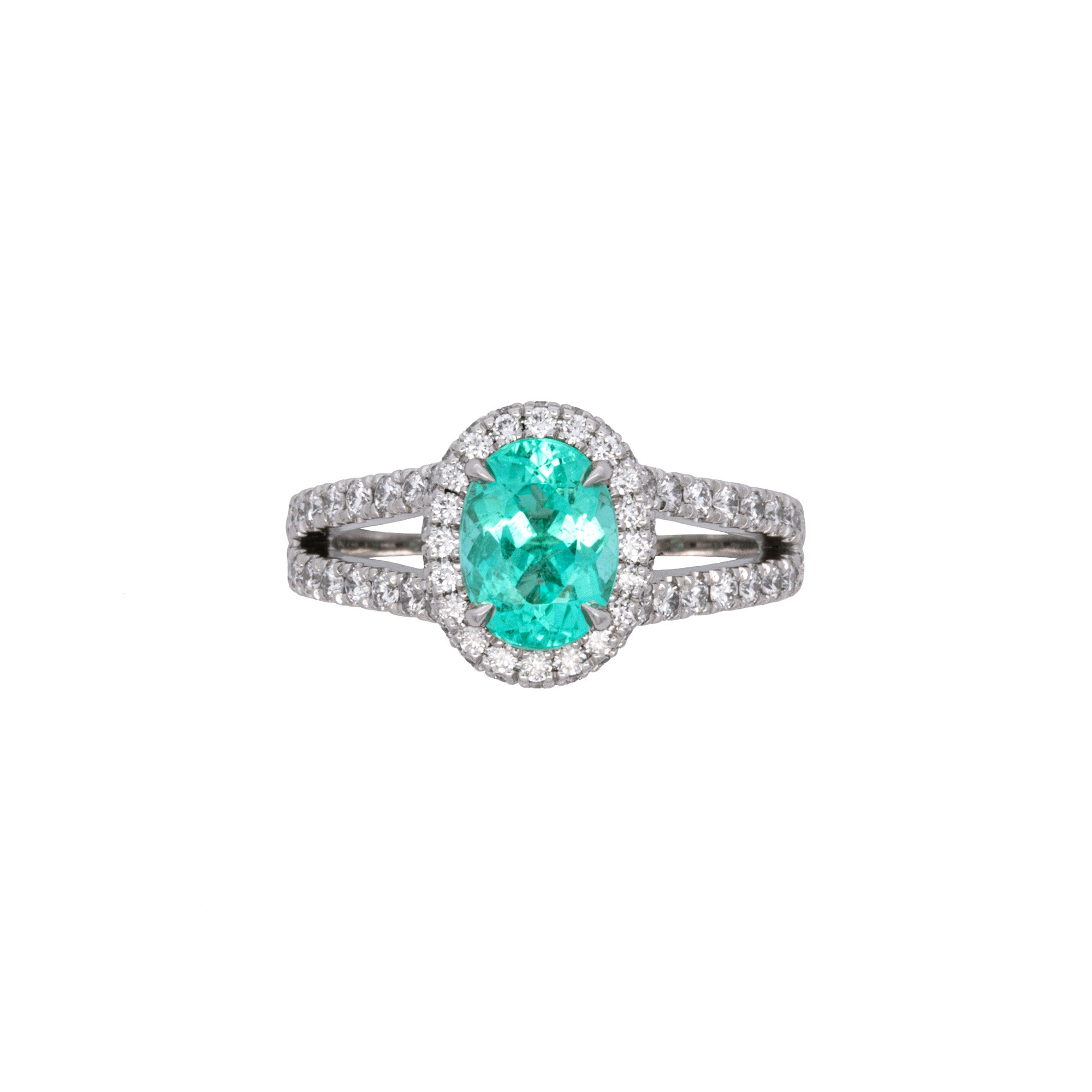 Custom Platinum Cuprian Tourmaline And Diamond Halo Ring With Diamond Split Shank