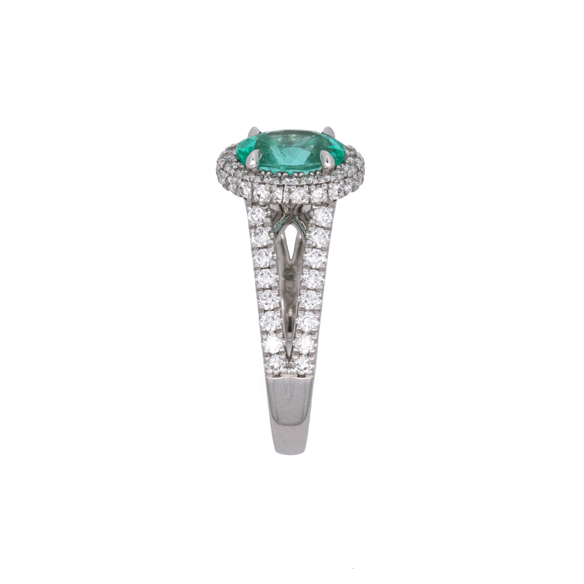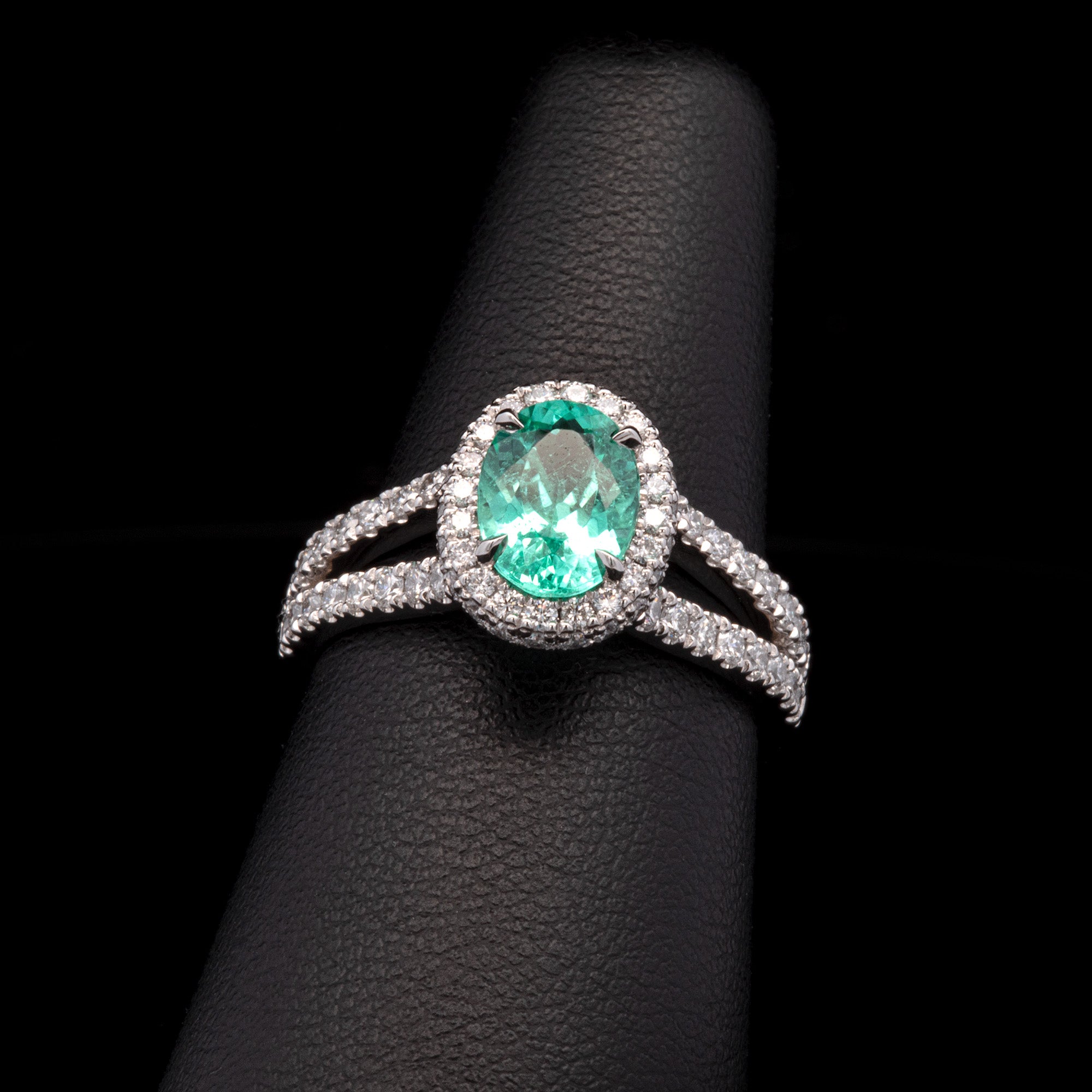 Custom Platinum Cuprian Tourmaline And Diamond Halo Ring With Diamond Split Shank. Tourmaline Weighs 1.46 Carats. Seventy-Four Round Brilliant Cut Diamond Weigh A Total Of 0.76 Carats And Have F Color, VS1 Clarity. Sizing Available.