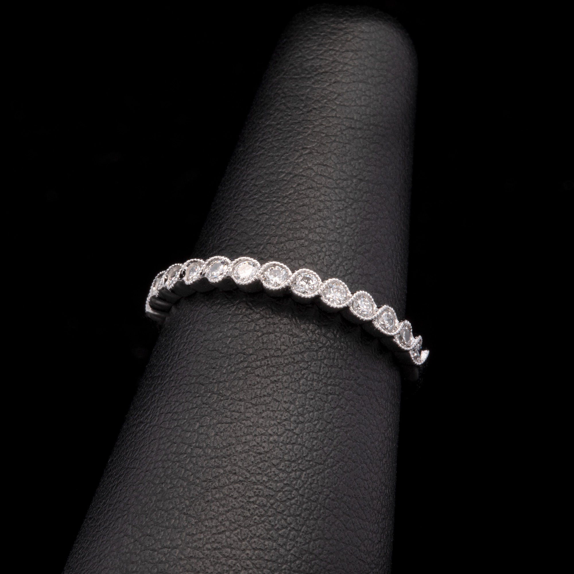 14K White Gold 0.25ctw Diamond Band With Milgain Edge. Thirteen Round Diamonds Weigh A Total Of 0.25 Carats And Have G Color, VS2 Clarity. Sizing Available.