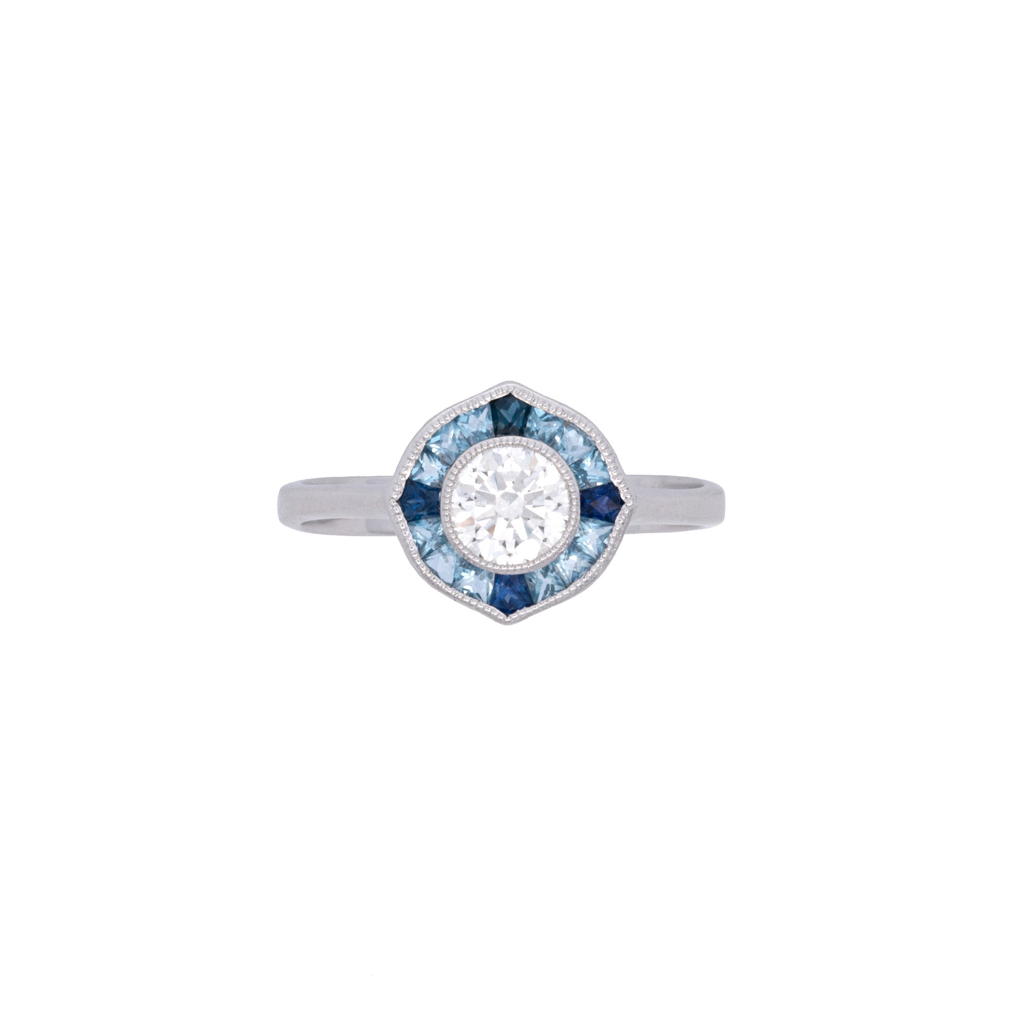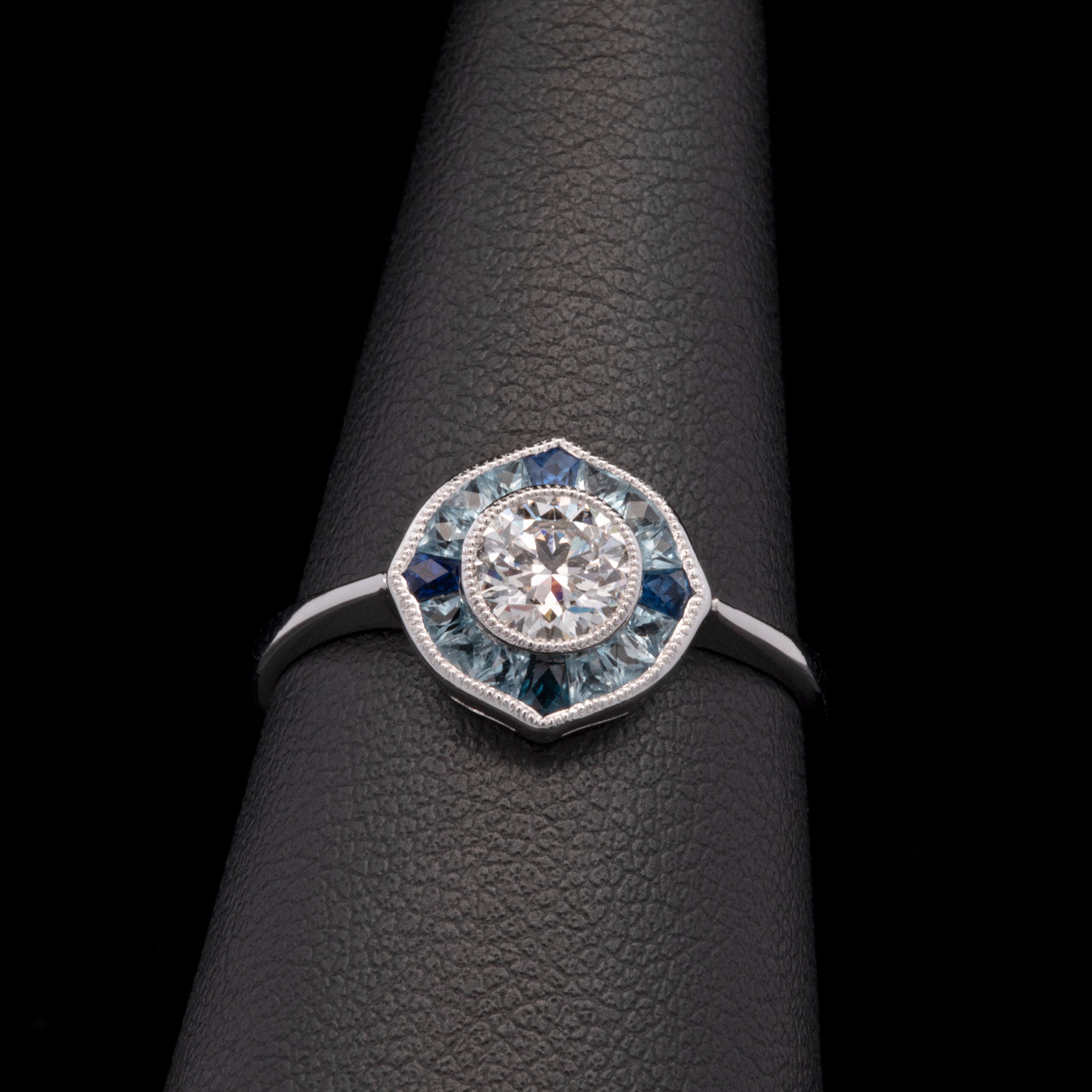 18K White Gold Aquamarine, Diamond, And Sapphire Target Cluster Ring
