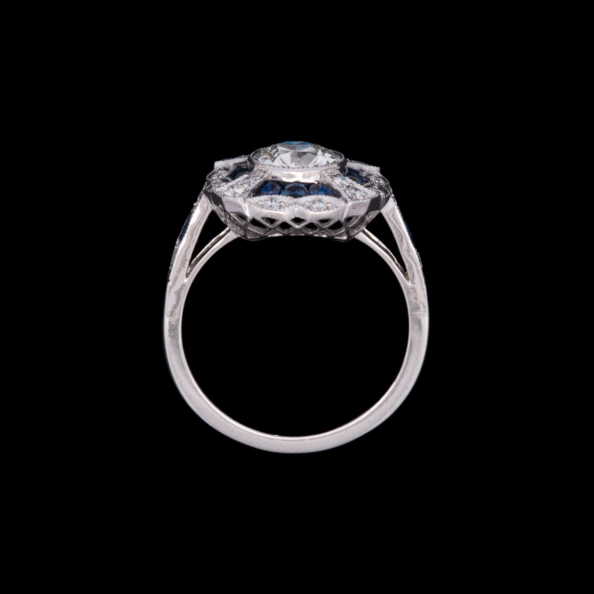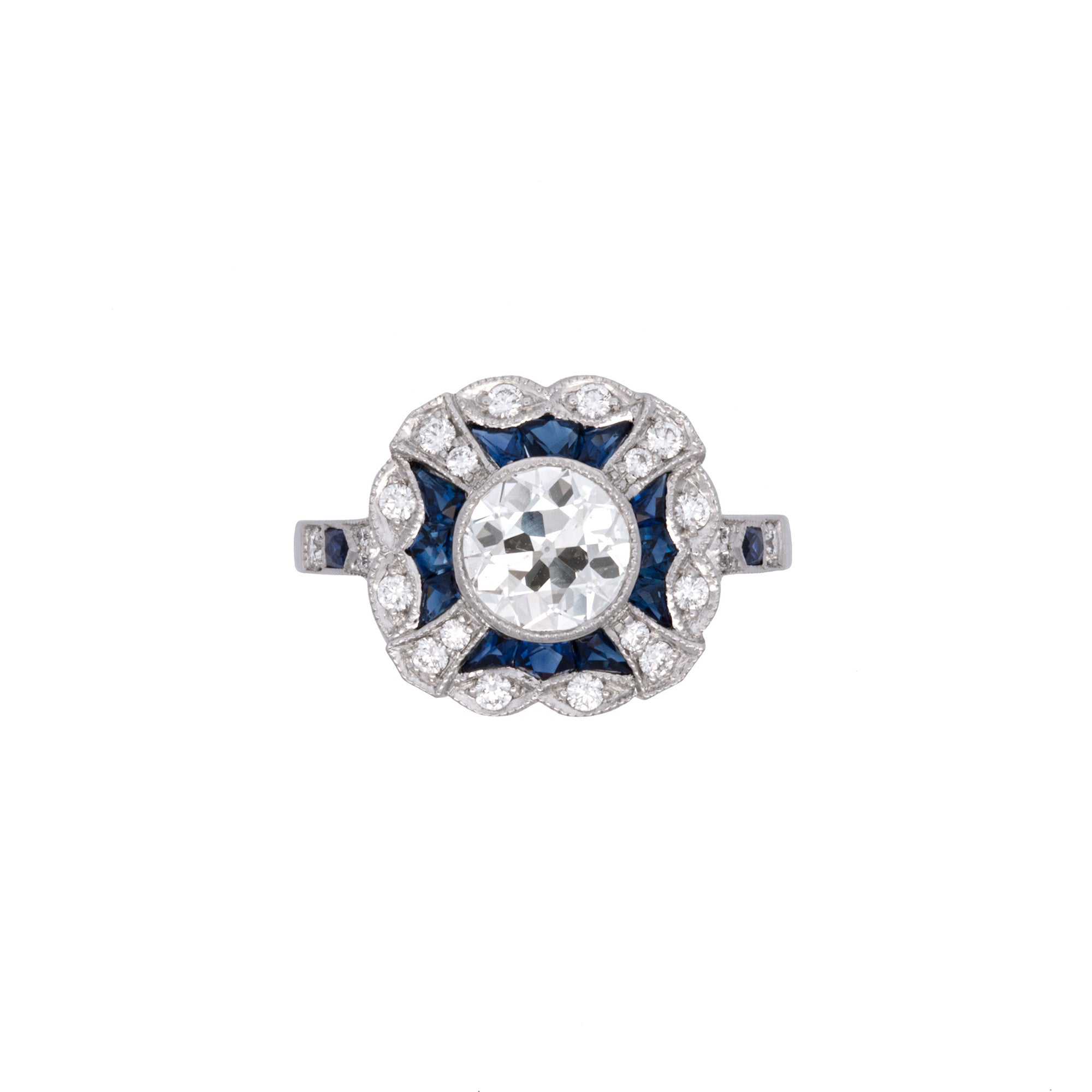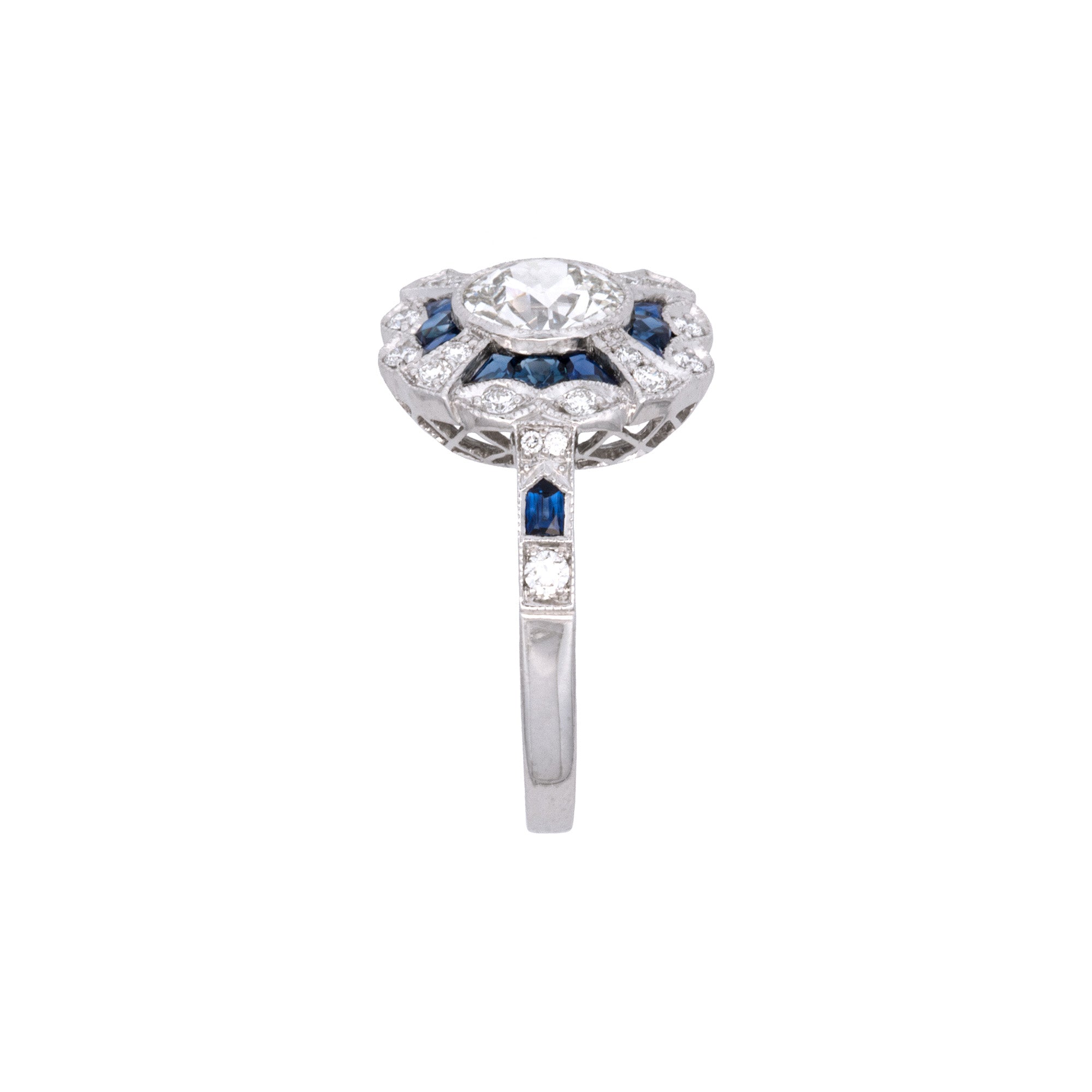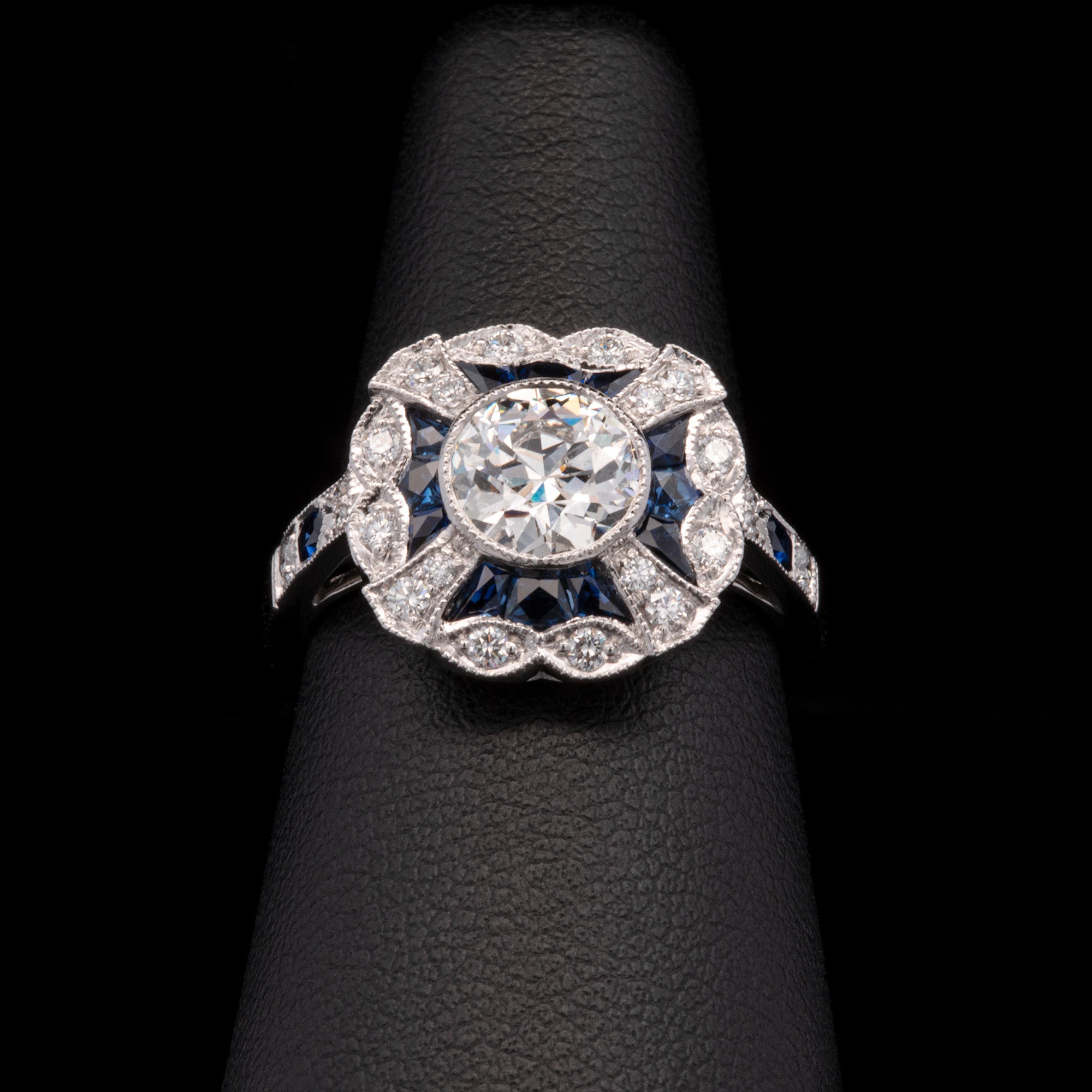 Platinum Diamond And Sapphire Ring. Center Diamond Weigh A Total Of 1.07 Carats And Have H Color, SI Clarity; EGL Certified. Twenty Accent Diamonds Weigh A Total Of 0.24 Carats. Fourteen Sapphires Weigh A Total Of 0.61 Carats. Sizing Available.