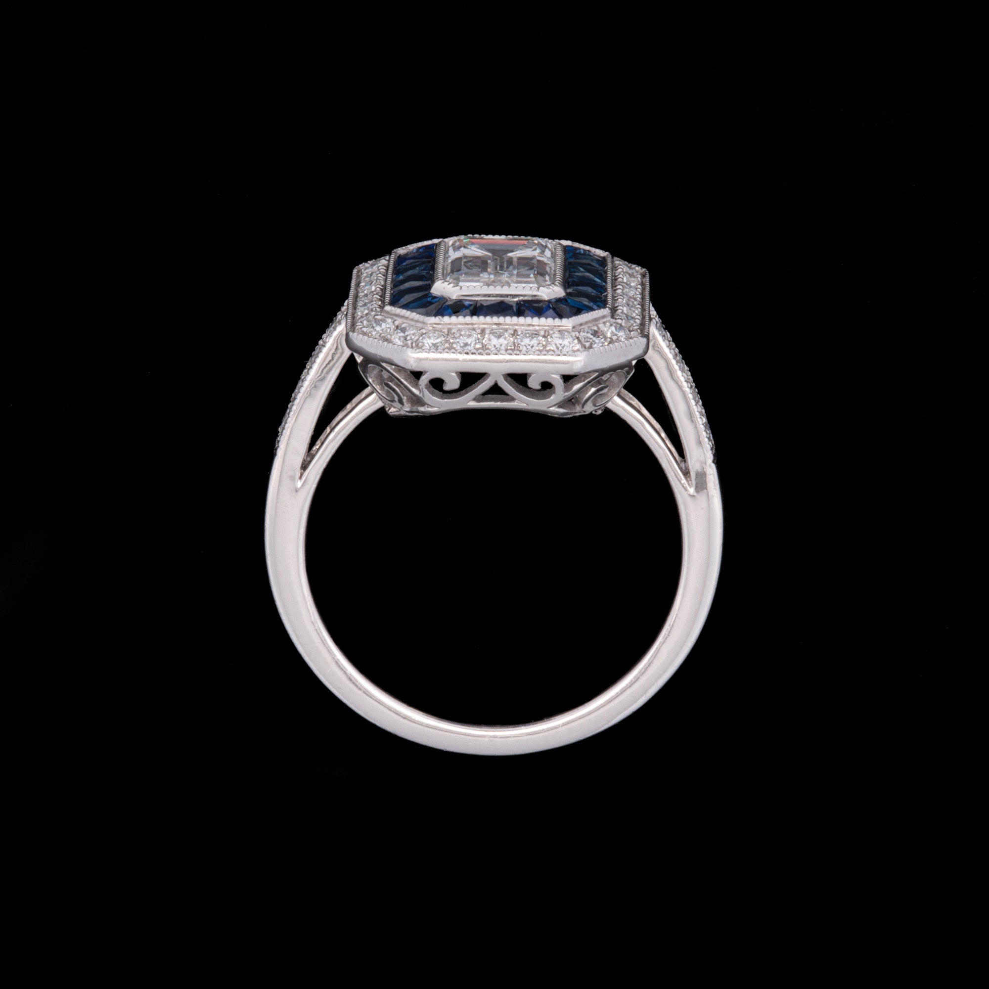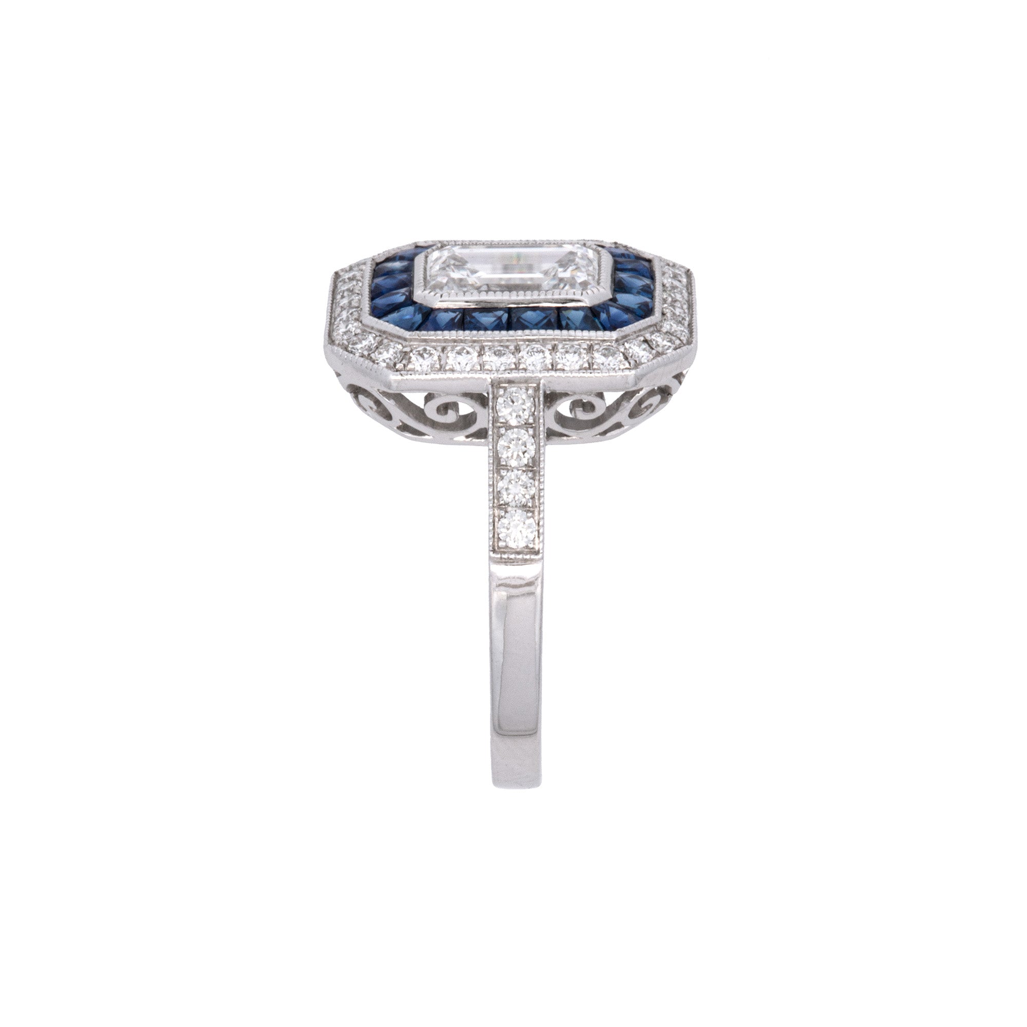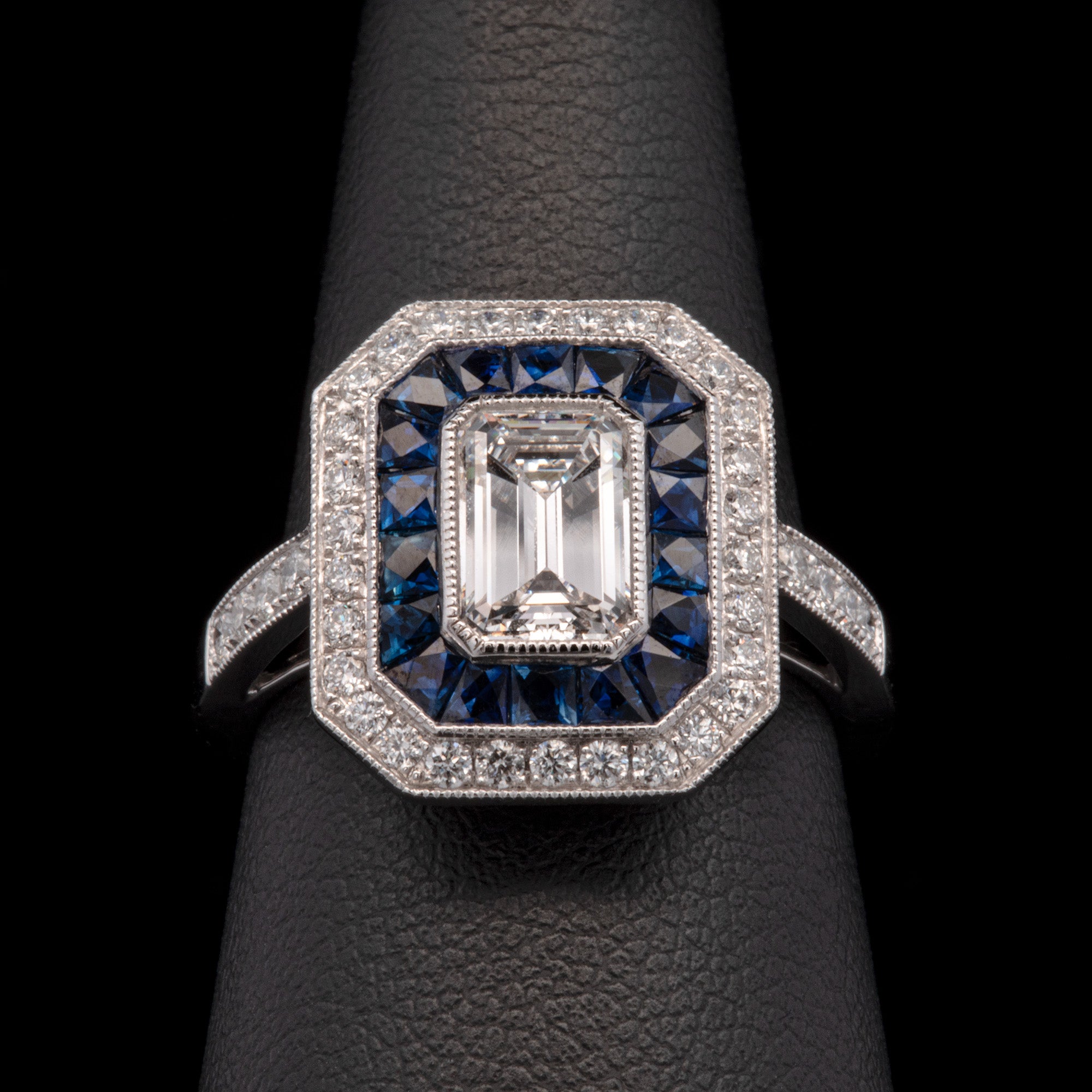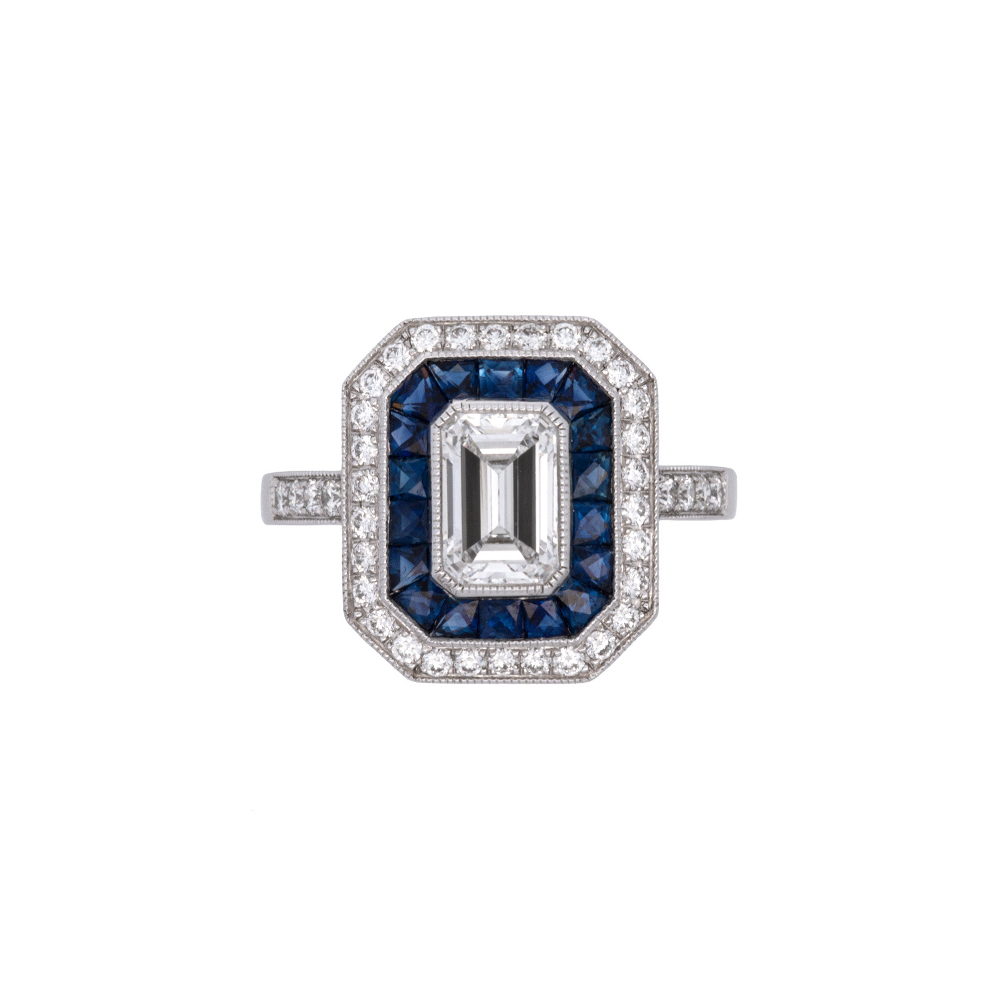 Platinum Emerald Cut Diamond And Sapphire Ring