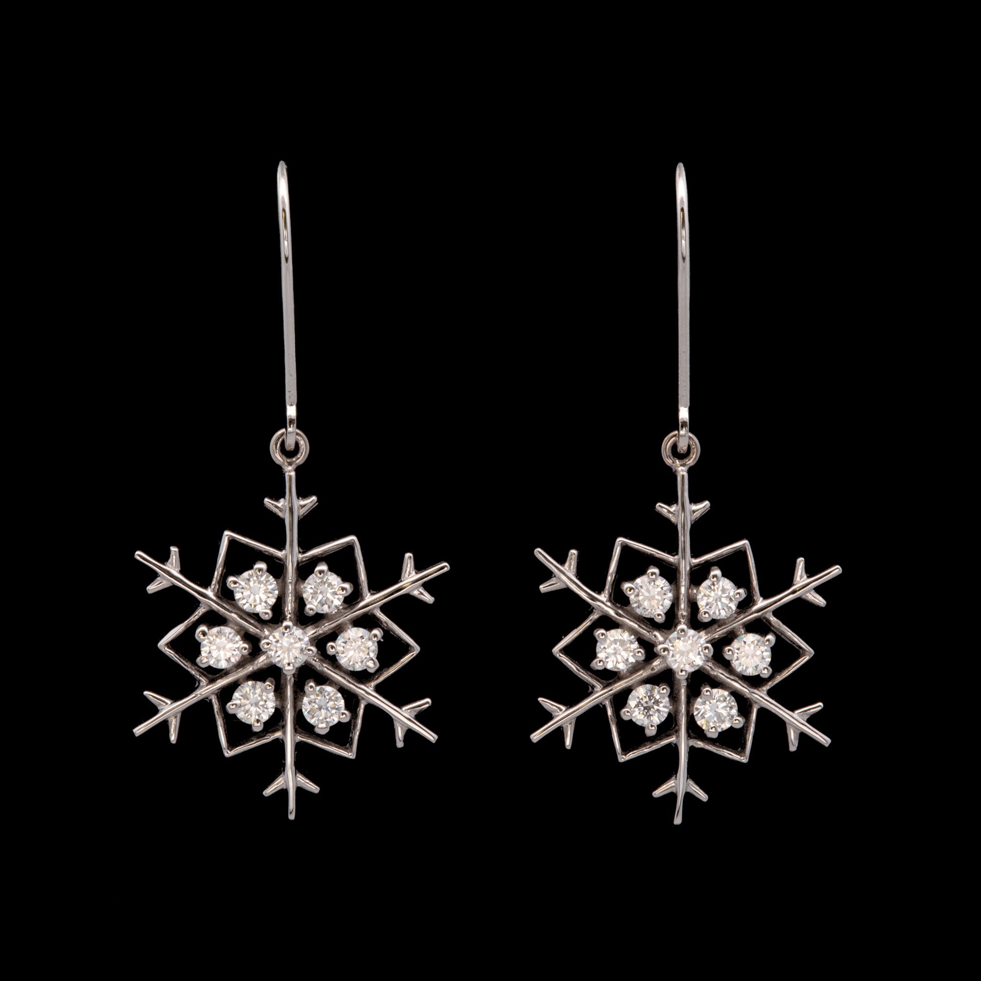 14K White Gold Middlebury Diamond Snowflake Earrings With Leverbacks. The Diamonds Weigh A Total of 0.79 Carats And Have G-H Color And VS Clarity. Diameter Measures 18mm.
