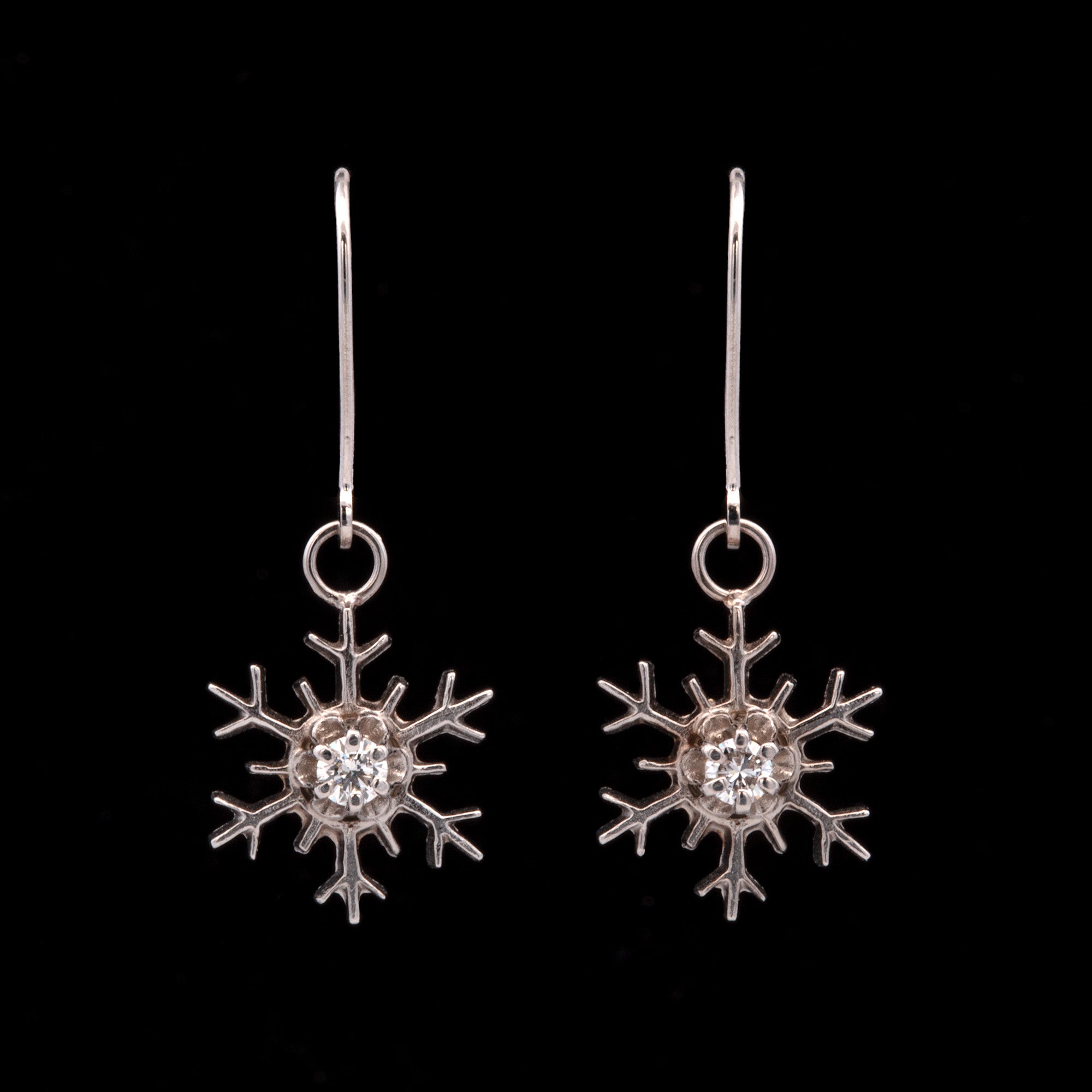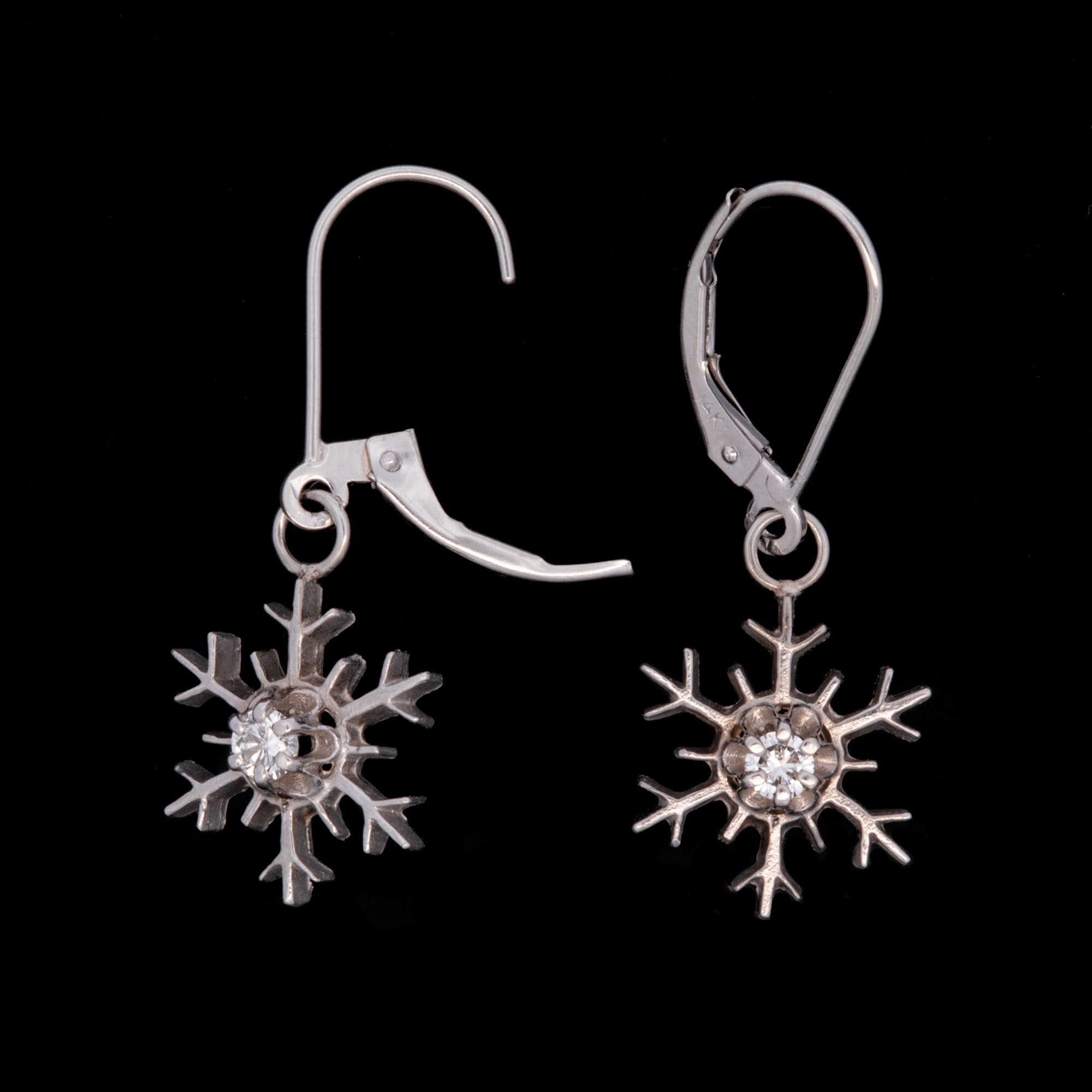 14K White Gold Montpelier Diamond Snowflake Dangle Earrings With Leverbacks. Diamonds Weigh A Total Of 0.18 Carats and Have G-H Color, VS Clarity. Diameter Measures 12mm