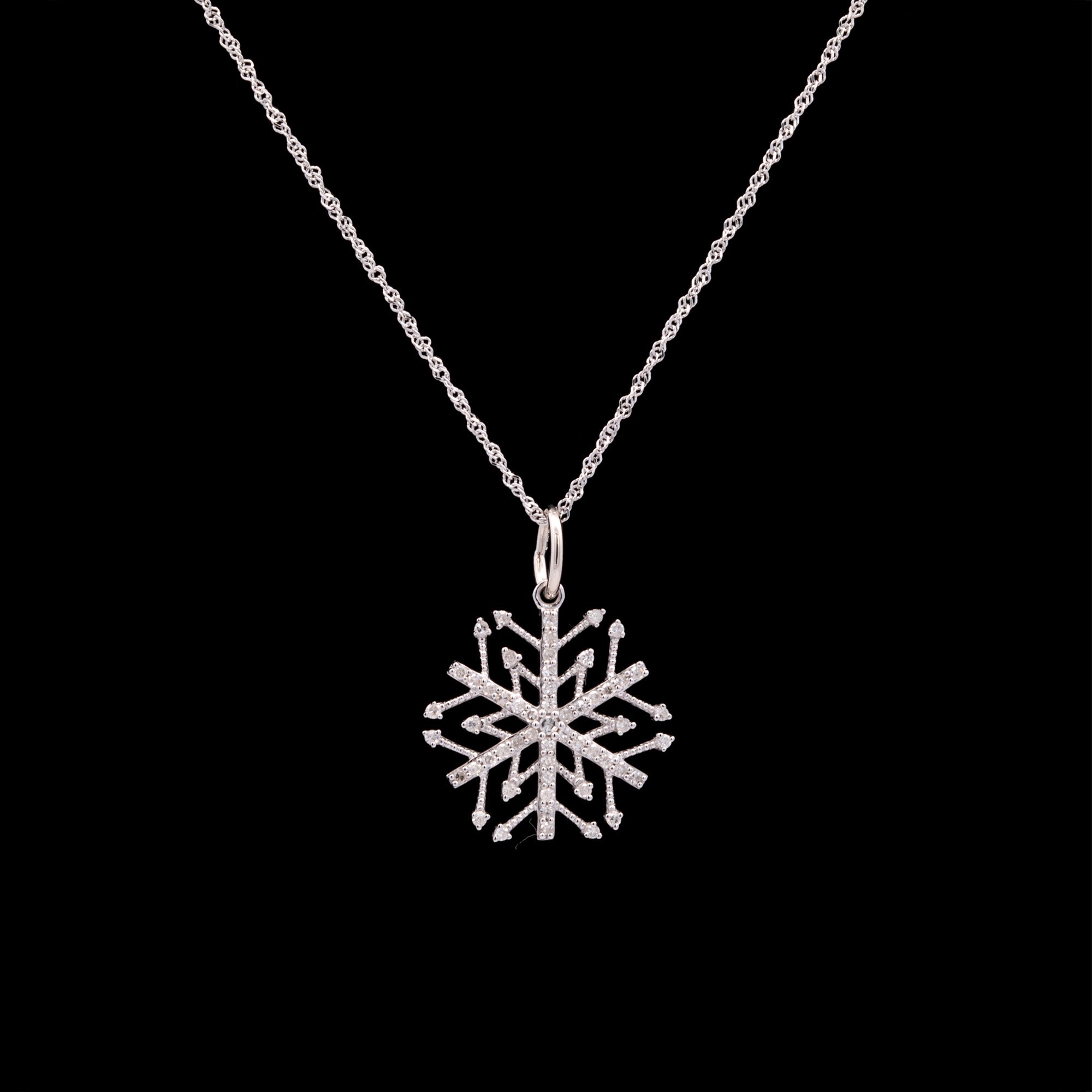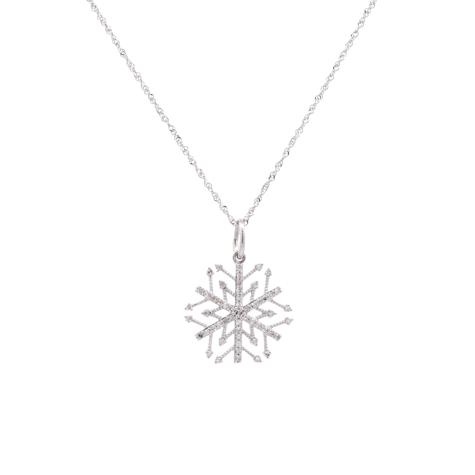 14K White Gold Small Essex Diamond Snowflake Pendant With 18" Chain. The Diamonds Weigh A Total Of 0.33 Carats And Have G-H Color And I1 Clarity. Diameter Measures 21mm.