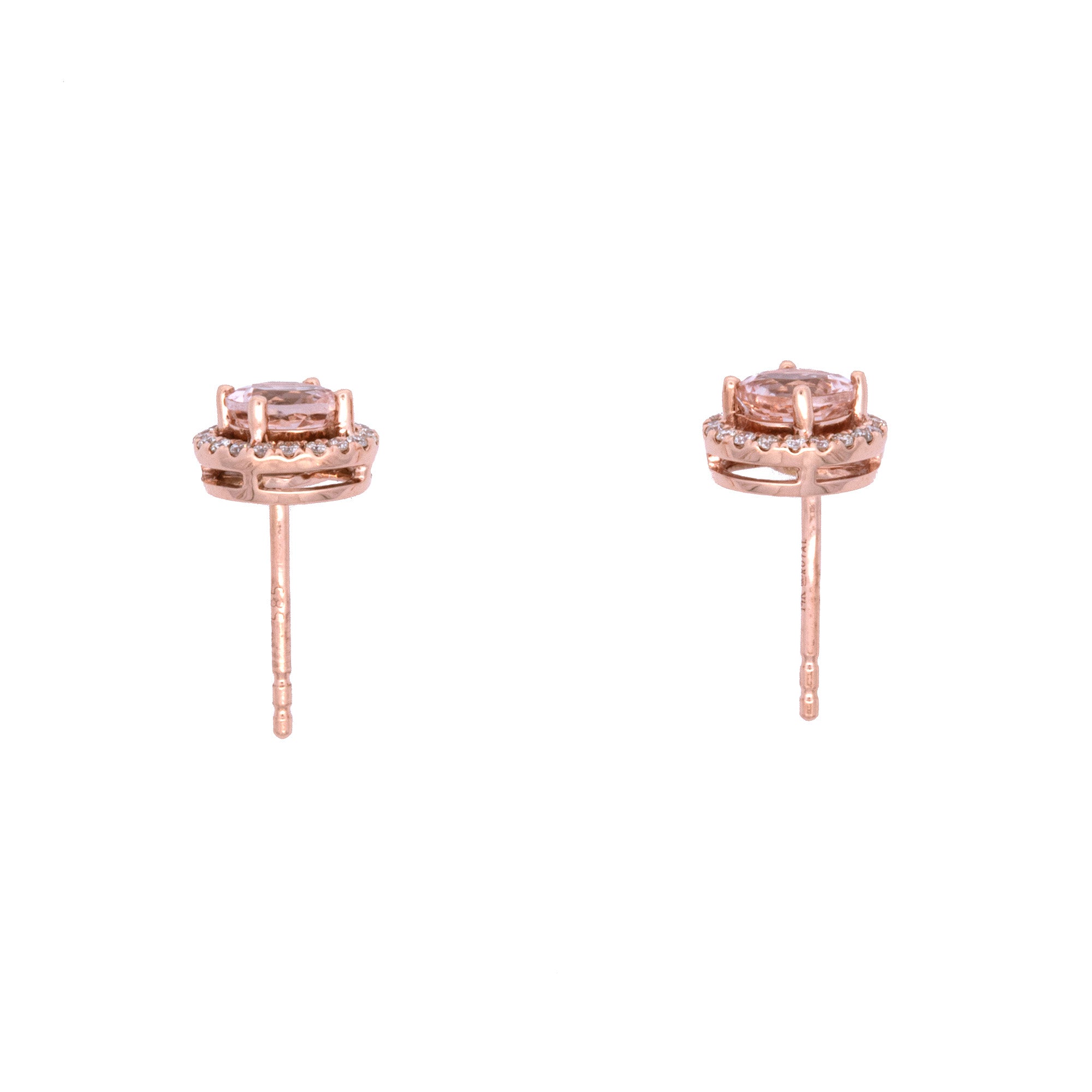 14K Rose Gold Morganite And Diamond Halo Stud Earring. Morganite Weighs A Total Of 0.75 Carats. Diamonds Weigh A Total Of 0.21 Carats.