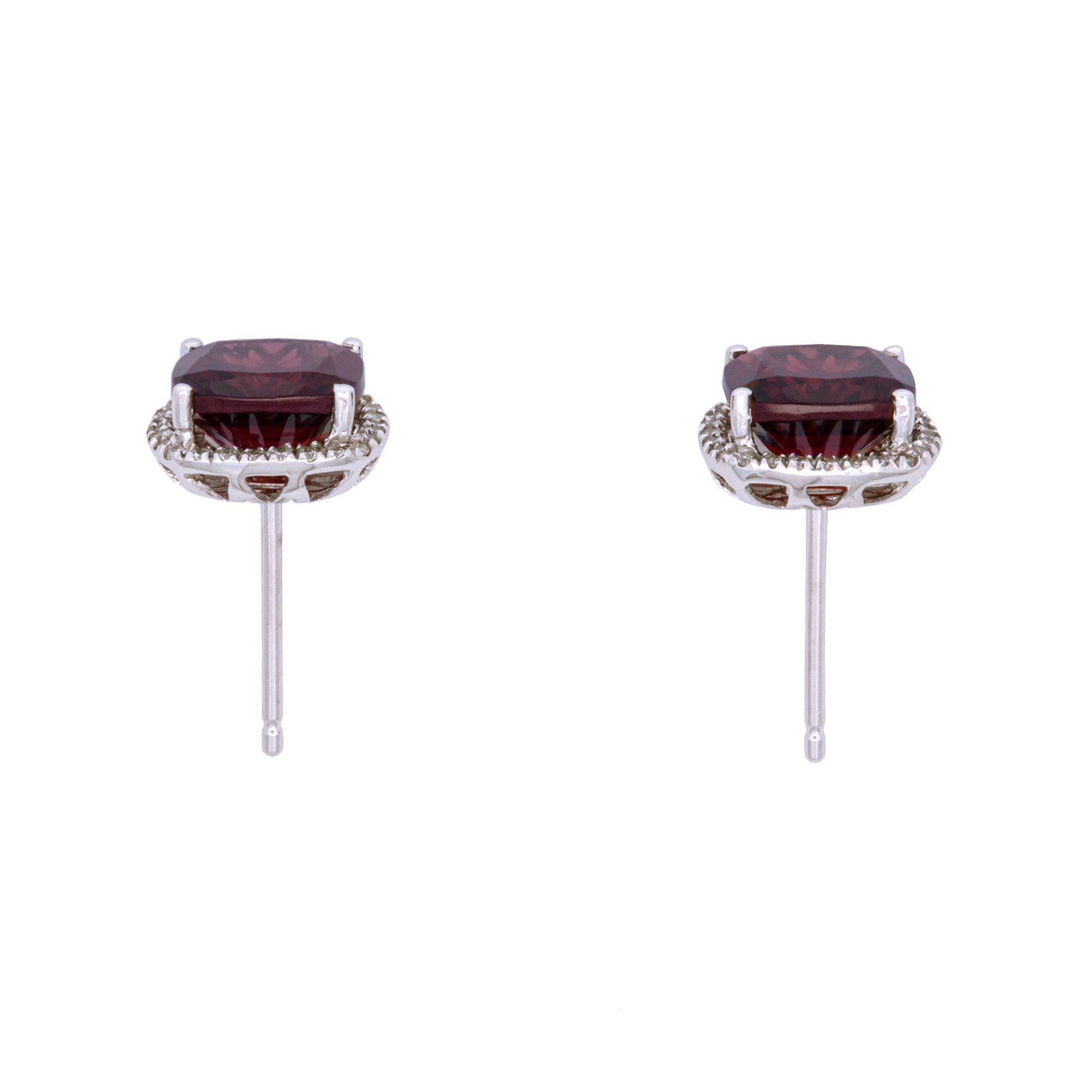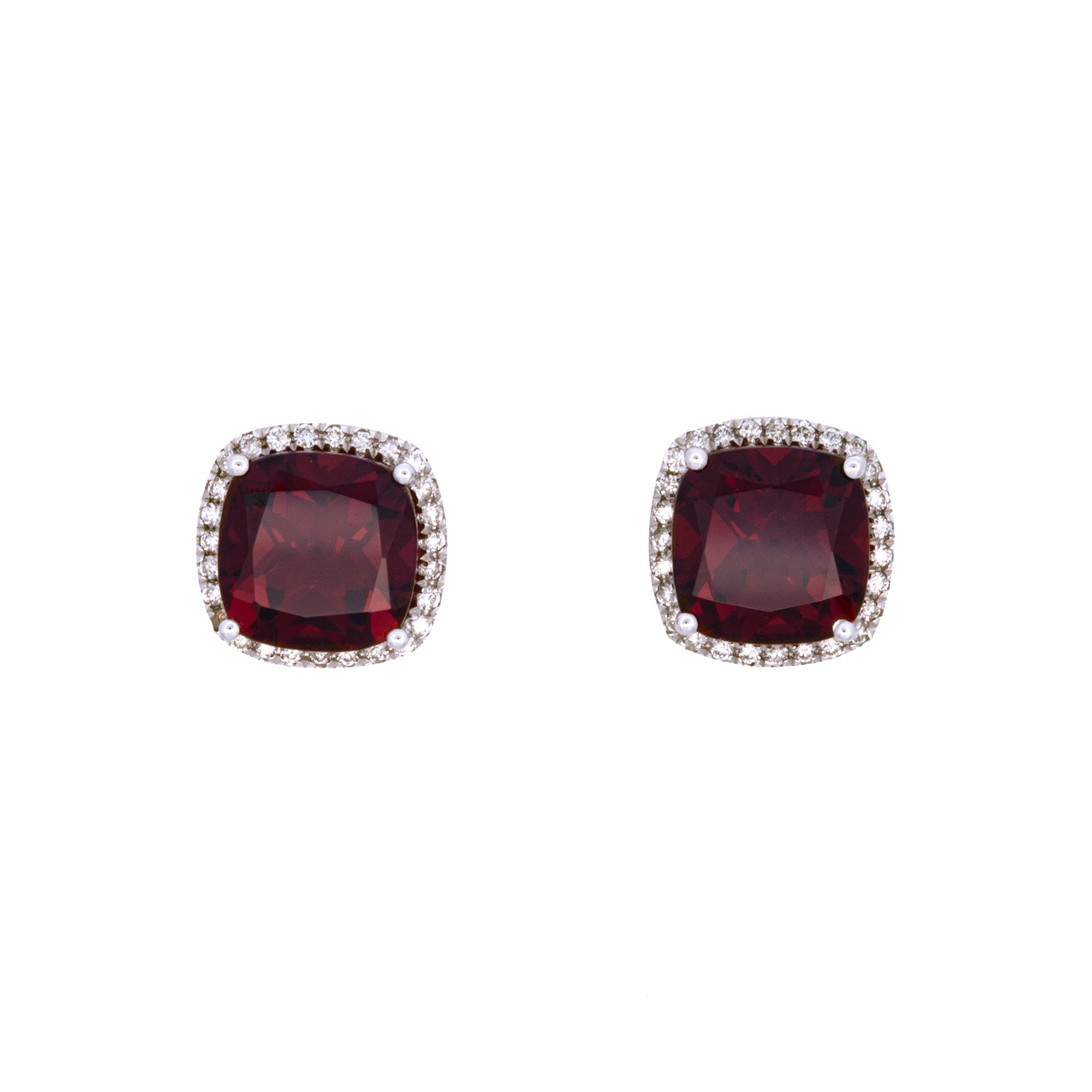 14K White Gold Cushion Cut Garnet And Diamond Halo Stud Earrings