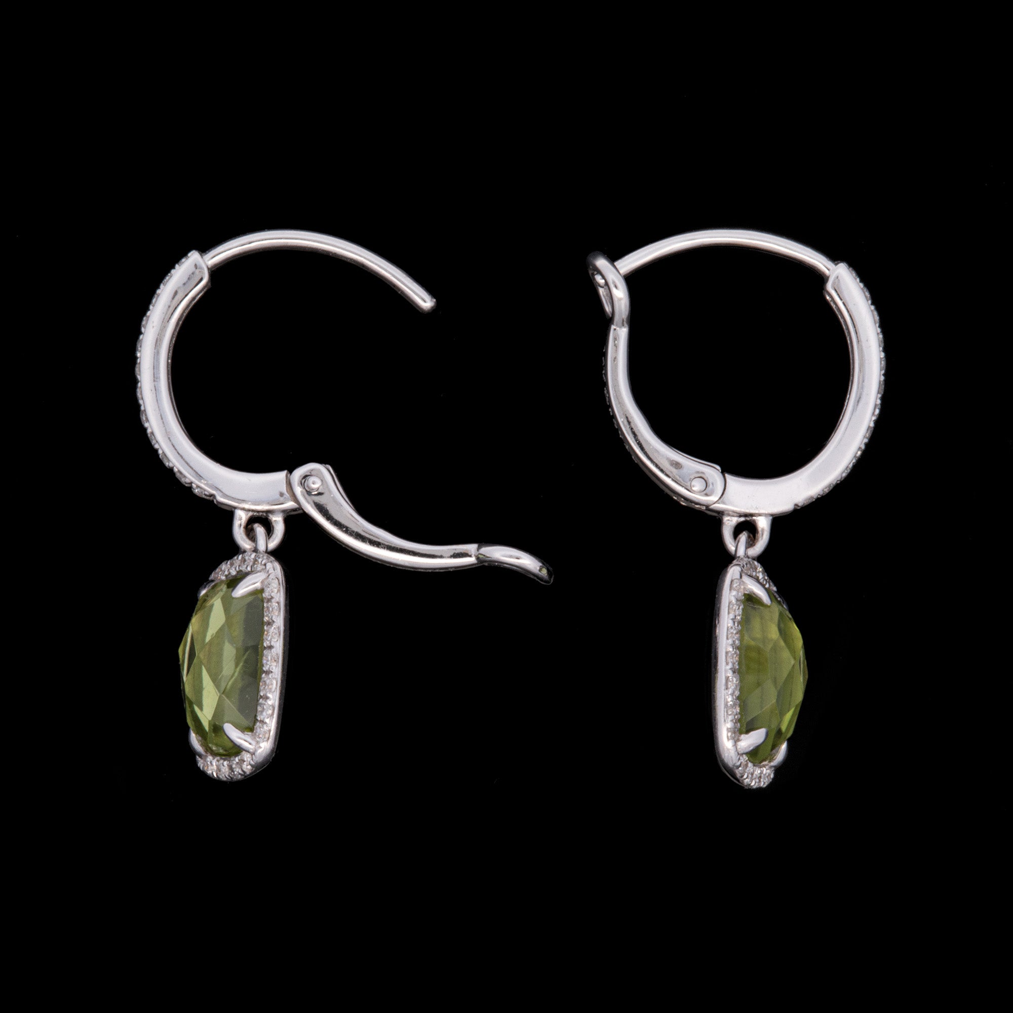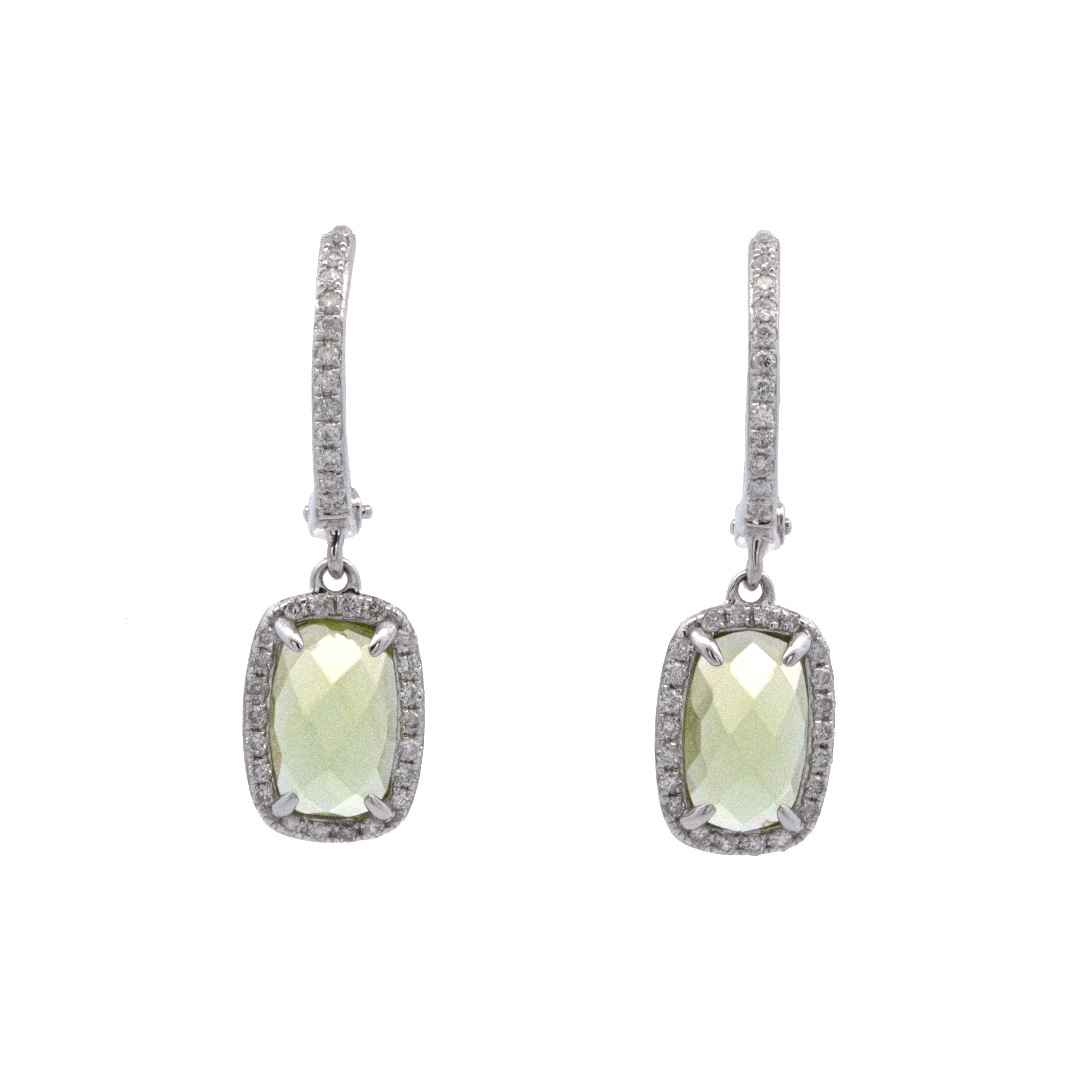 14K White Gold Peridot And Diamond Halo Drop Earrings With Leaver Backs