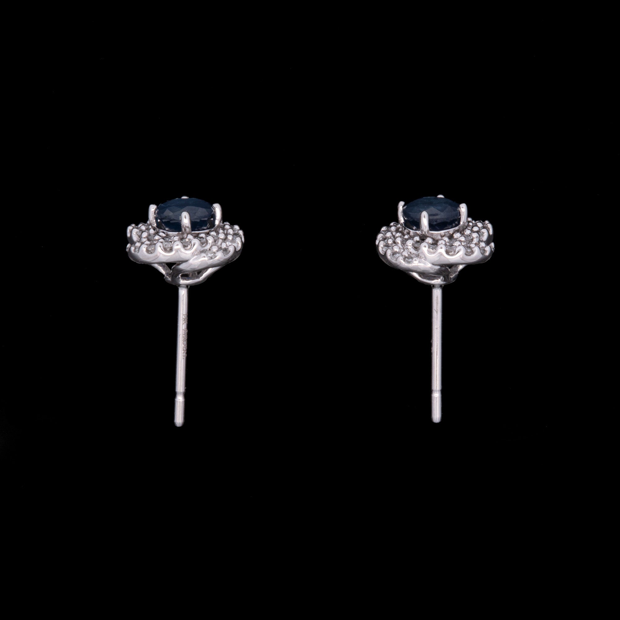 14K White Gold Sapphire And Diamond Halo Stud Earrings. Sapphires Weigh A Total Of 0.90 Carats. Diamonds Weigh A Total Of 0.23 Carats.