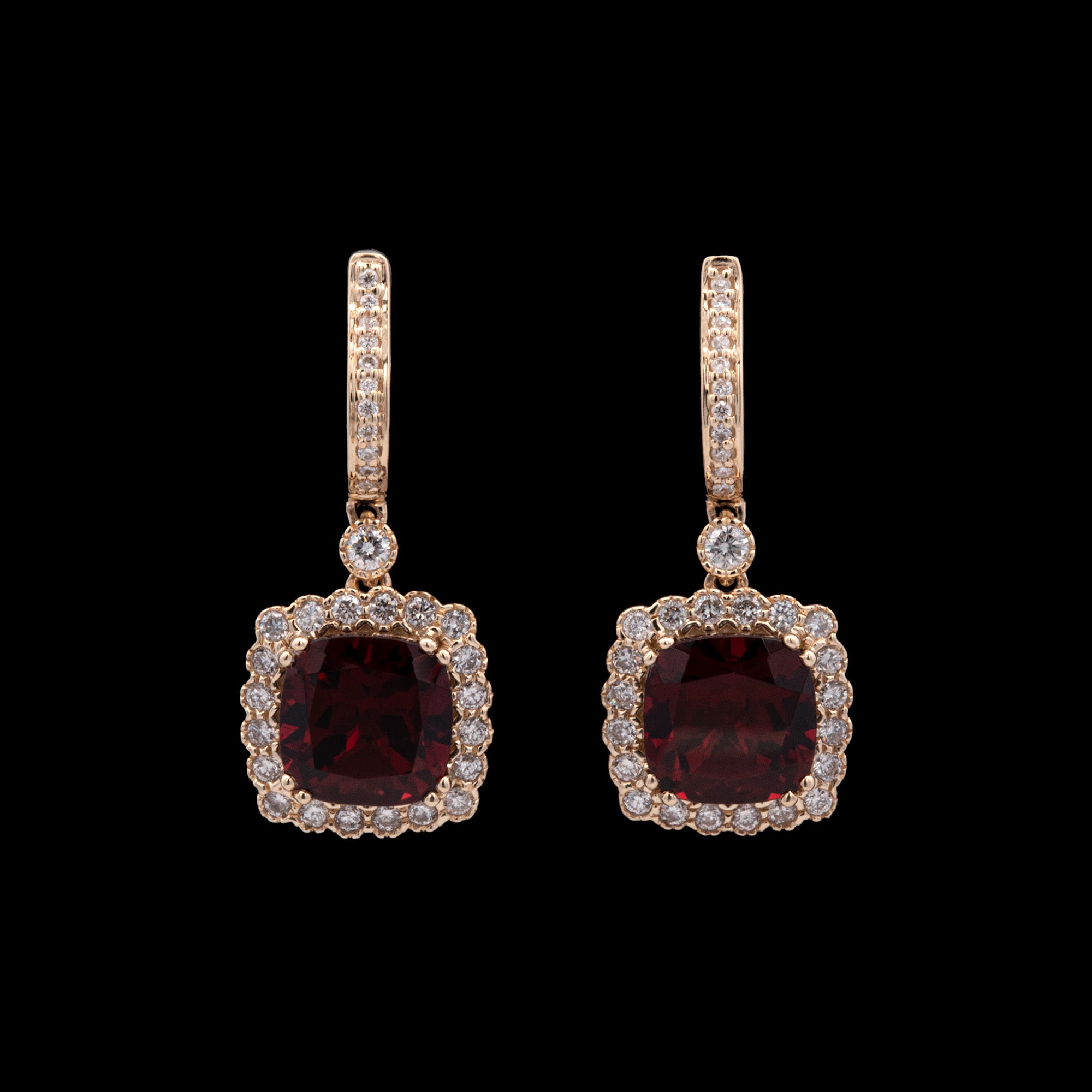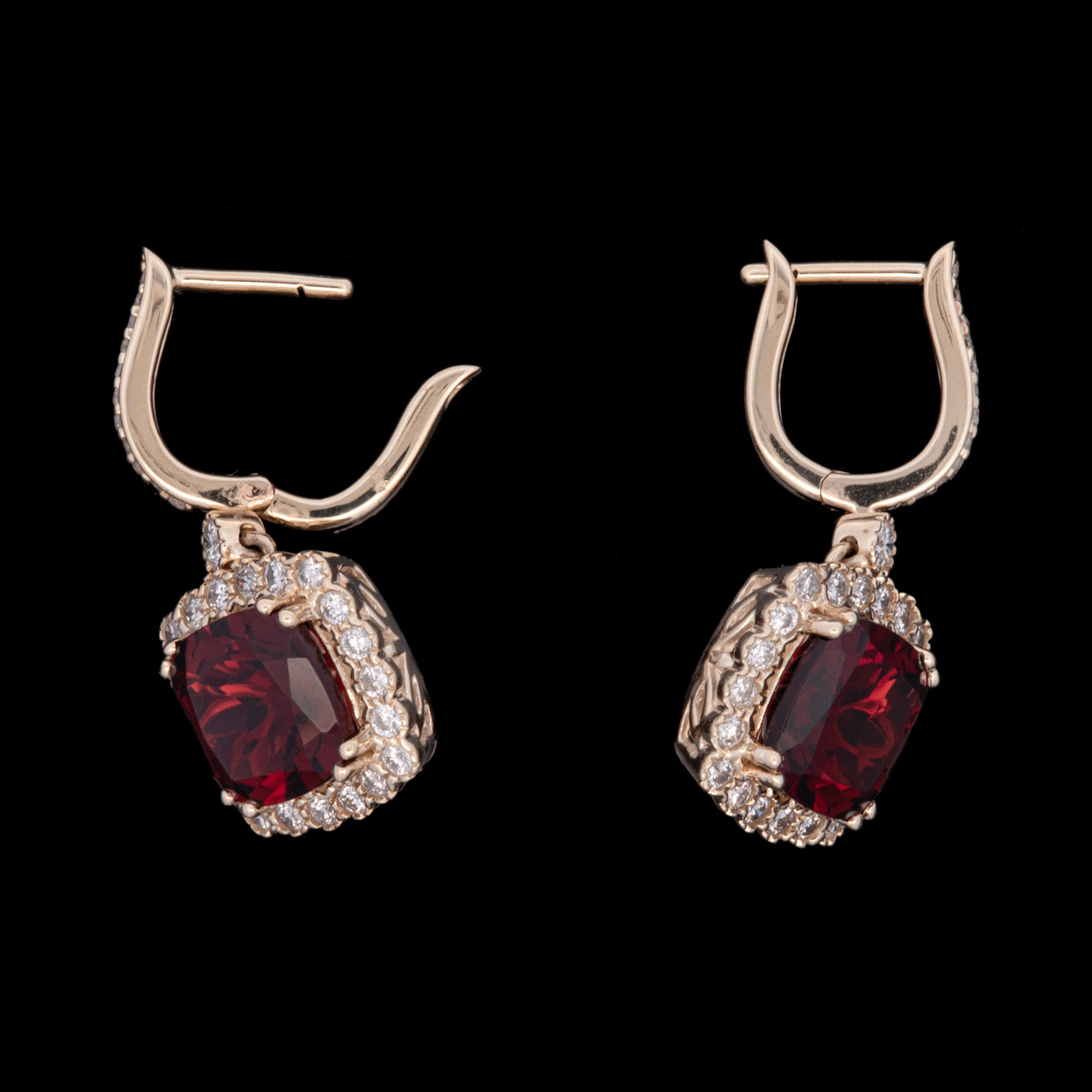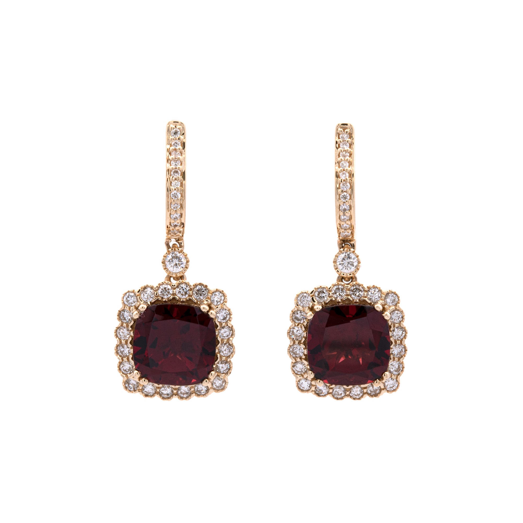 14K Yellow Gold Cushion Cut Garnet And Diamond Halo Drop Earrings. Two Garnets Weigh A Total Of 5.50 Carats. Diamonds Weigh A Total Of 0.68 Carats.