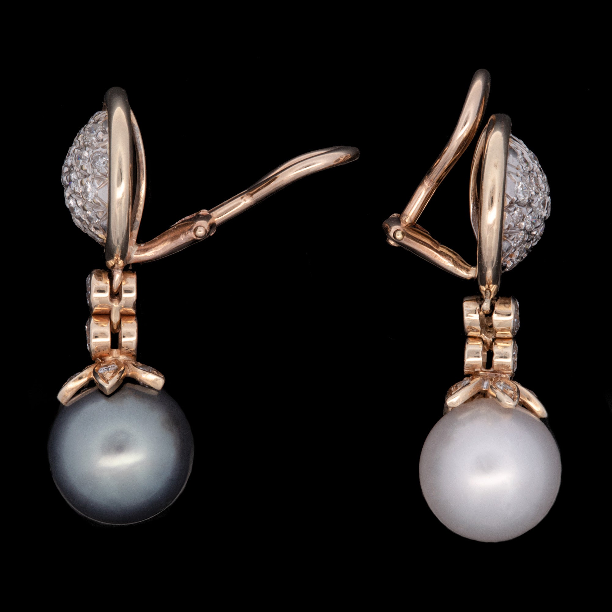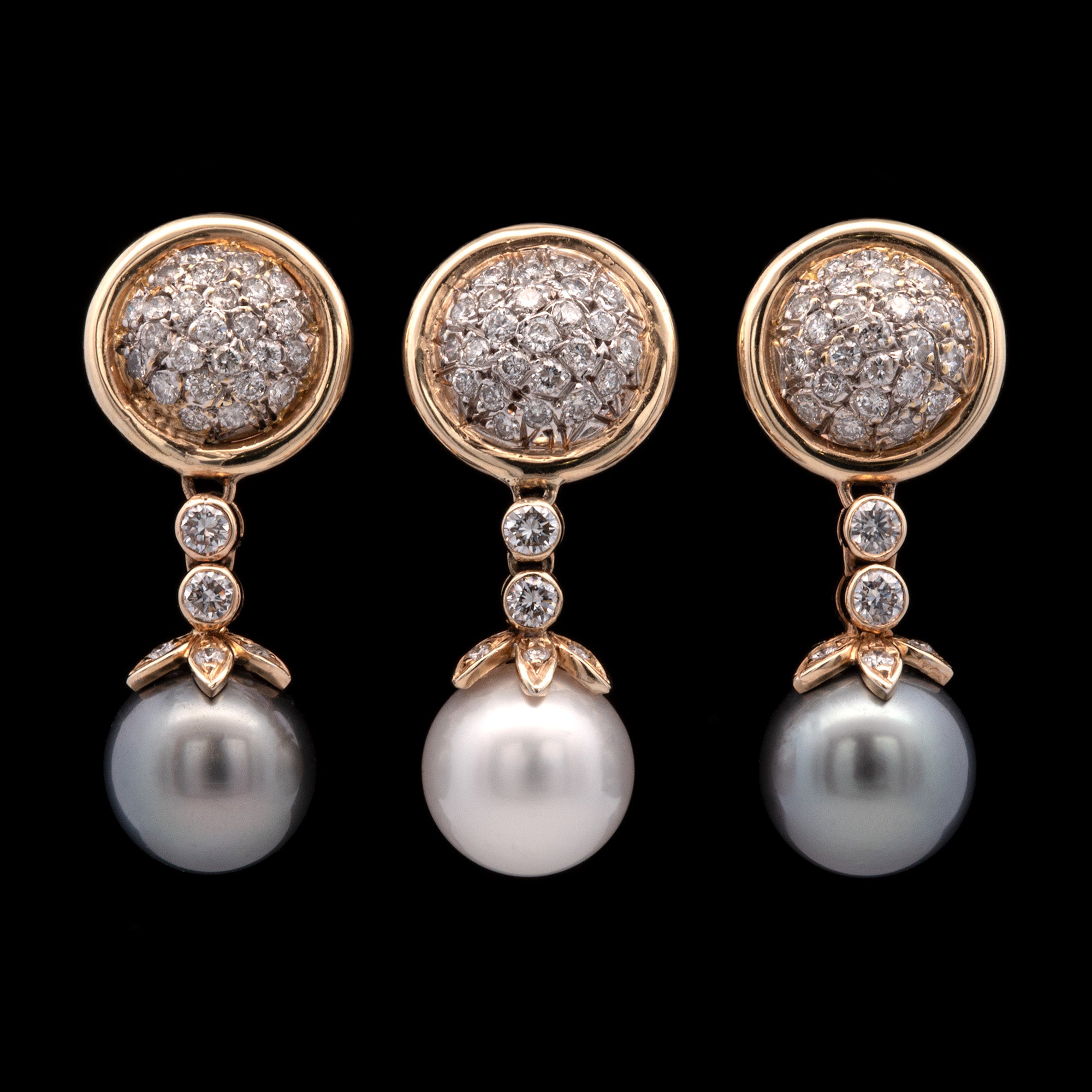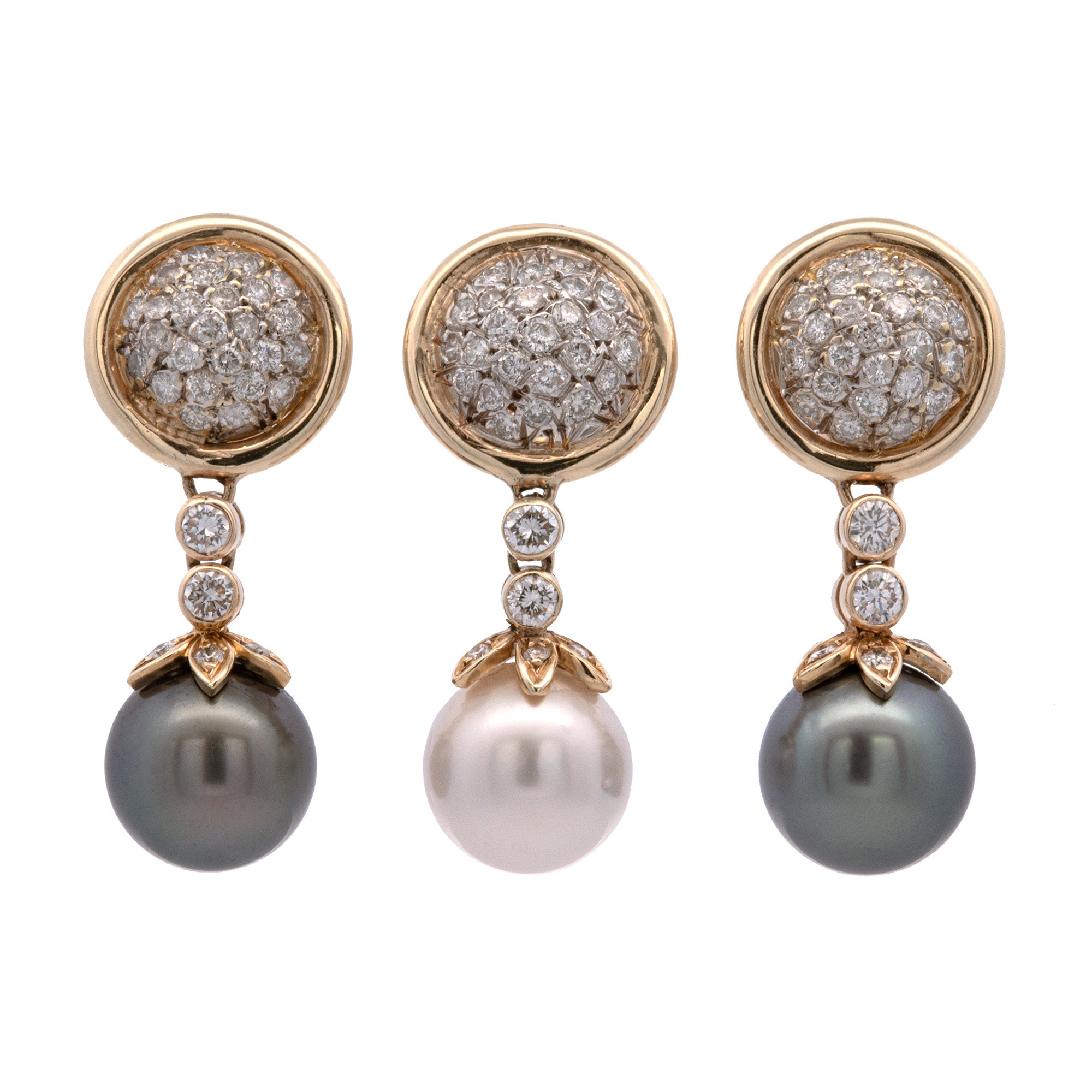 14K Yellow Gold Set Of Three Pearl And Diamond Drop Earrings With Omega Backs. Two Black Pearls Measure 11mm. One White Pearl Weighs 10.5mm. Ninety-Three Diamonds Weigh A Total Of 3.05 Carats.