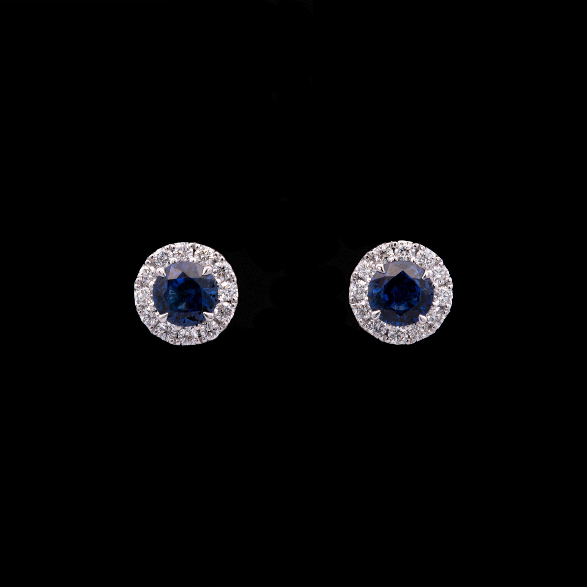 18K White Gold 1.26ctw Sapphire And Diamond Halo Stud Earrings. Two Sapphires Weigh A Total Of 1.26 Carats. Twenty-Four Diamonds Weigh A total Of 0.40 Carats And Have G-H Color, VS2-SI1 Clarity.