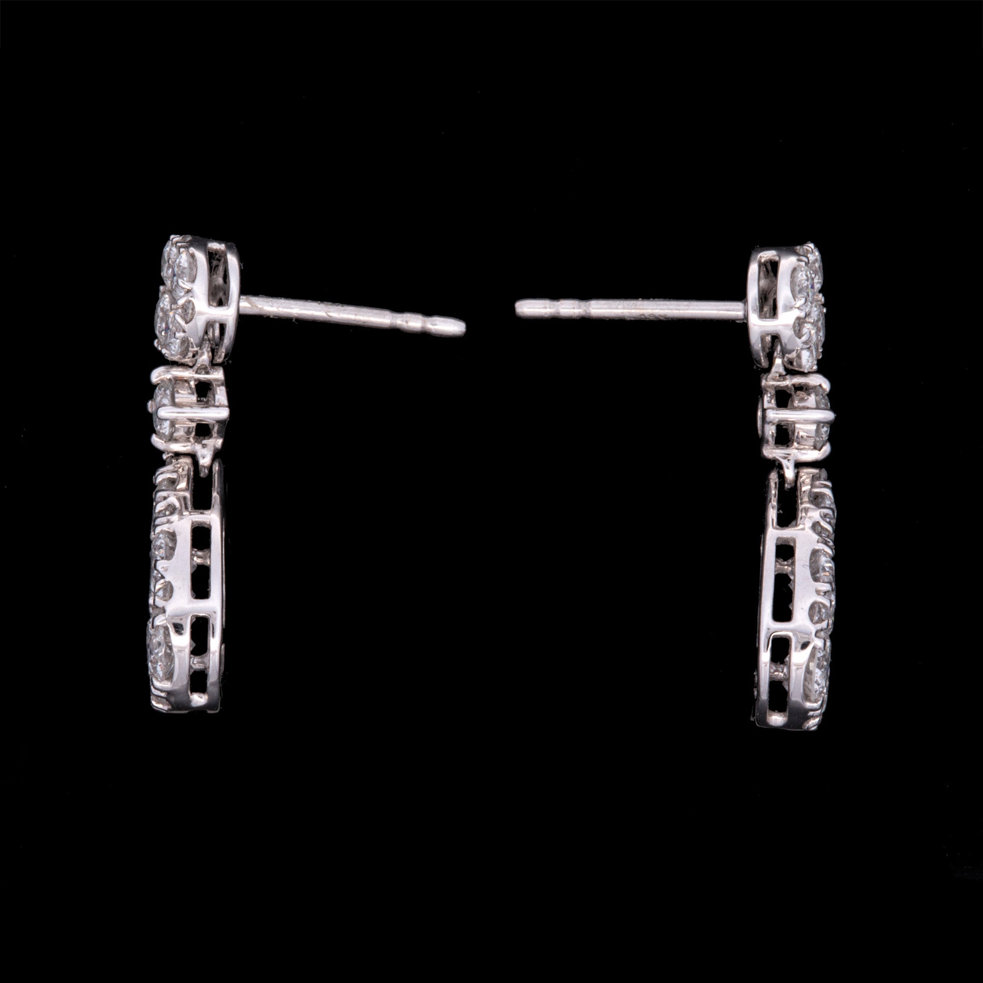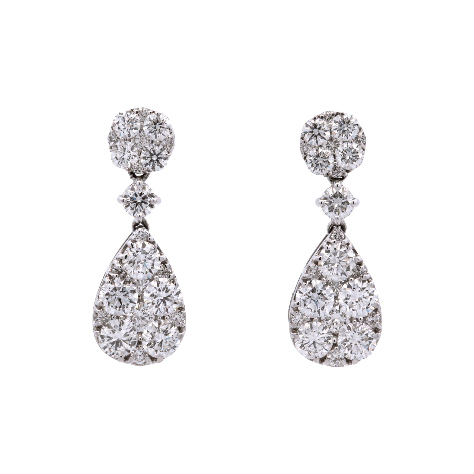 18K White Gold Cushion And Pear Shaped Illusion Cluster Drop Earrings. Forty-Six Round Diamonds Weigh A Total Of 2.70 Carats And Have G-H Color, SI Clarity.