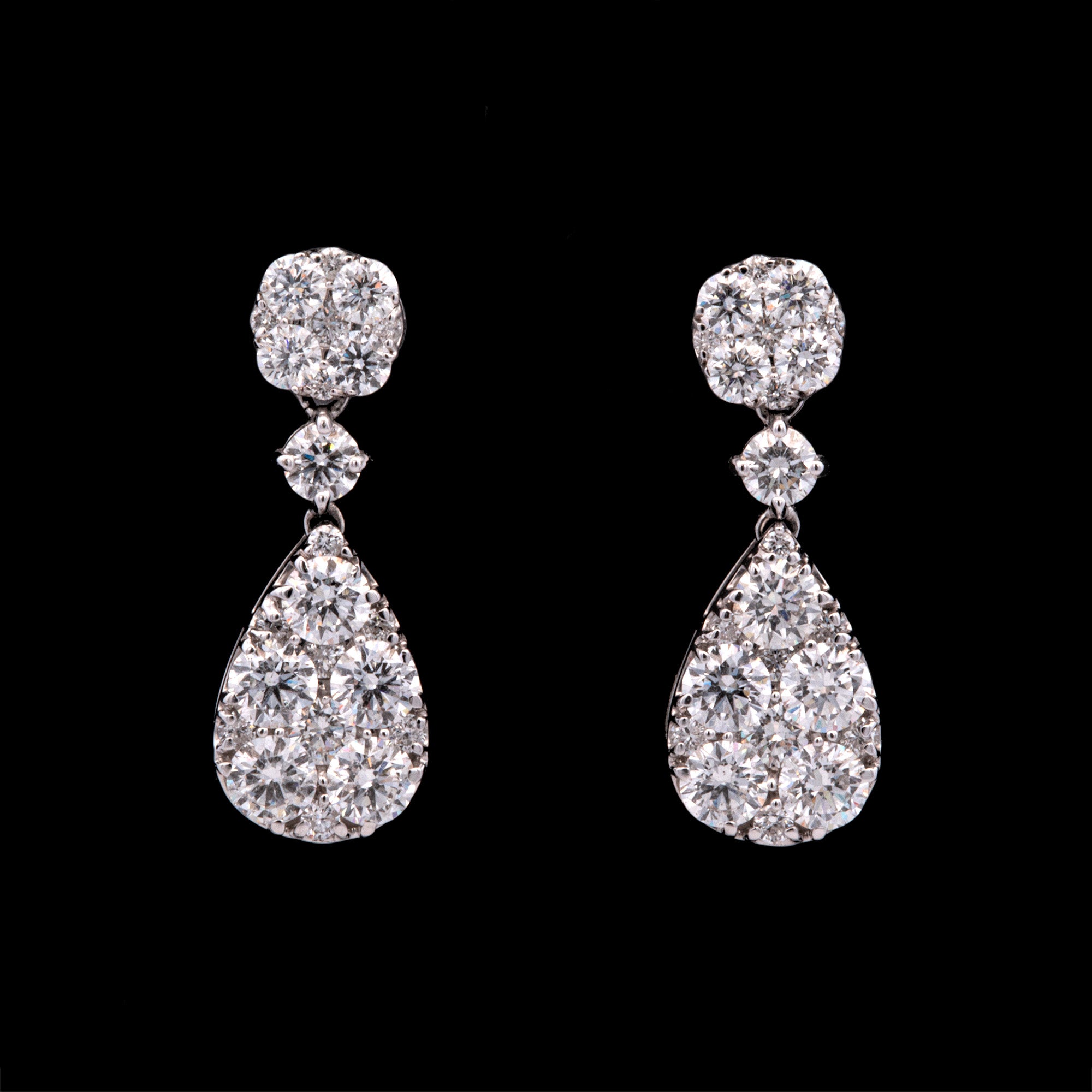 18K White Gold Cushion And Pear Shaped Illusion Cluster Drop Earrings