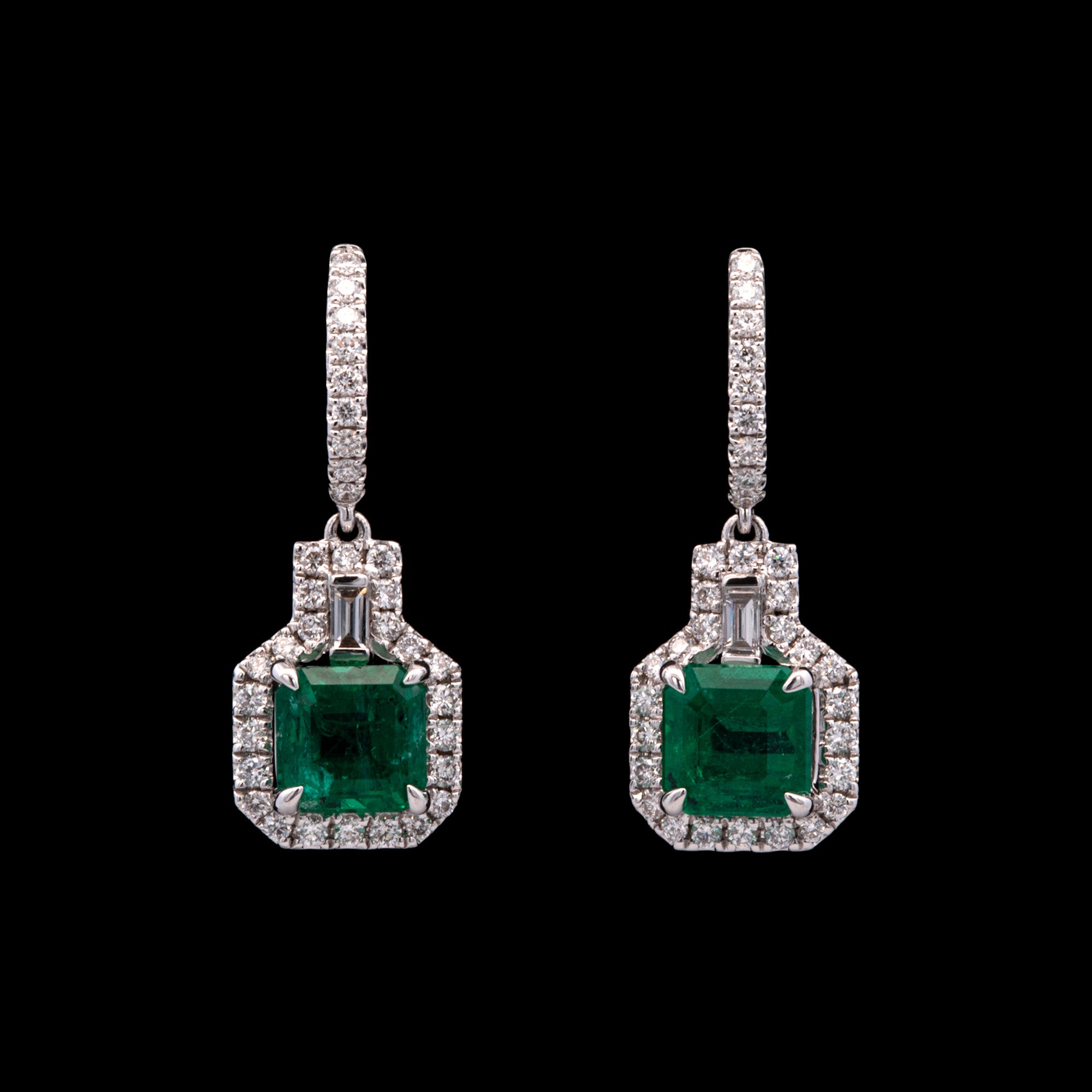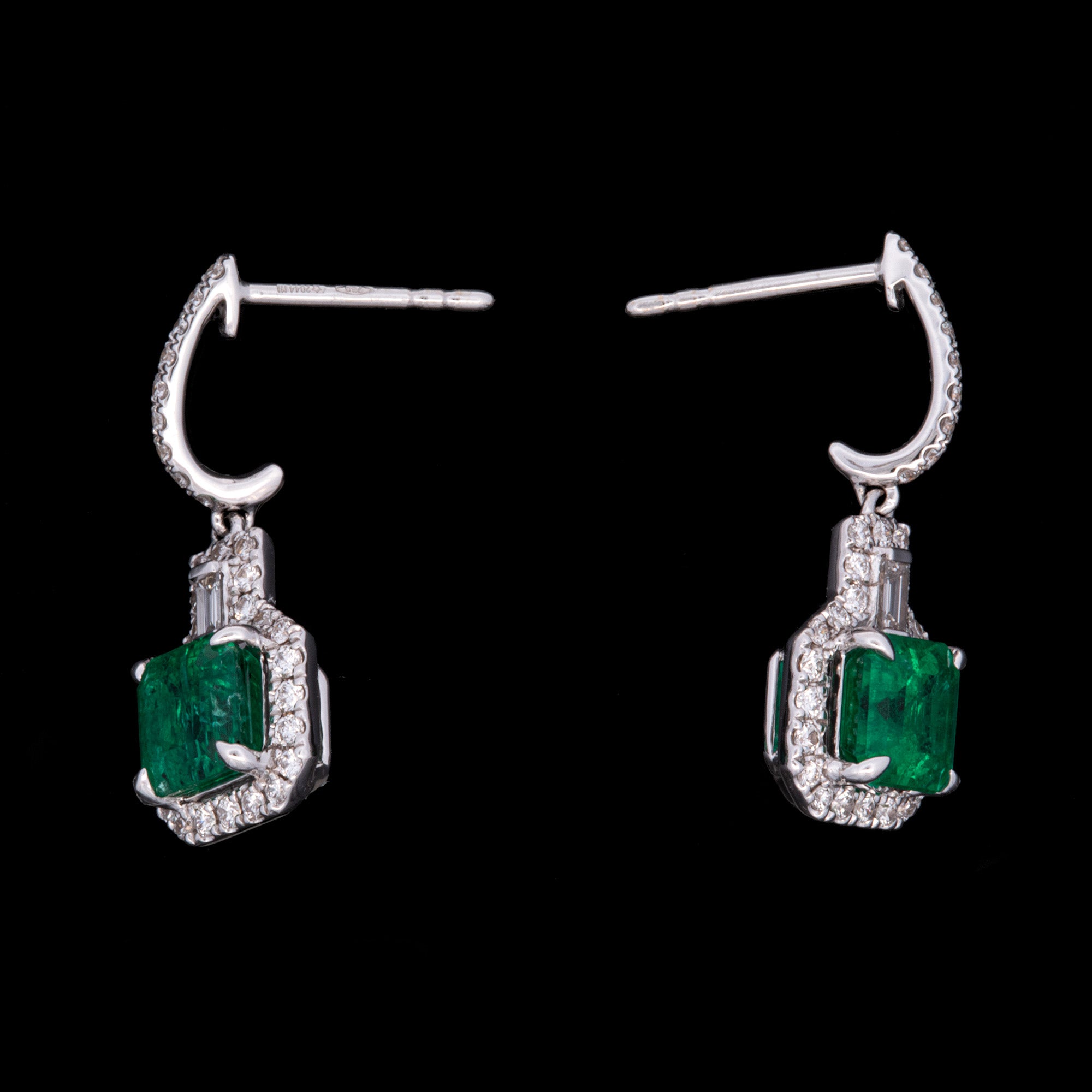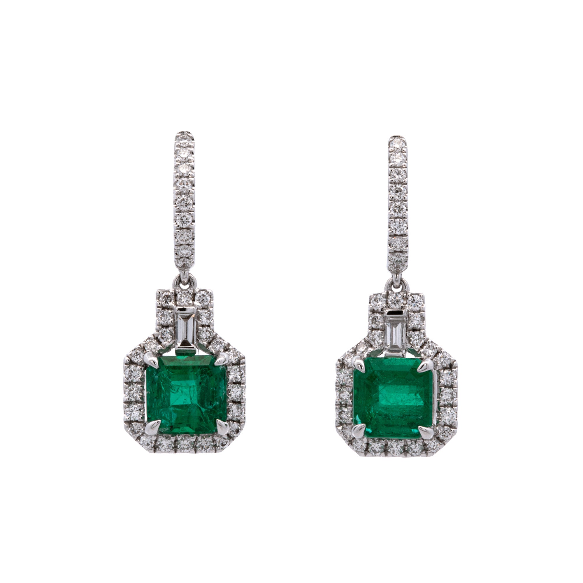 18K White Gold Emerald And Diamond Drop Earrings. Emerald Cut Emeralds Weigh A Total Of 2.08 Carats. Forty-Eight Round And Baguette Diamonds Weigh A Total Of 0.89 Carats And Have G Color, VS2 Clarity.