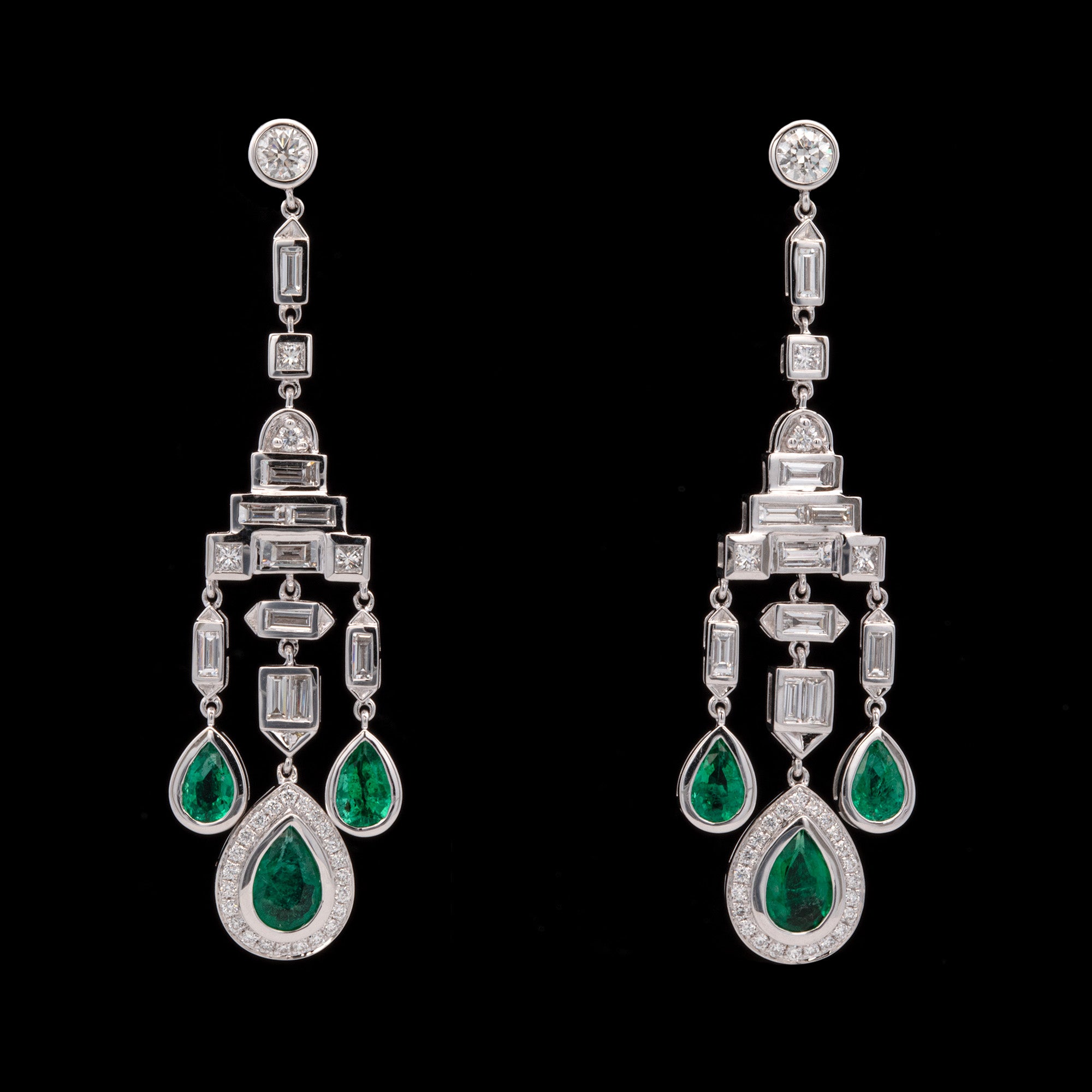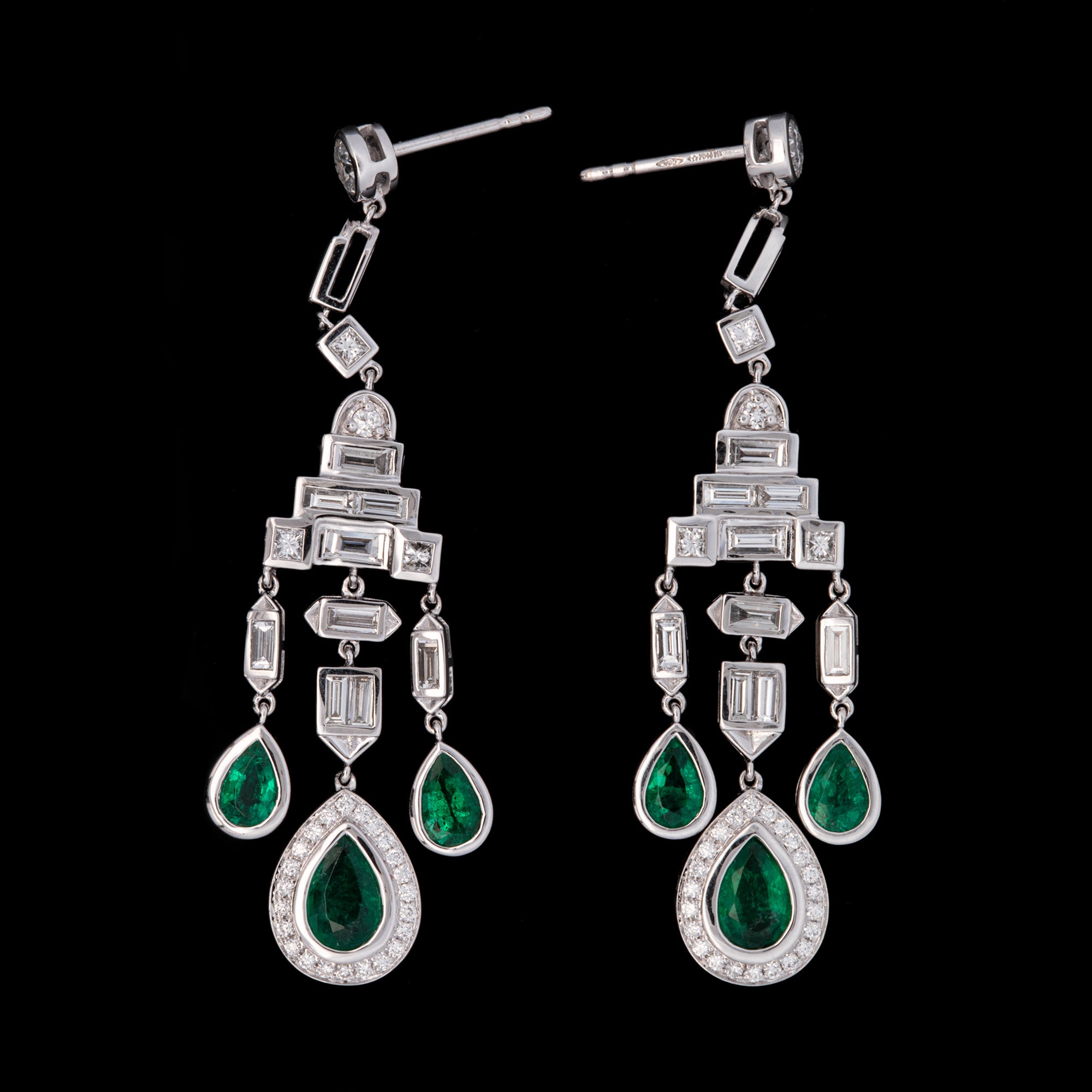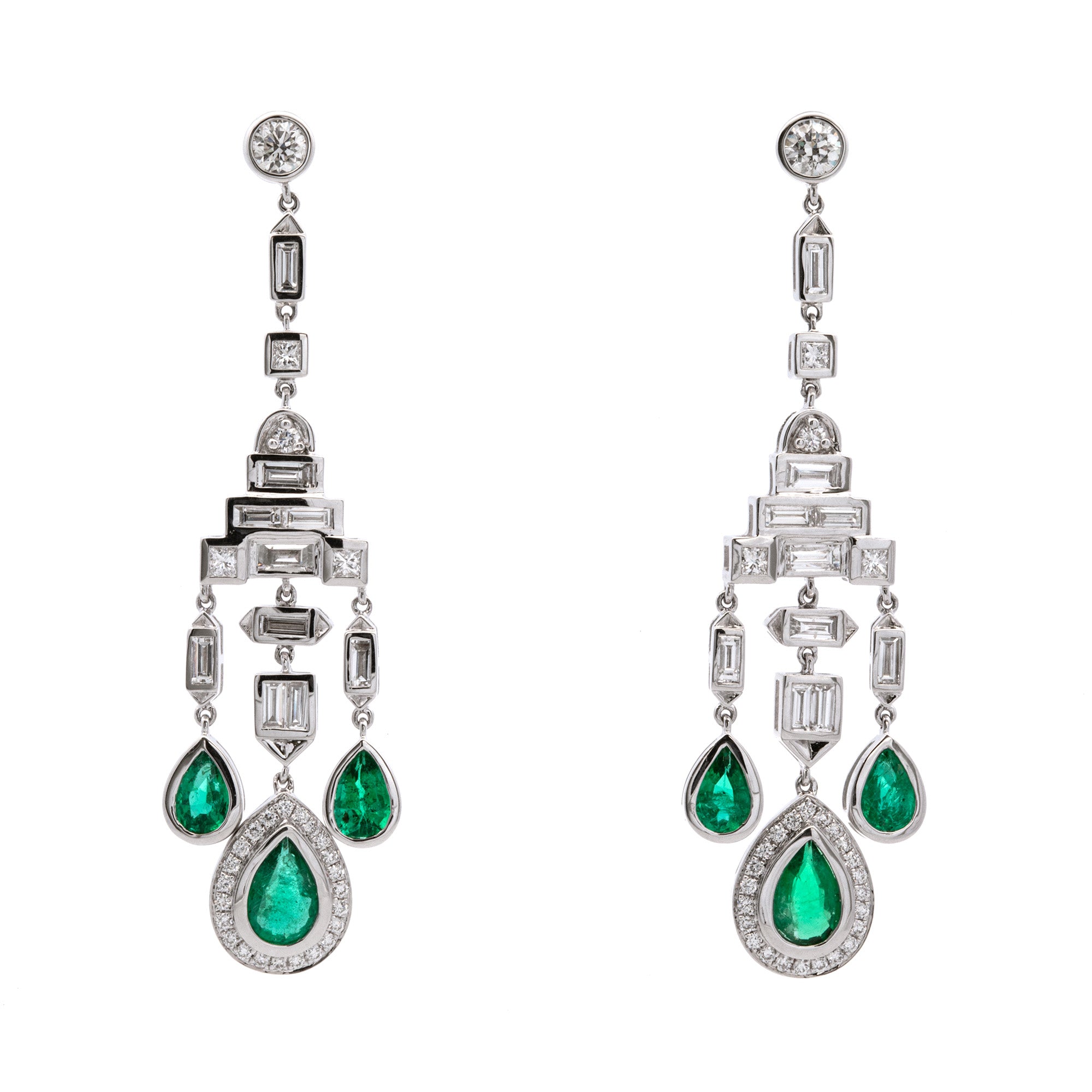 18K White Gold Pear Shape Emerald And Diamond Drop Earrings