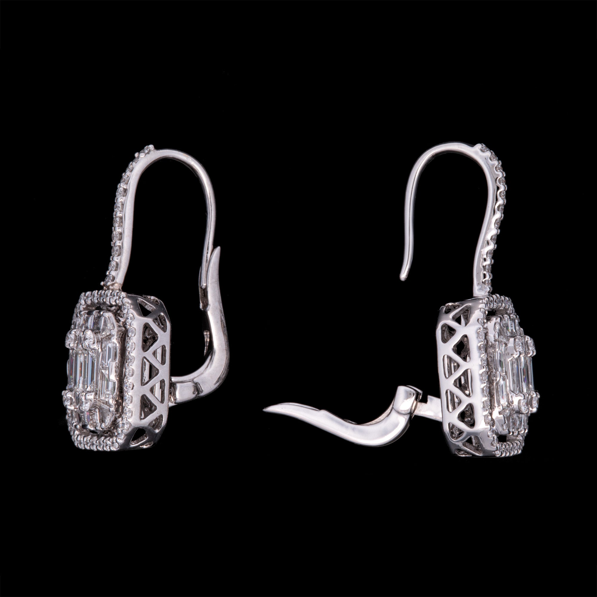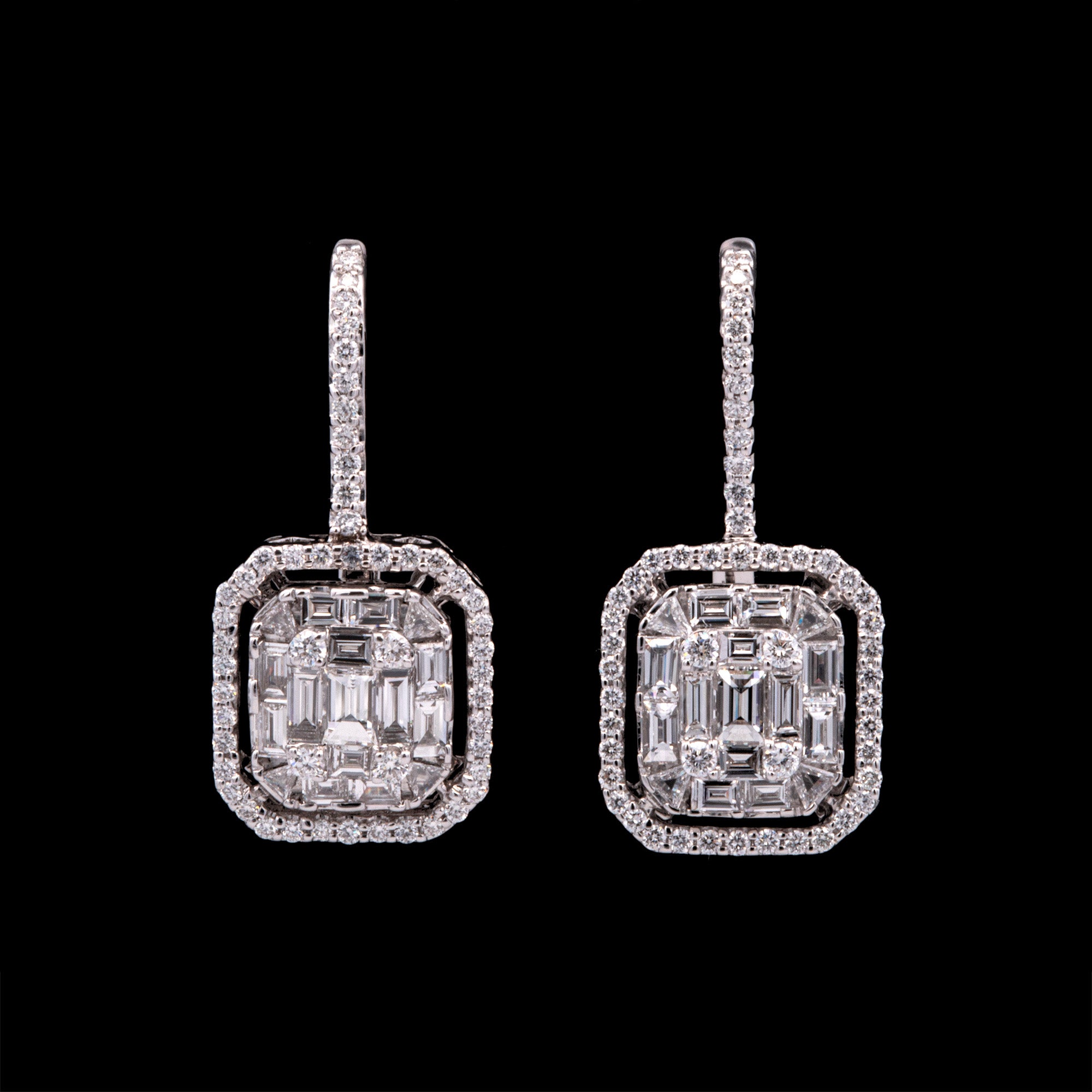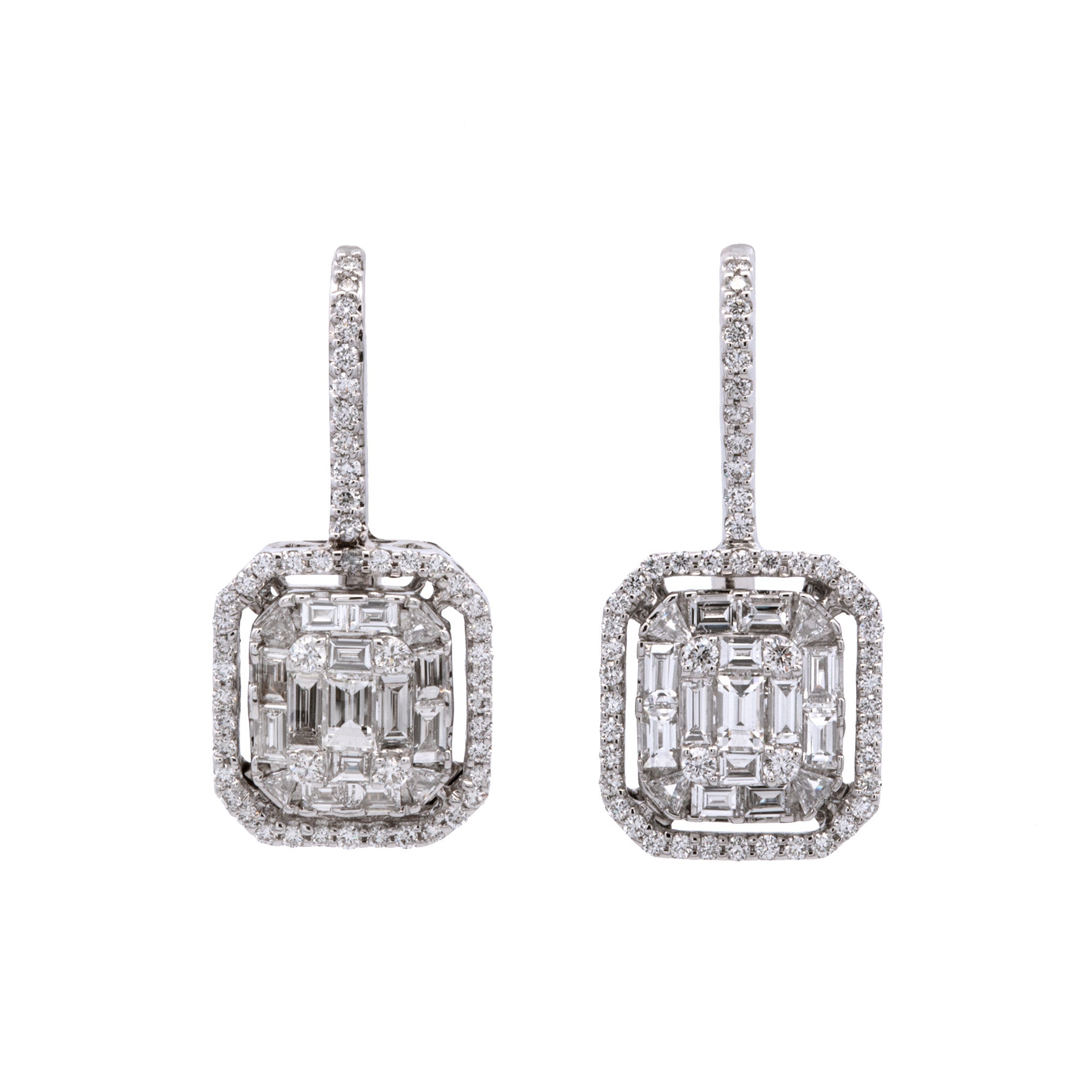 18K White Gold Round And Baguette Drop Earrings. Diamonds Weigh A Total Of 1.88 Carats And Have G-H Color, VS Clarity.