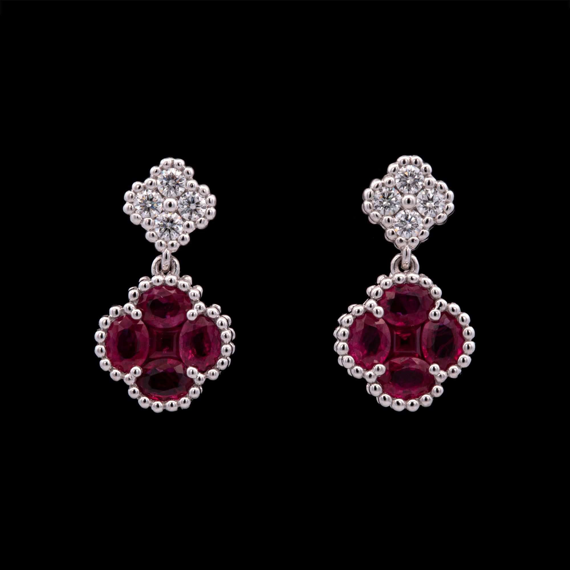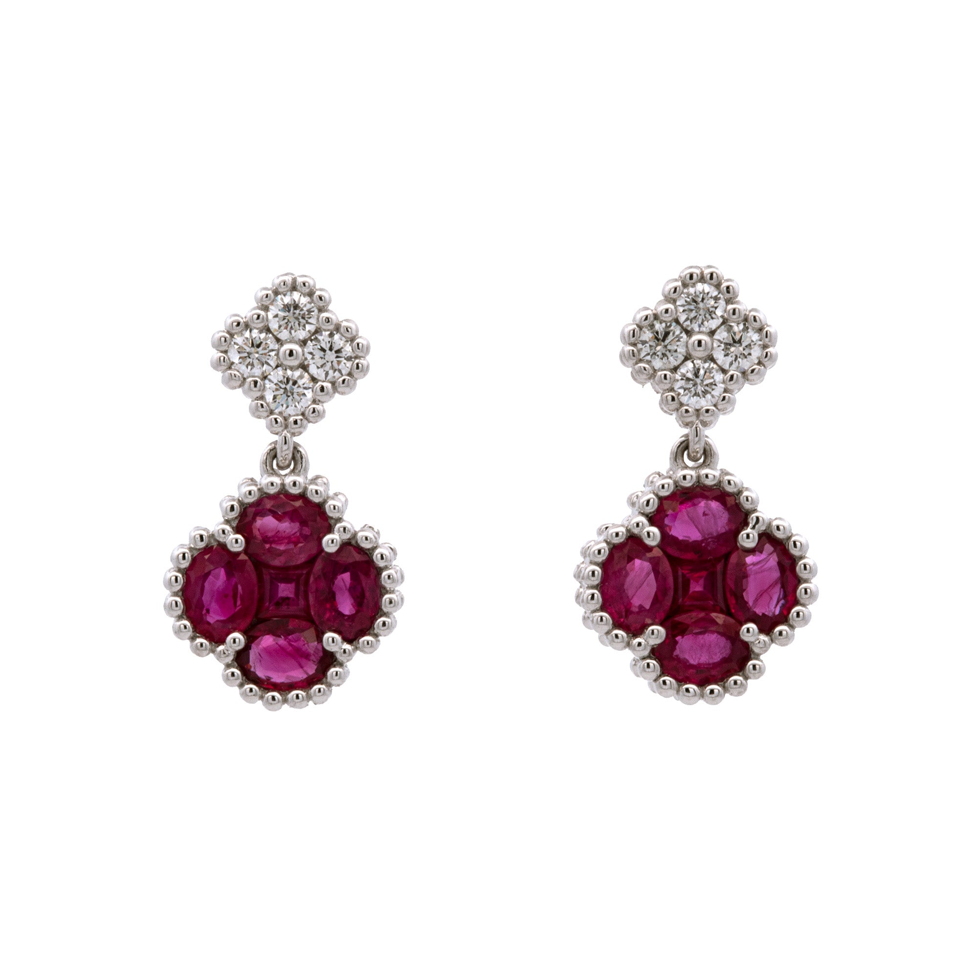 18K White Gold Ruby And Diamond Clover Earrings. Ten Rubies Weigh A Total Of 2.10 Carats. Eight Round Diamonds Weigh A Total Of 0.32 Carats And Have G-H Color, VS2 Clarity.