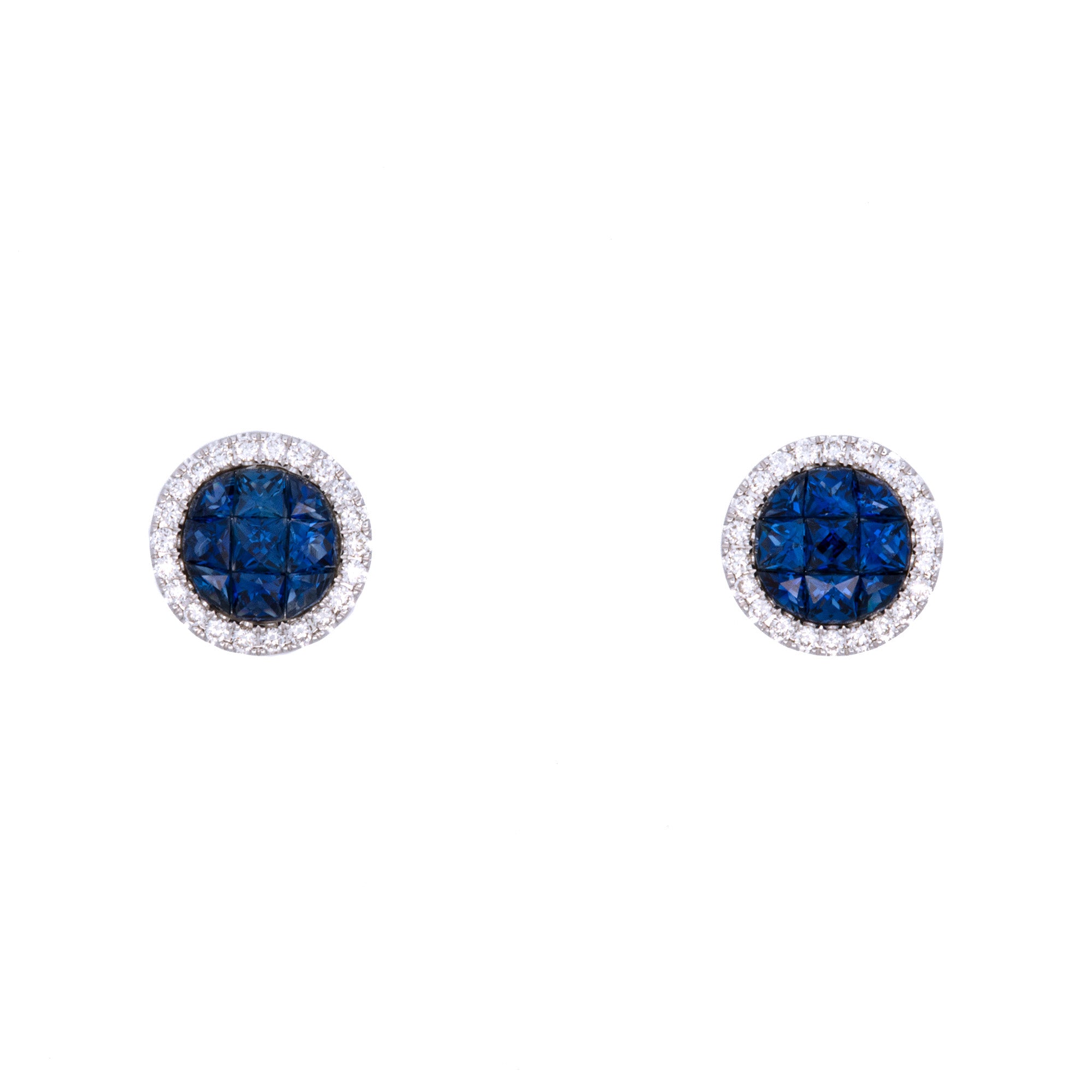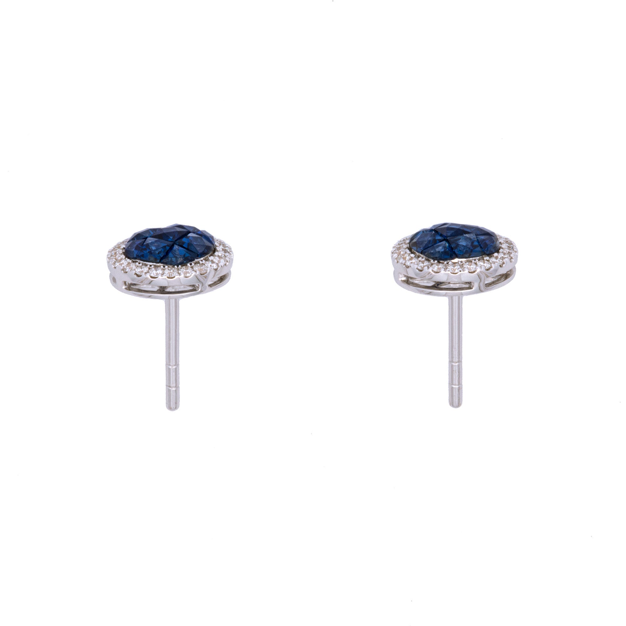 18K White Gold Sapphire And Diamond Stud Earring With Friction Backs. Eighteen French Cut Sapphires Weigh A Total Of 1.80 Carats. Forty Round Diamonds Weigh A Total Of 0.15 Carats And Have G-H Color, VS2-SI1 Clarity.
