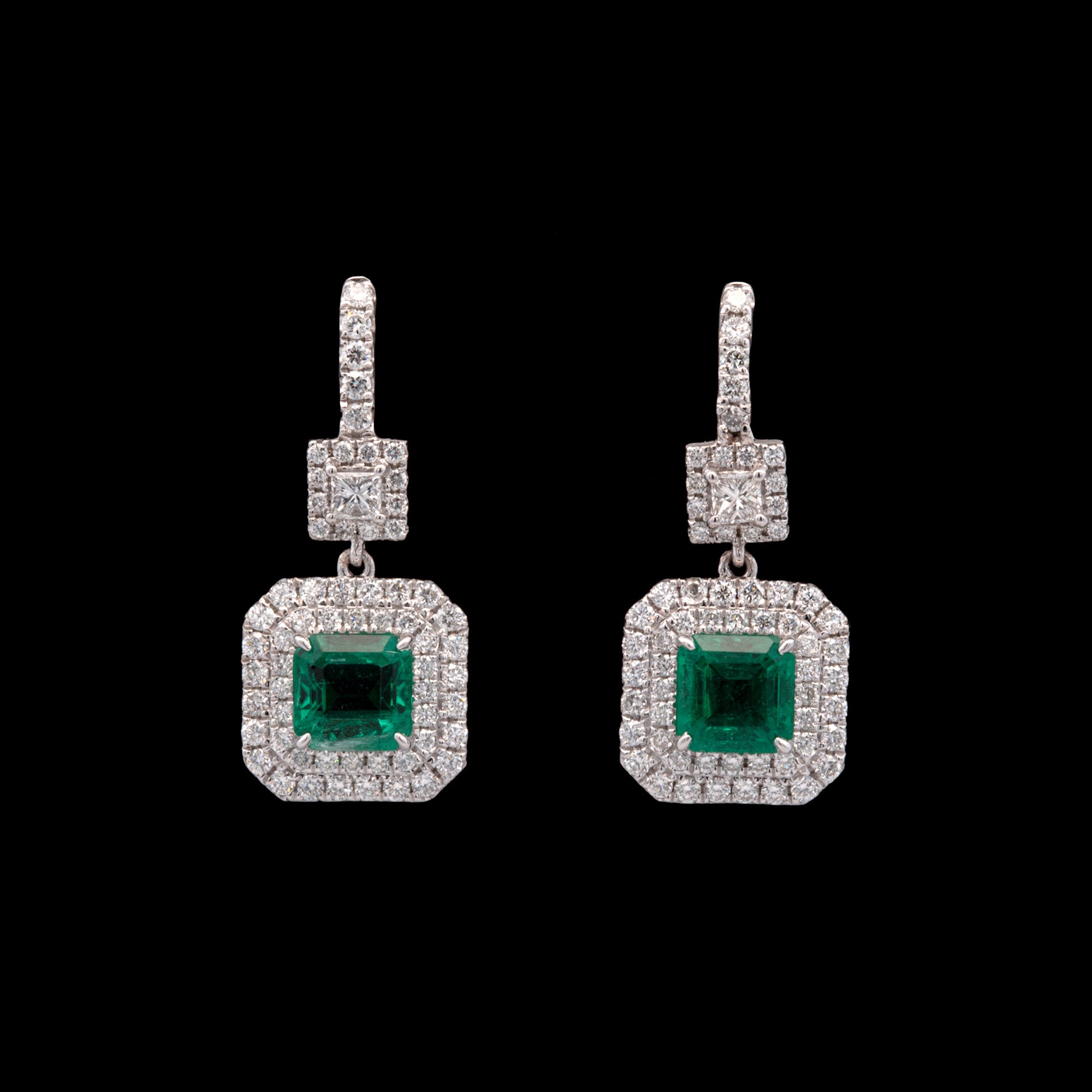 18K White Gold Square Cut Emerald And Double Diamond Halo Drop Earrings