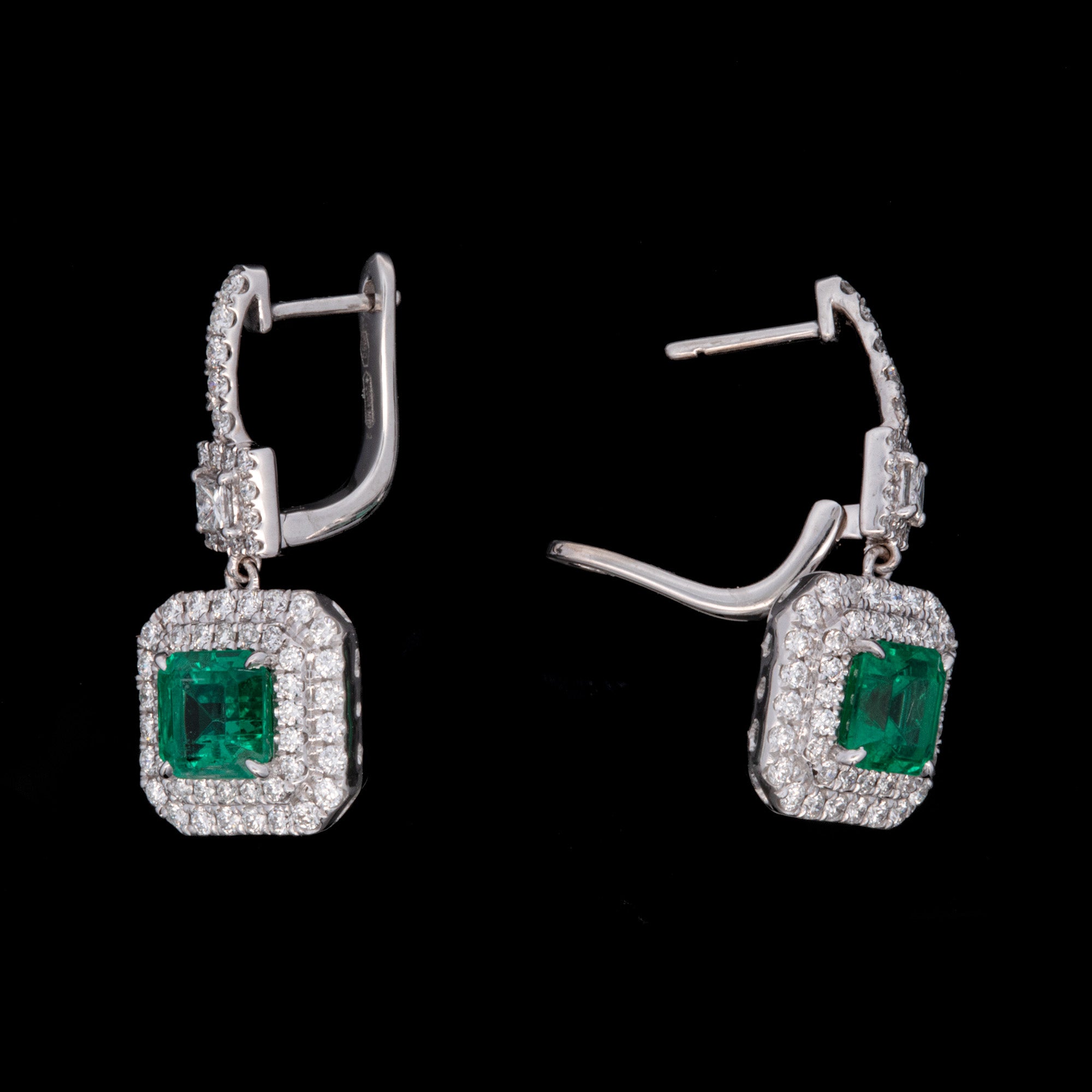 18K White Gold Square Cut Emerald And Double Diamond Halo Drop Earrings. Two Square Cut Emeralds Weigh A Total Of 1.52 Carats. One Hundred Twenty-Four Diamonds Weigh A Total Of 0.86 Carats And Have G-H Color, VS2-SI1 Clarity.