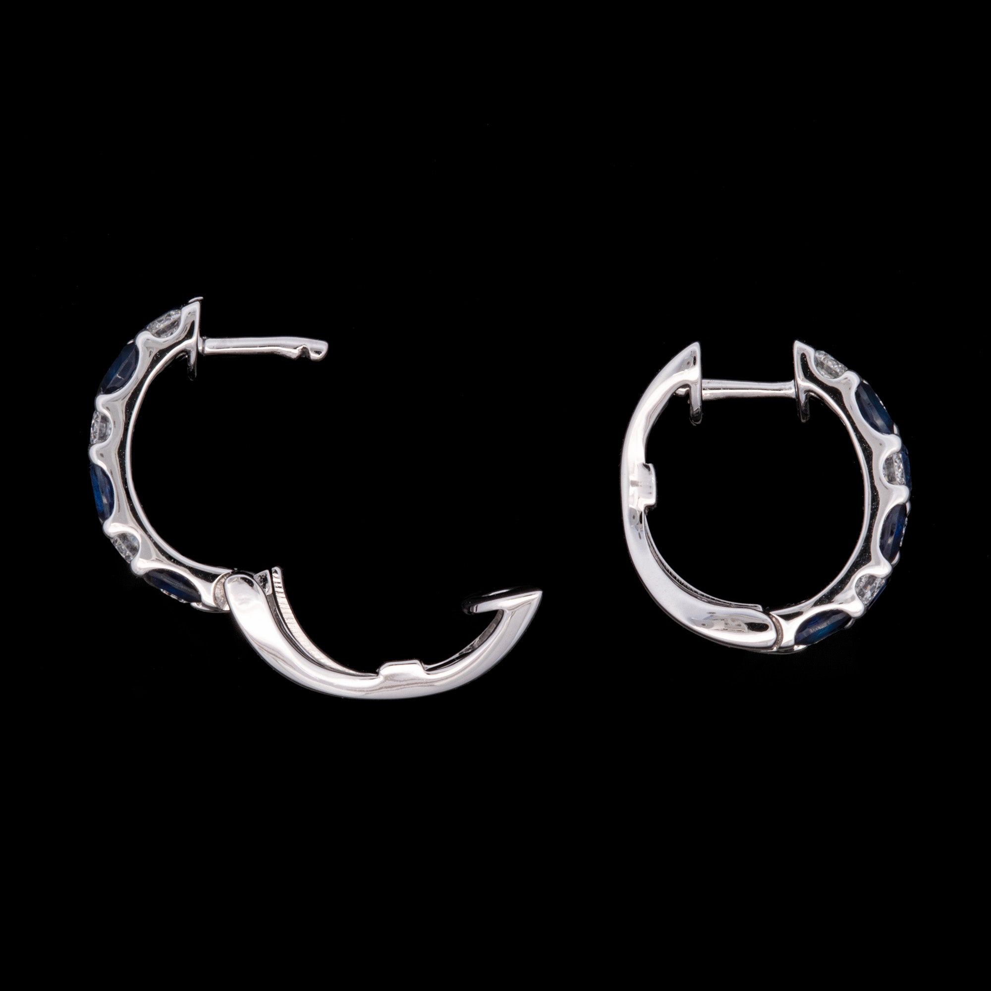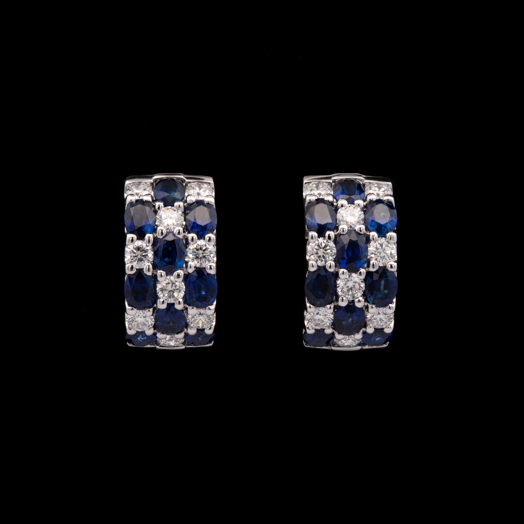 18K White Gold Three Row Sapphire And Diamond Huggie Earrings. Eighteen Sapphires Weigh A Total Of 3.87 Carats. Eighteen Diamonds Weigh A Total Of 1.29 Carats And Have G-H Color, VS2 Clarity.