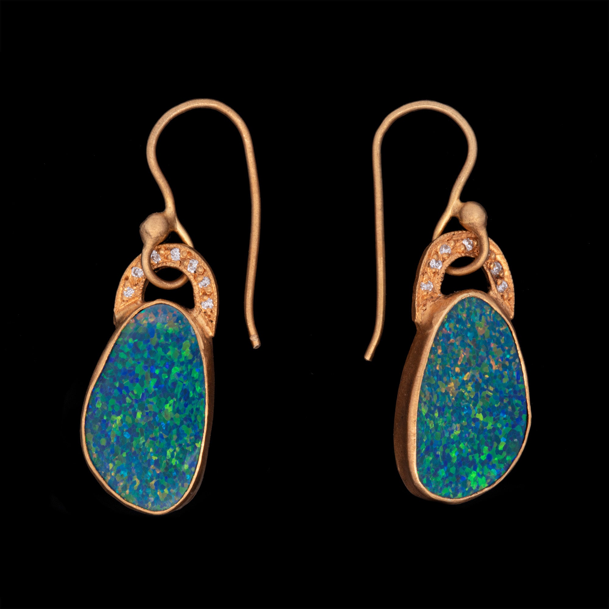 18K And 24K Yellow Gold Opal And Diamond Dangle Earrings. Opals Weigh A Total Of 7.70 Carats. Hand Made In Turkey.