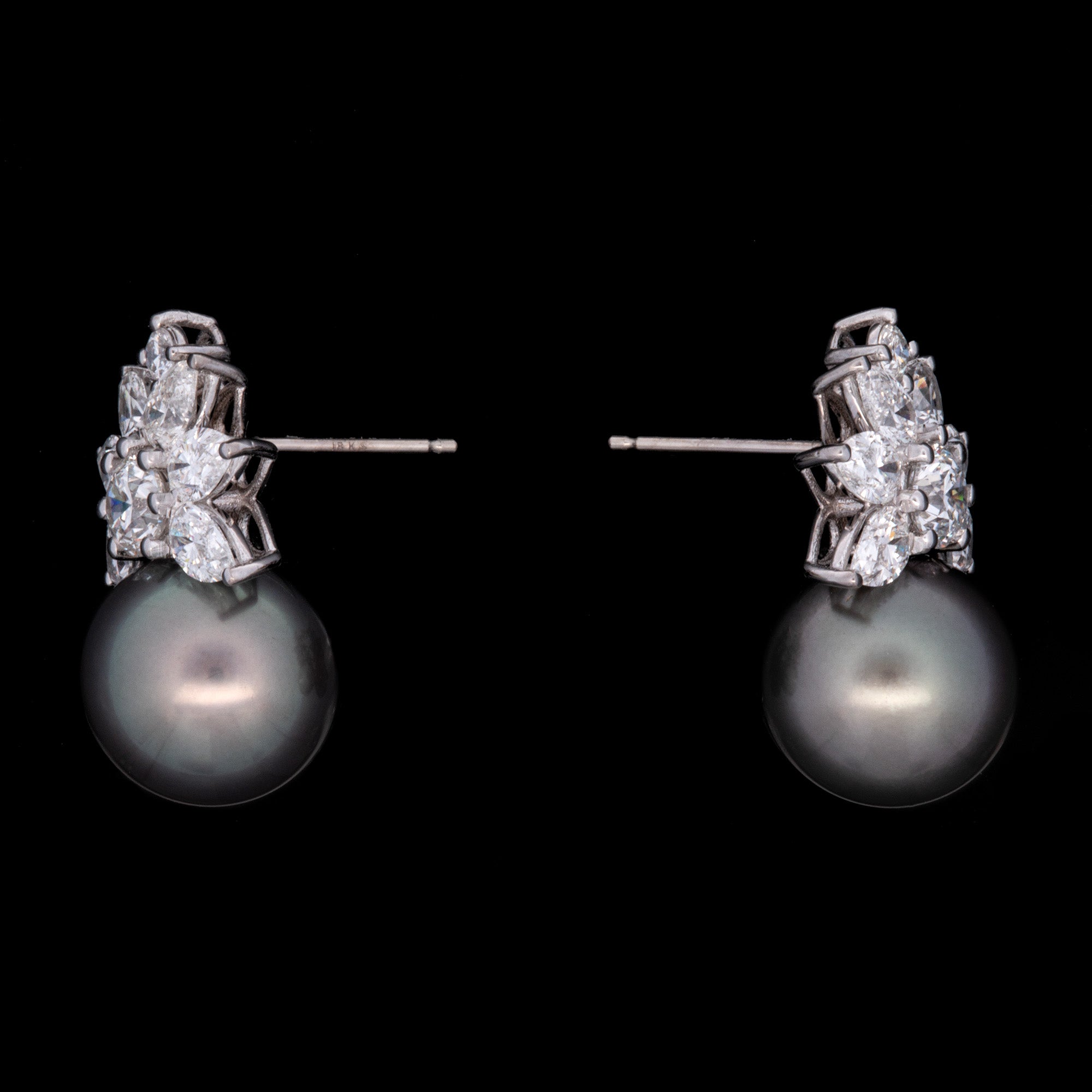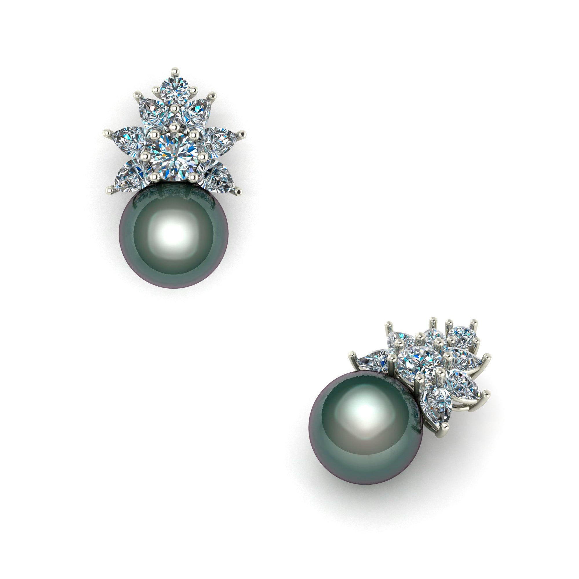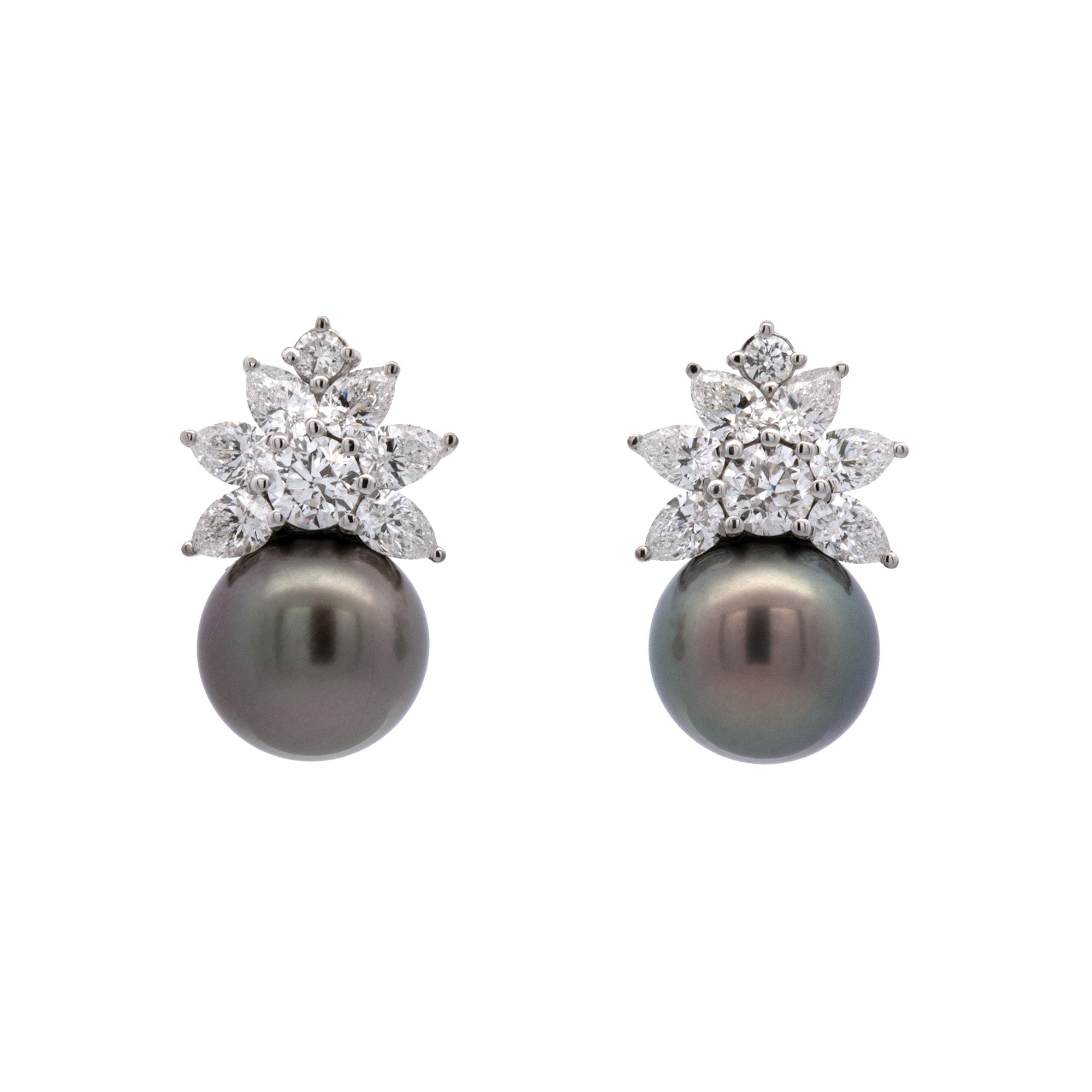 Custom 18K White Gold 11mm Peacock Green Tahitian Pearl And Diamond Cluster Stud Earrings. Twelve Pear shape Diamonds Weigh A Total Of 2.03 Carats And Have F Color, VS1 Clarity. Four Round Diamonds Weigh A Total Of 0.87 Carats And Have F Color, VS1 Clarity.