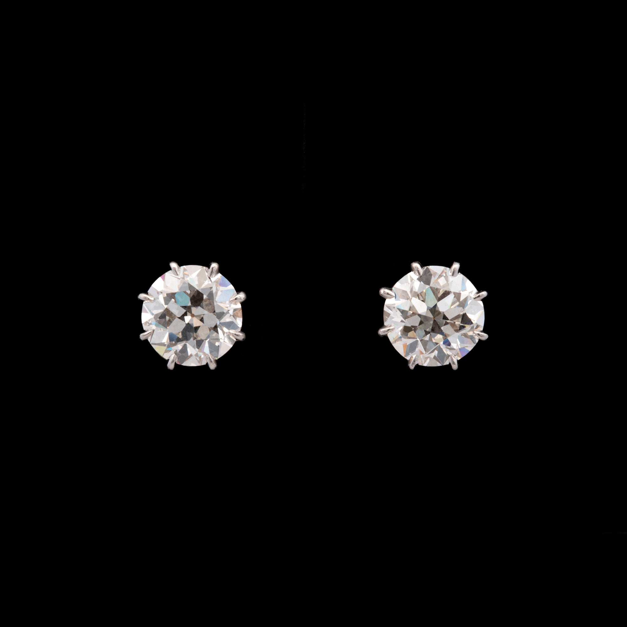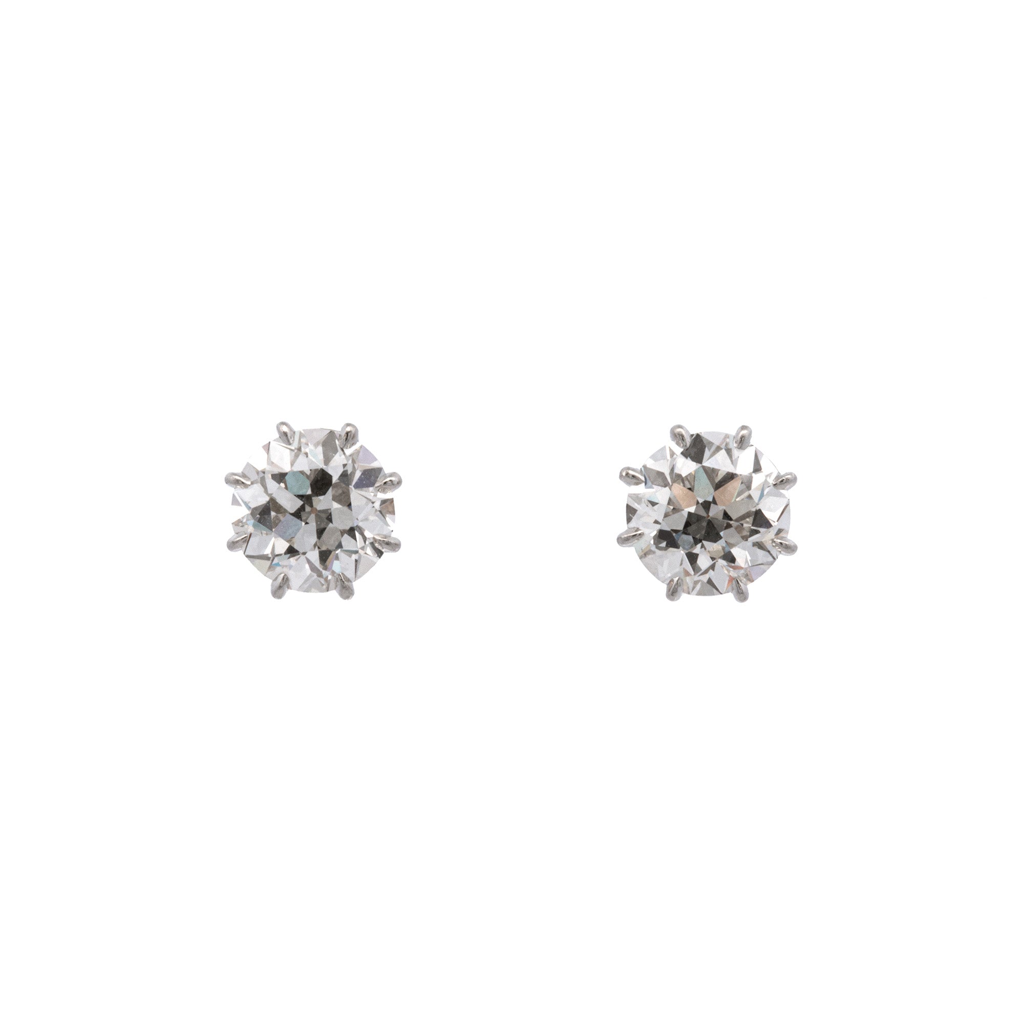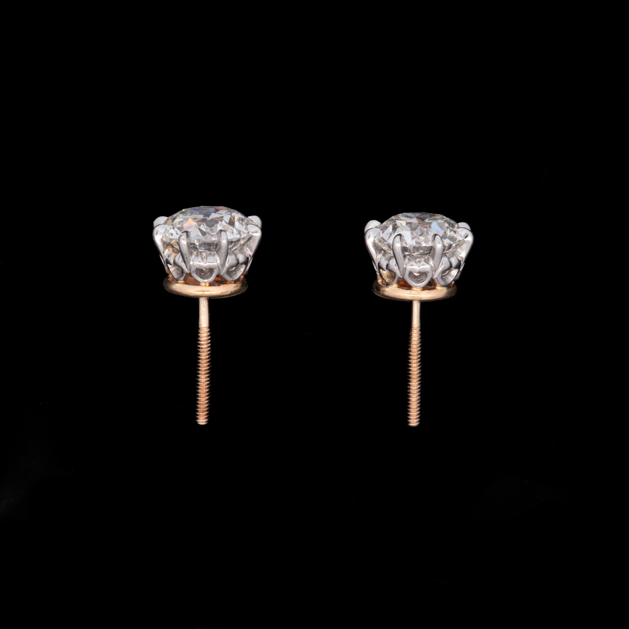 Platinum And 18K Yellow Gold Diamond Filigree Basket Stud Earrings With Screw Backs. Two Old European Cut Diamonds Weigh A Total Of 3.06 Carats And Have J Color, VVS1-VS1 Clarity; GIA Certified.