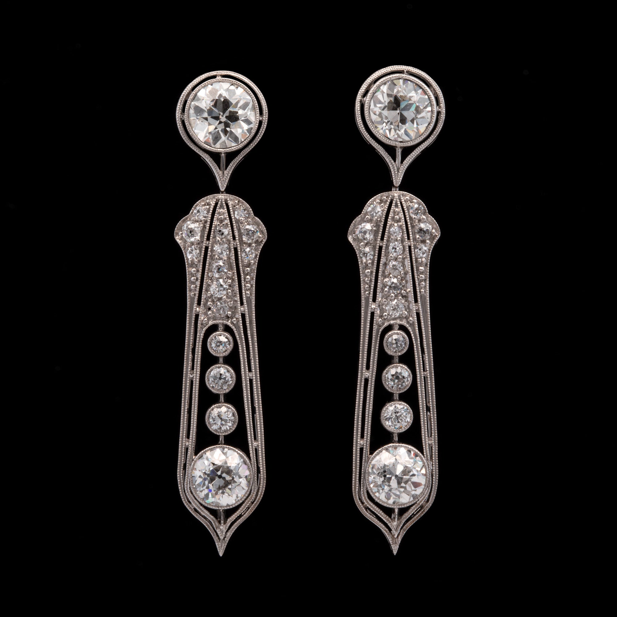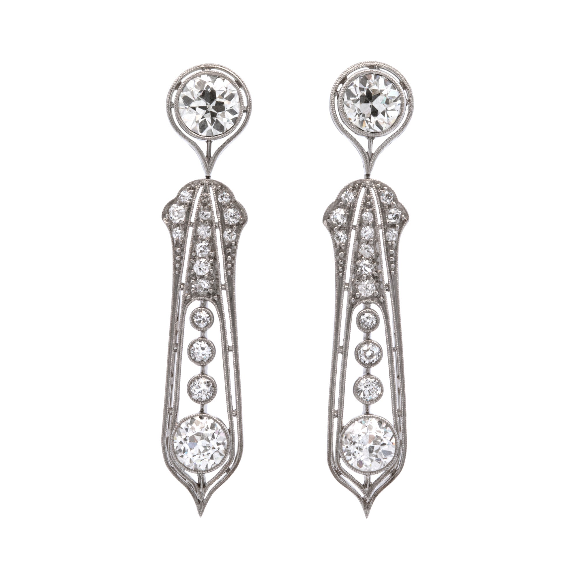 Platinum Art Deco Diamond Tapered Drop Filigree Earrings. Four Old European Cut Diamonds Weigh A Total Of 3.40 Carats. Thirty-Two Diamonds Weigh A Total Of 4.00 Carats.