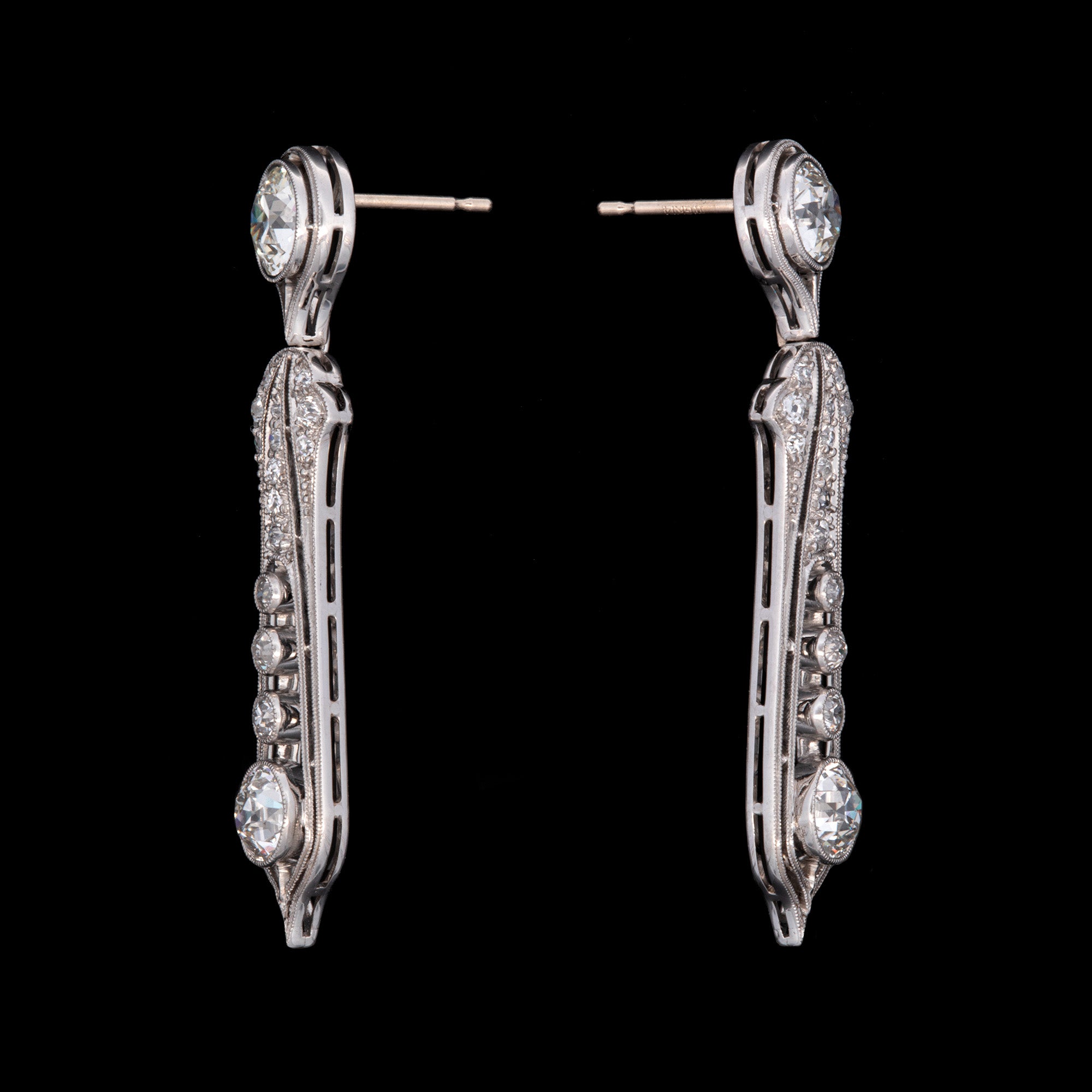 Platinum Art Deco Diamond Tapered Drop Filigree Earrings