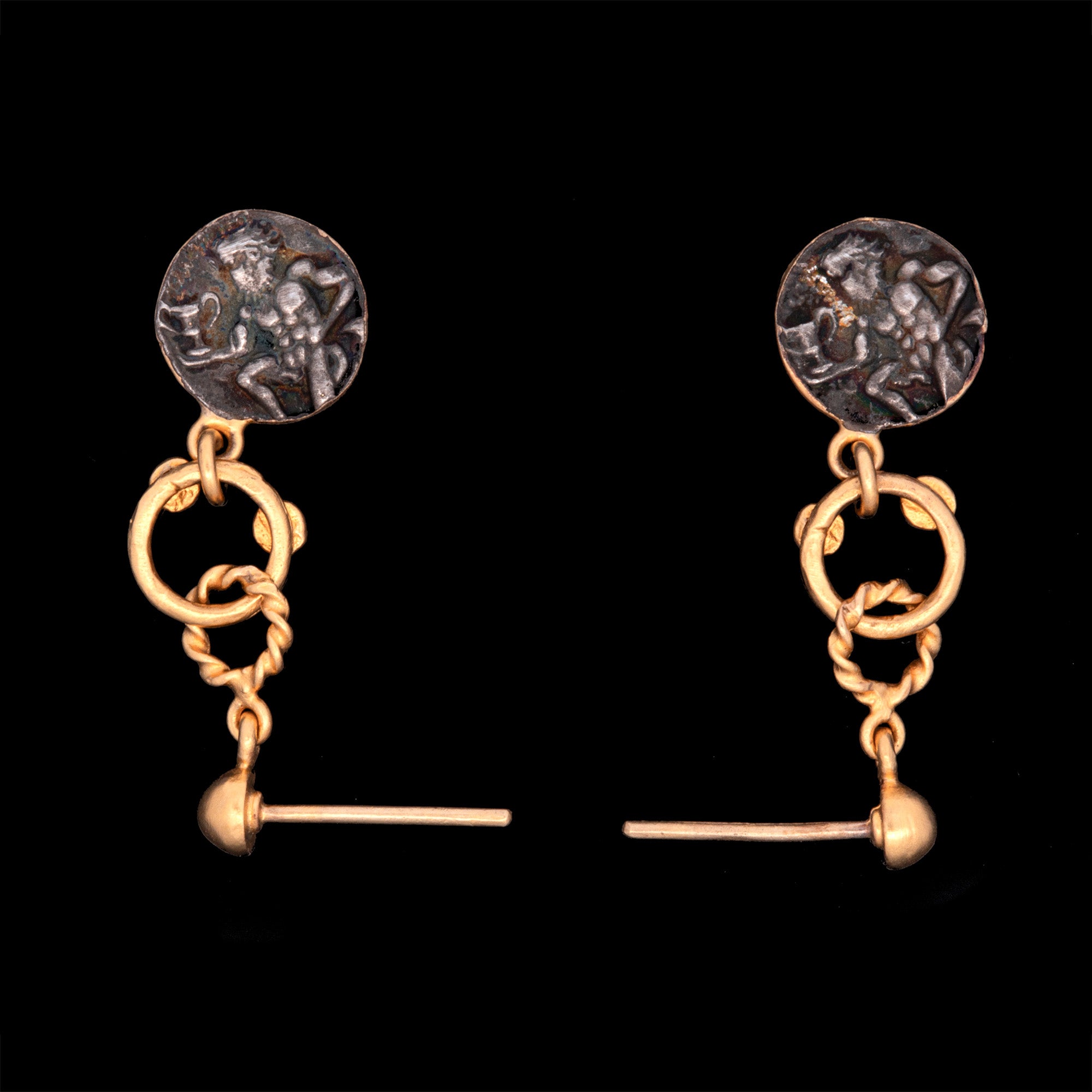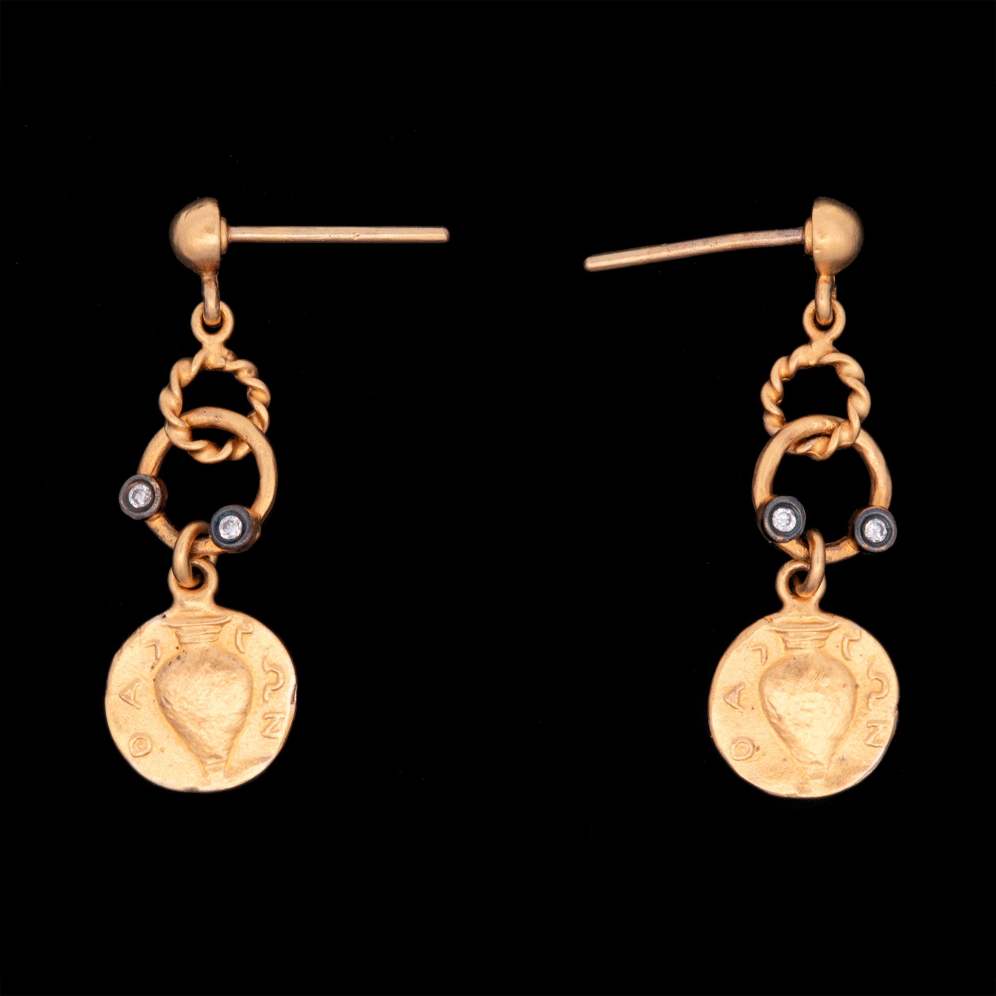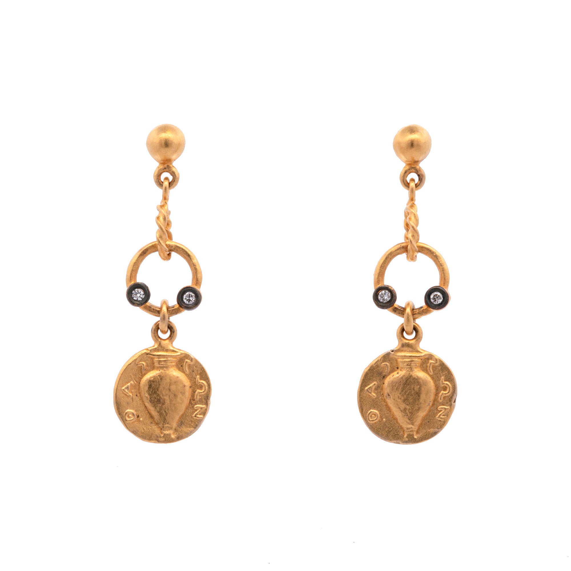 Sterling Silver And 22K Yellow Gold Disk Earrings With Vase Engraving And Diamonds