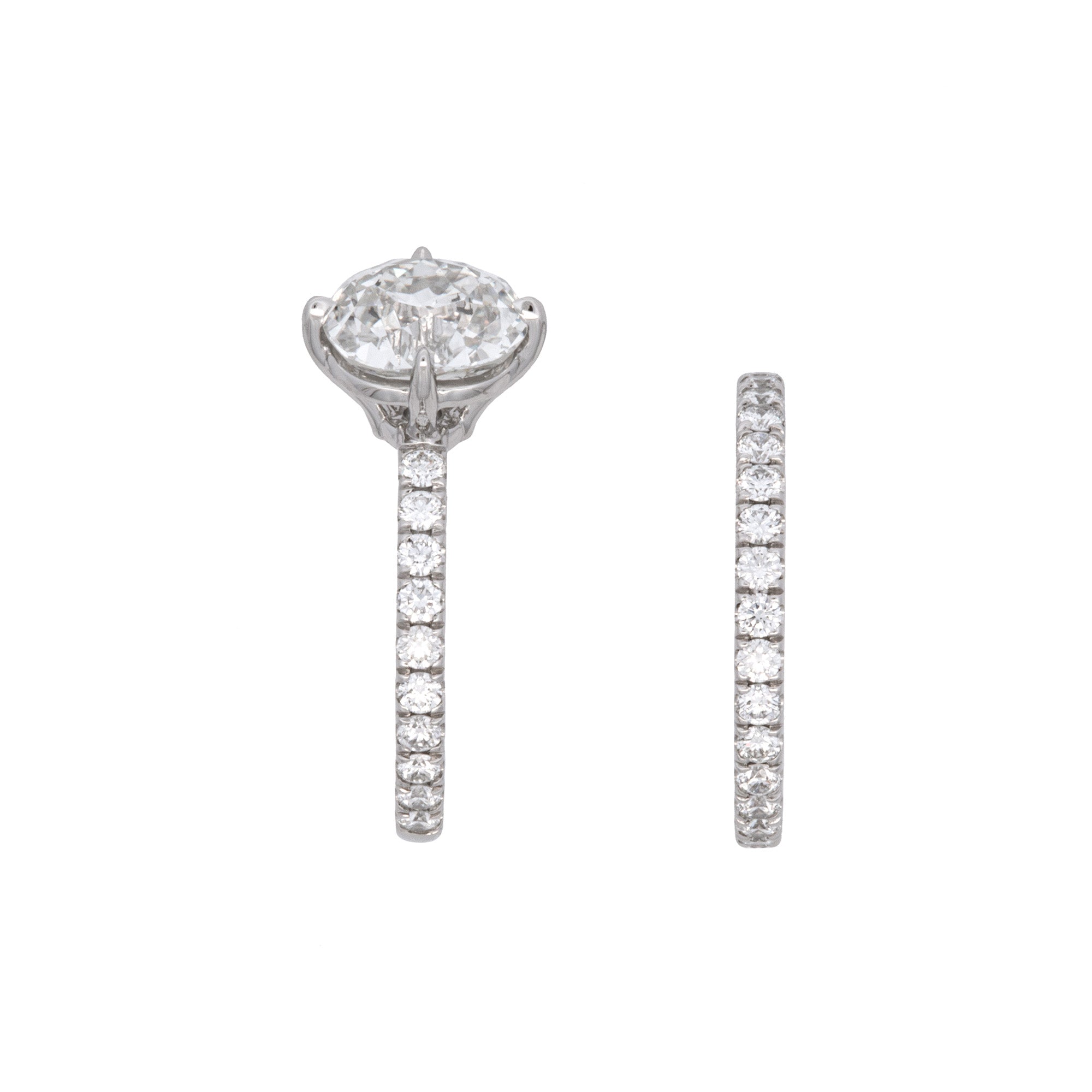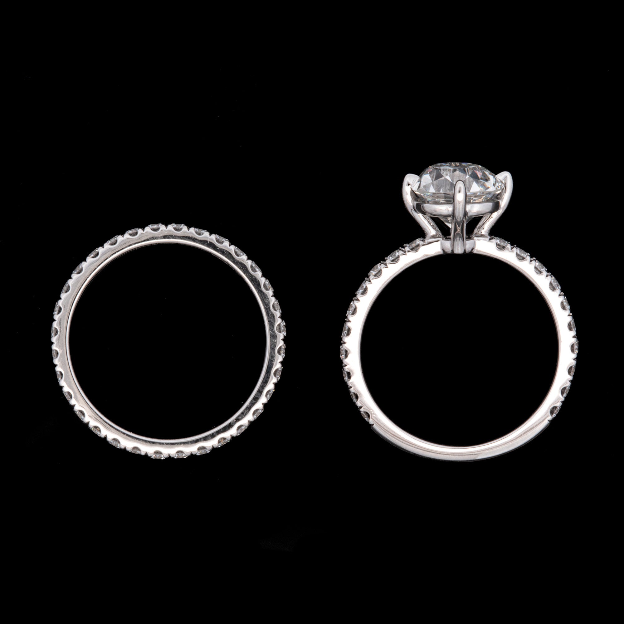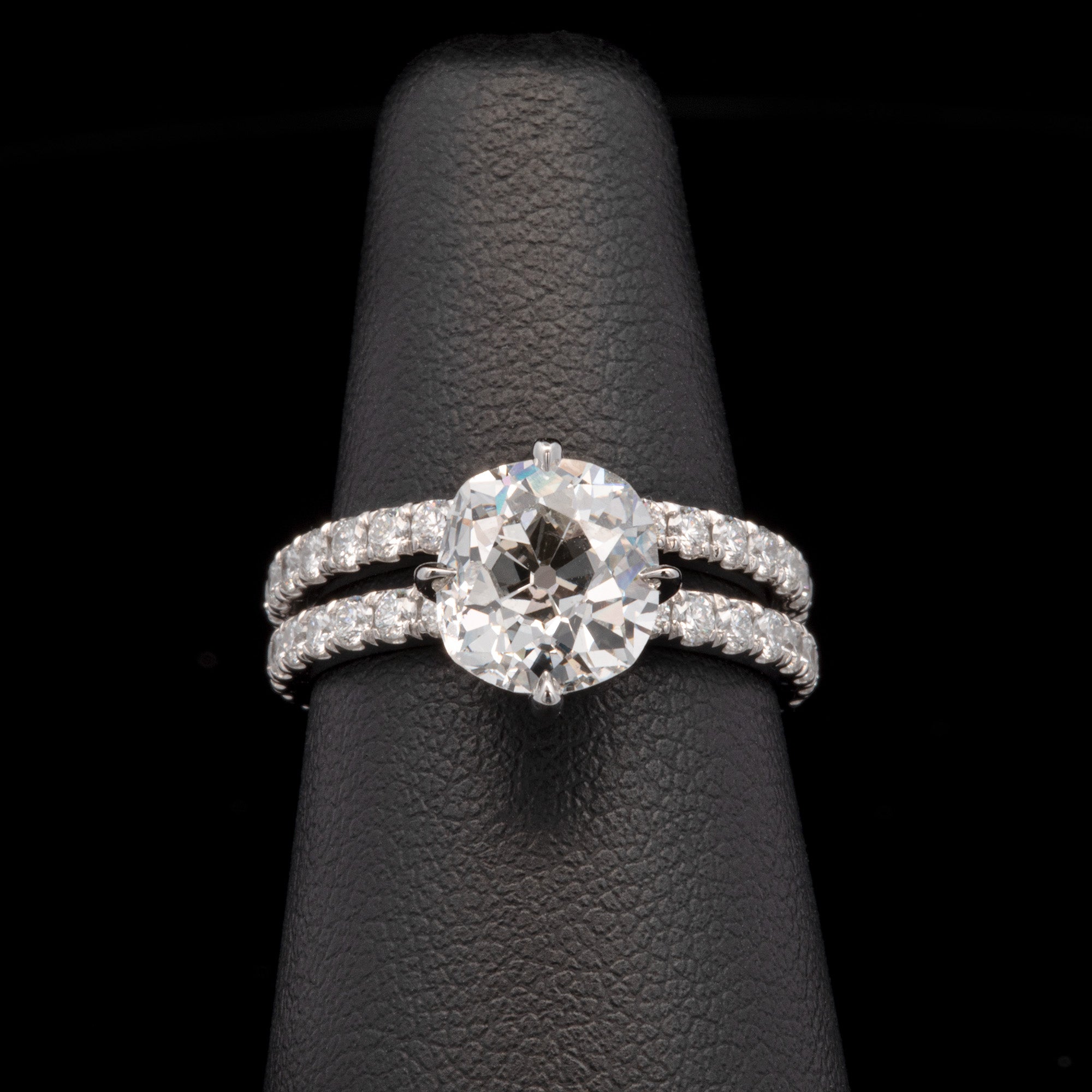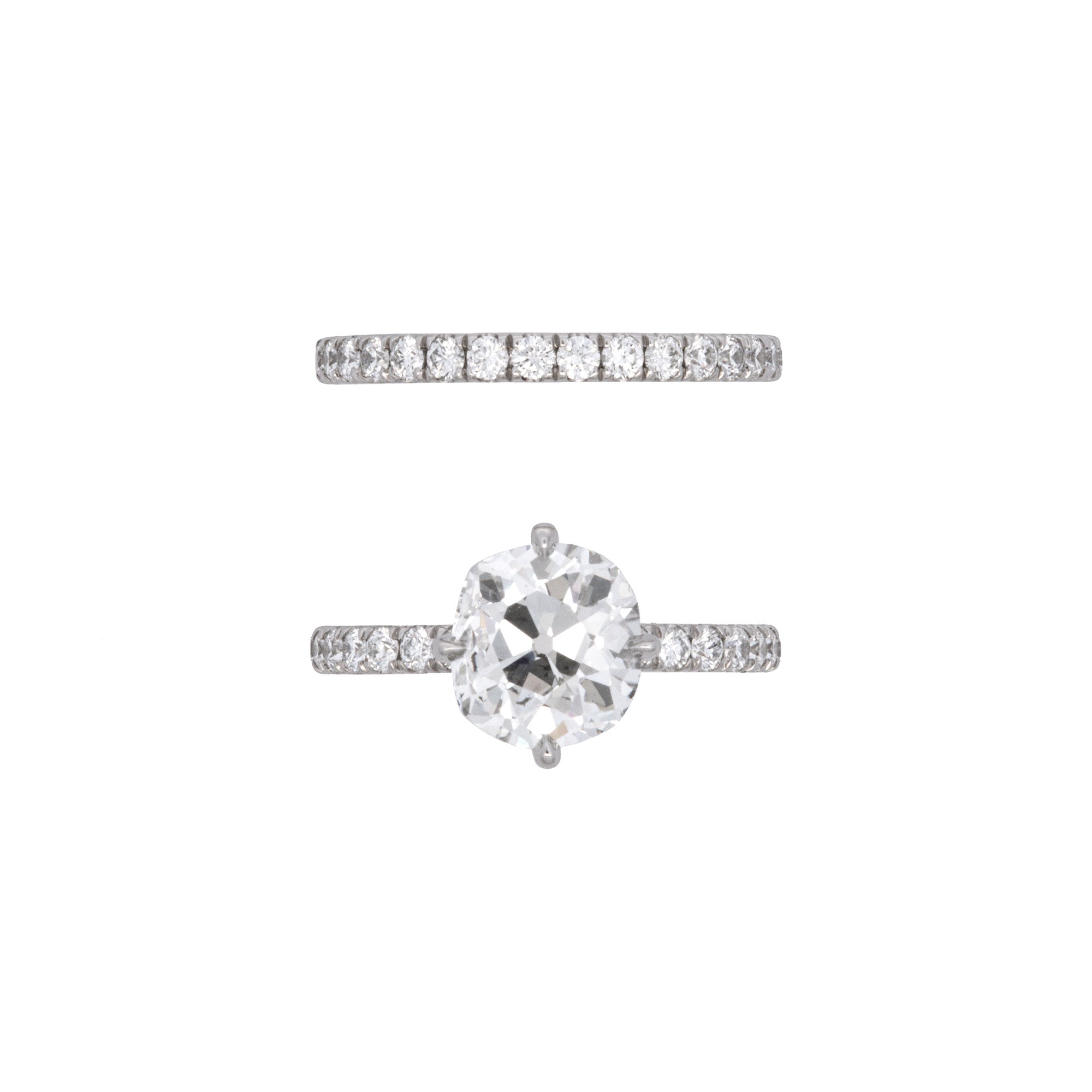 Custom Platinum Compass Set Old Mine Cut Diamond Engagement Ring With Matching Diamond Eternity Band. Center Old Mine Cut Diamond Weighs 2.27 Carats And Has H Color, VS1 Clarity. Round Brilliant Cut Accent Diamonds In Engagement Ring And Eternity Band Weigh A Total Of 1.13 Carats And Have H Color, VS1 Clarity.