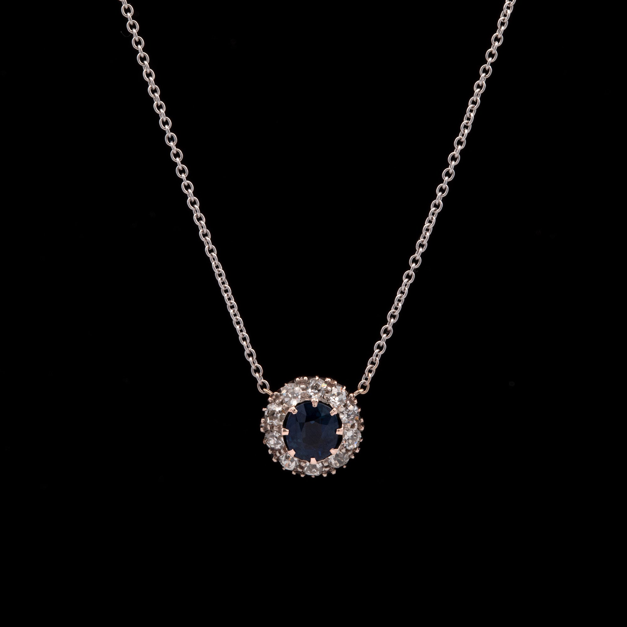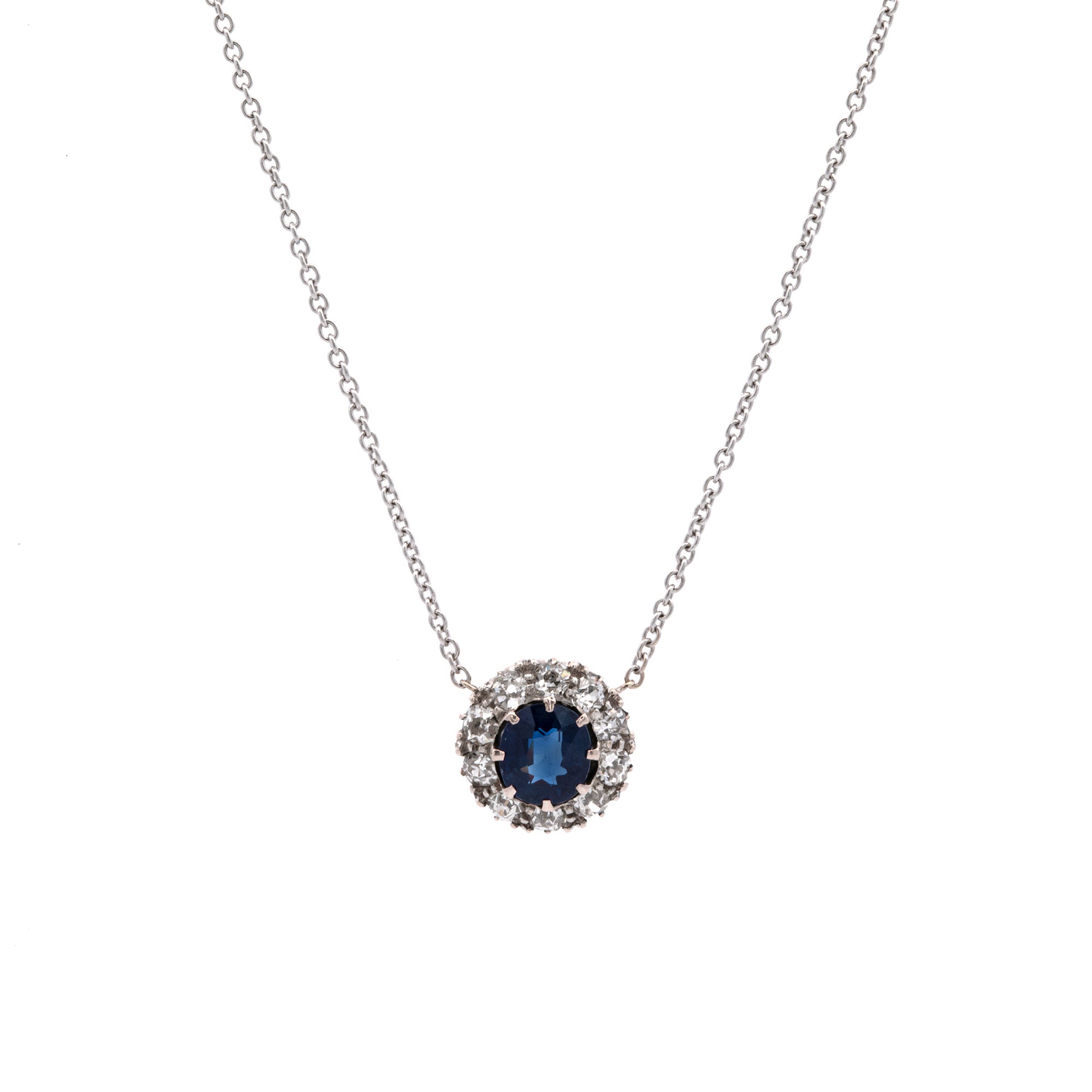 14K White Gold "Pailin No Heat" Blue Sapphire And Diamond Halo Necklace. Pailin Sapphire Weighs 0.85 Cartas; AGL Certified. Diamonds Weigh A Total Of 0.30 Carats.